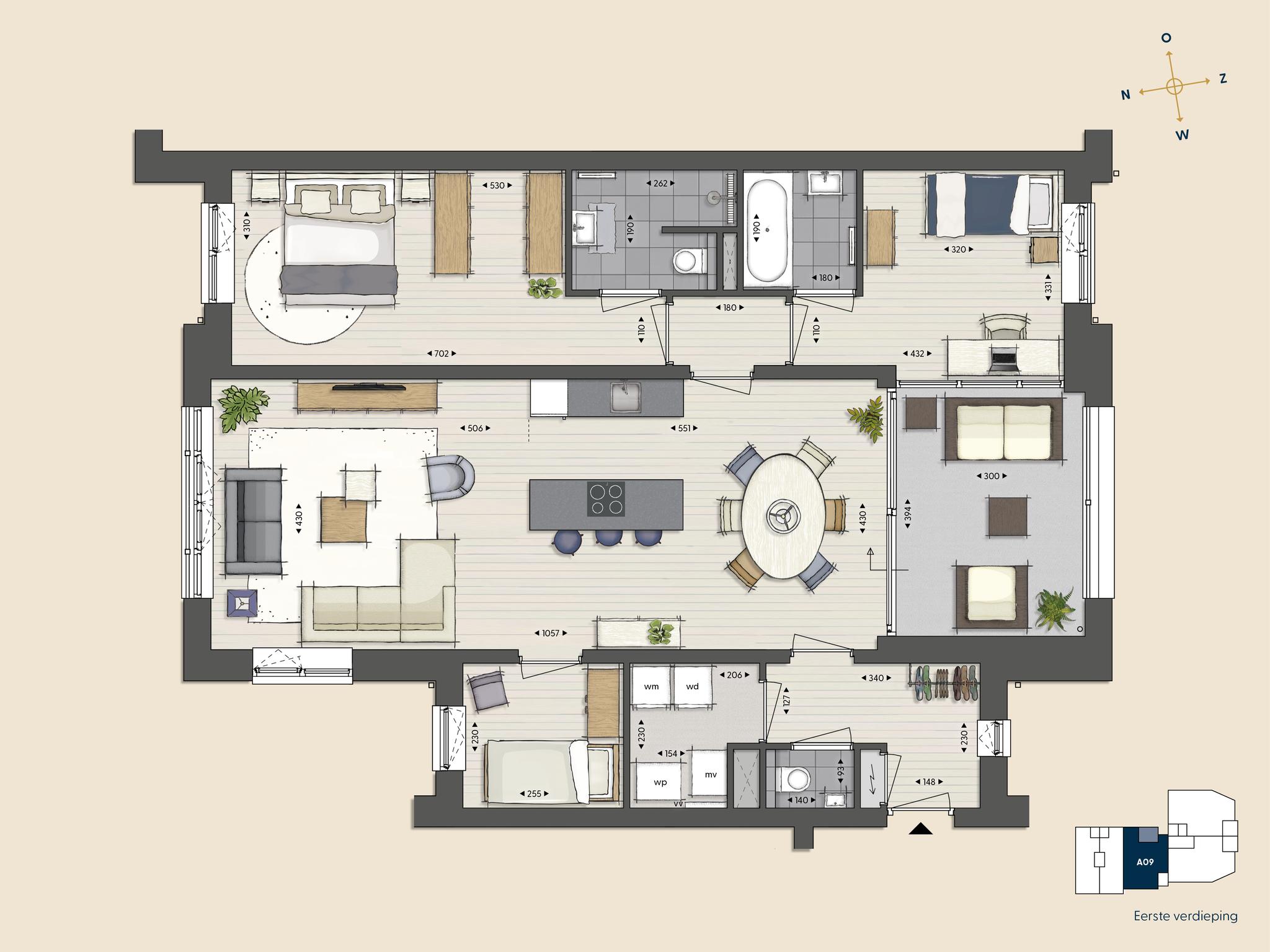 • In de inpandige berging tref je de technische installaties en de opstelplaatsen voor de wasmachine en wasdroger.