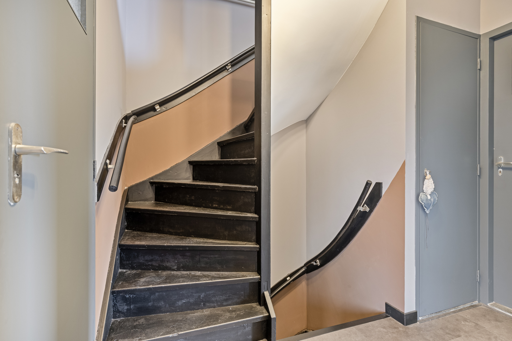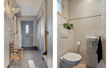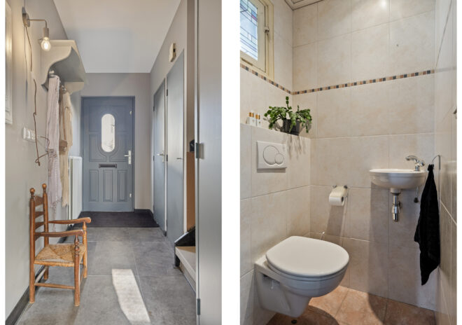 Via de voortuin bereikt u de voordeur en komt u in de entree. Hier bevinden zich de meterkast, een trapkast, het toilet en de trap naar de eerste verdieping.