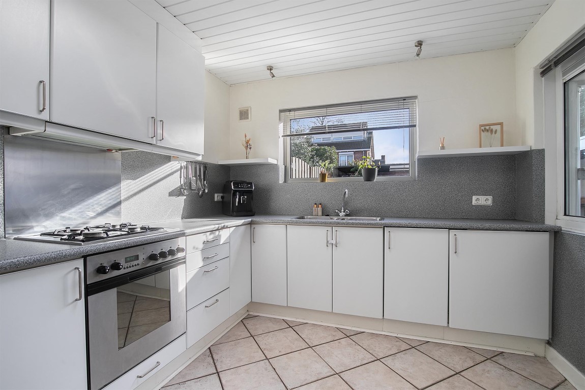 De nette keuken is voorzien van inbouwapparatuur, waaronder een gaskookplaat, afzuigkap, vaatwasser, koelkast en oven. Vanuit hier is tevens de achtertuin te betreden.
