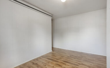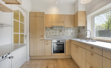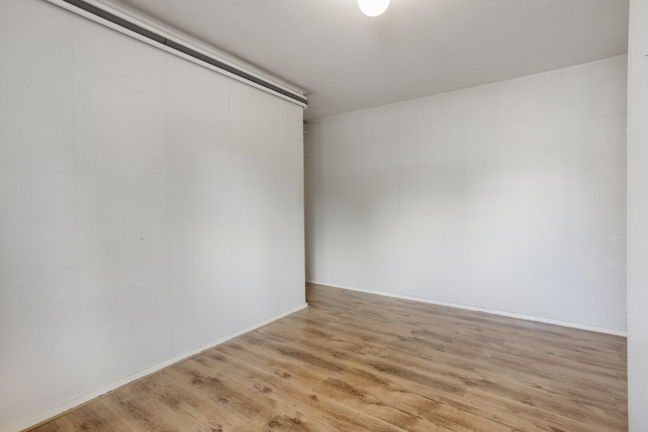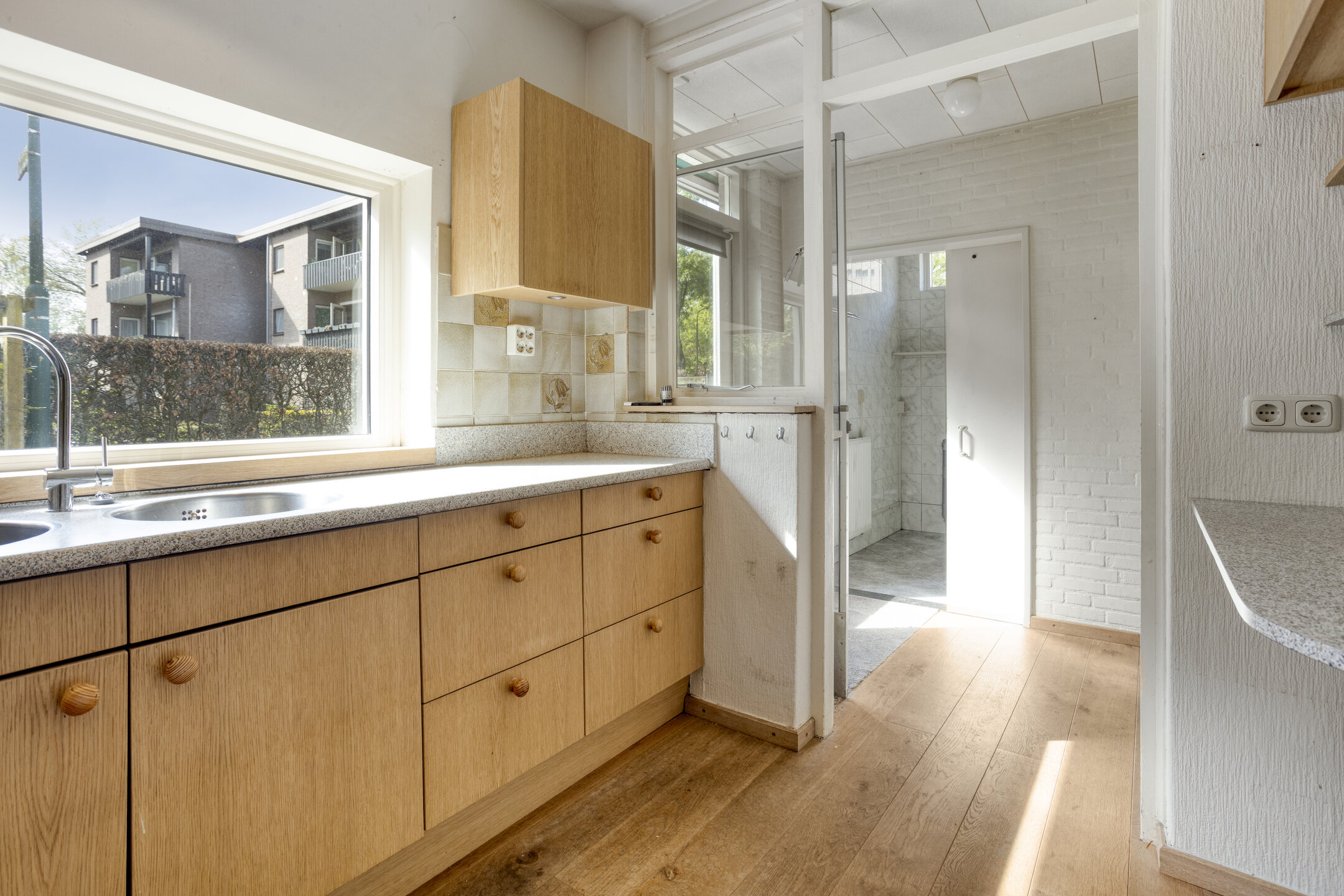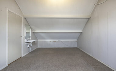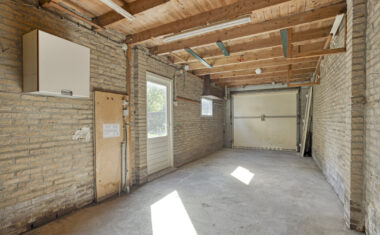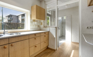 Vanuit de woonkamer bereik je de gesloten keuken. Aansluitend kom je in een praktische gang met toegang tot buiten en de badkamer. De badkamer is uitgerust met een douche, wastafel en aansluiting voor de wasmachine.