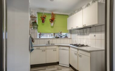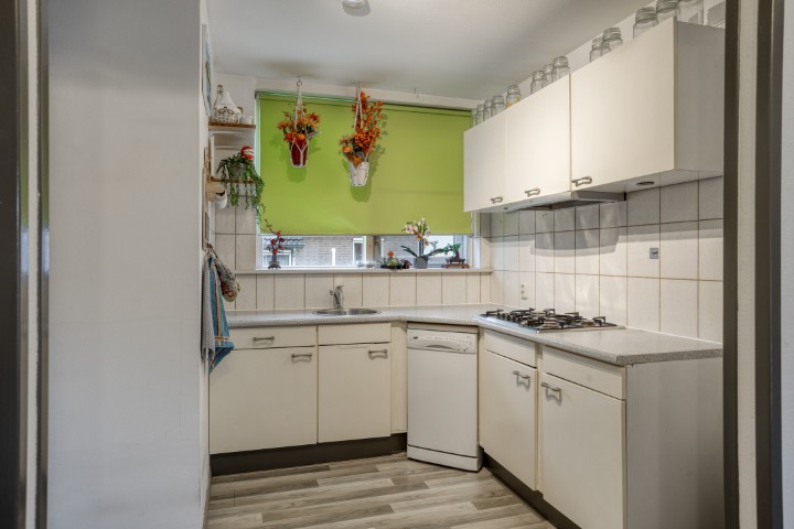 Bij binnenkomst tref je de entree met toilet, meterkast en garderobe. De lichte woonkamer voelt direct prettig aan dankzij de grote ramen en de fijne indeling. De L-vormige open keuken (2010) is praktisch ingericht en voorzien van een gaskookplaat, afzuigkap en koelkast – ideaal om gezellig te koken terwijl je in contact blijft met de woonkamer.