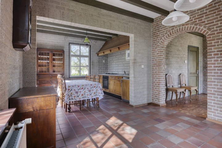 Entree/hal – meterkast – ruime woonkamer met rookkanaal – woonkeuken voorzien van oven, gaskookplaat, koelkast en afzuigkap – achterportaal/bijkeuken met CV-opstelling, wastafel en toegang tot de kelder.
