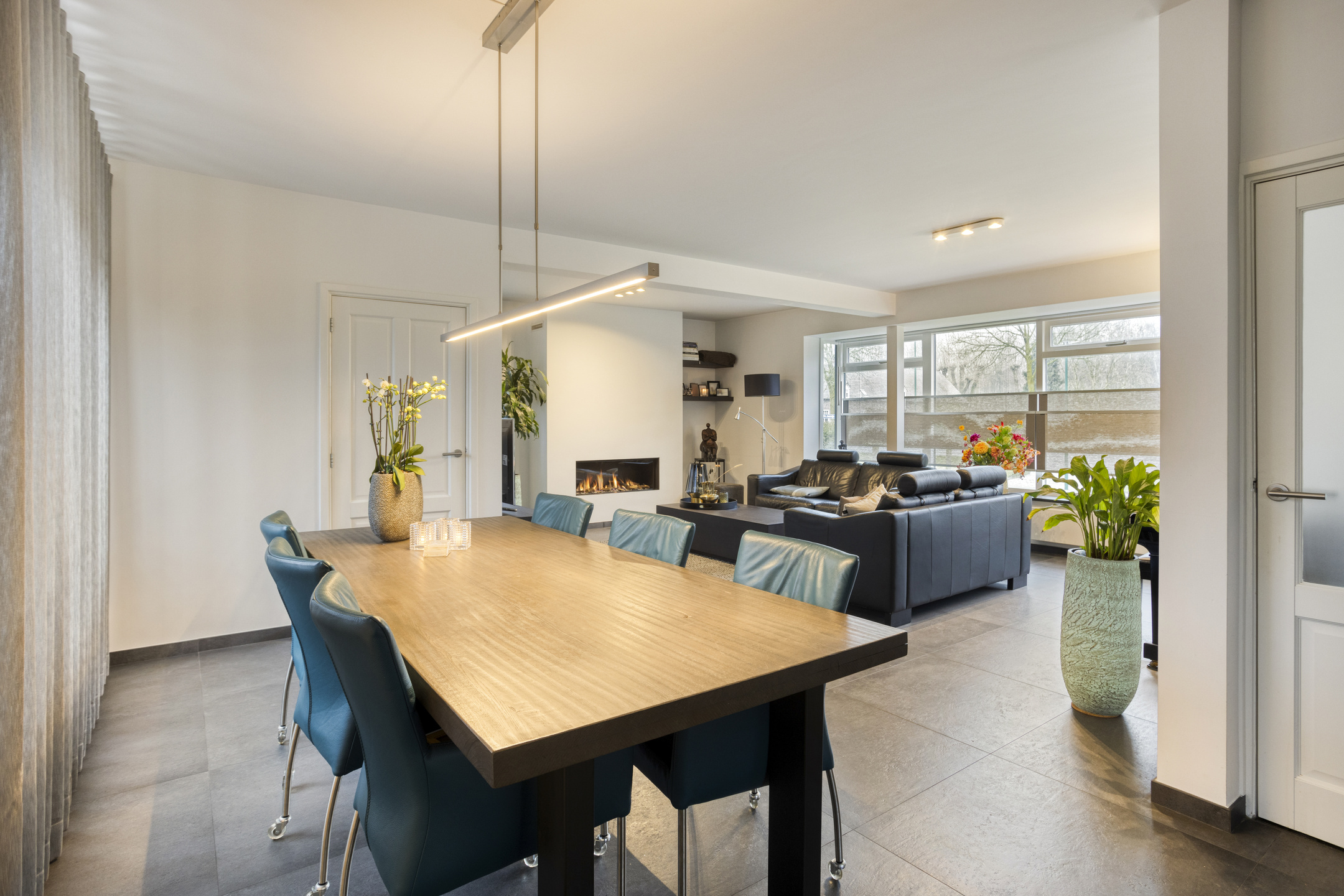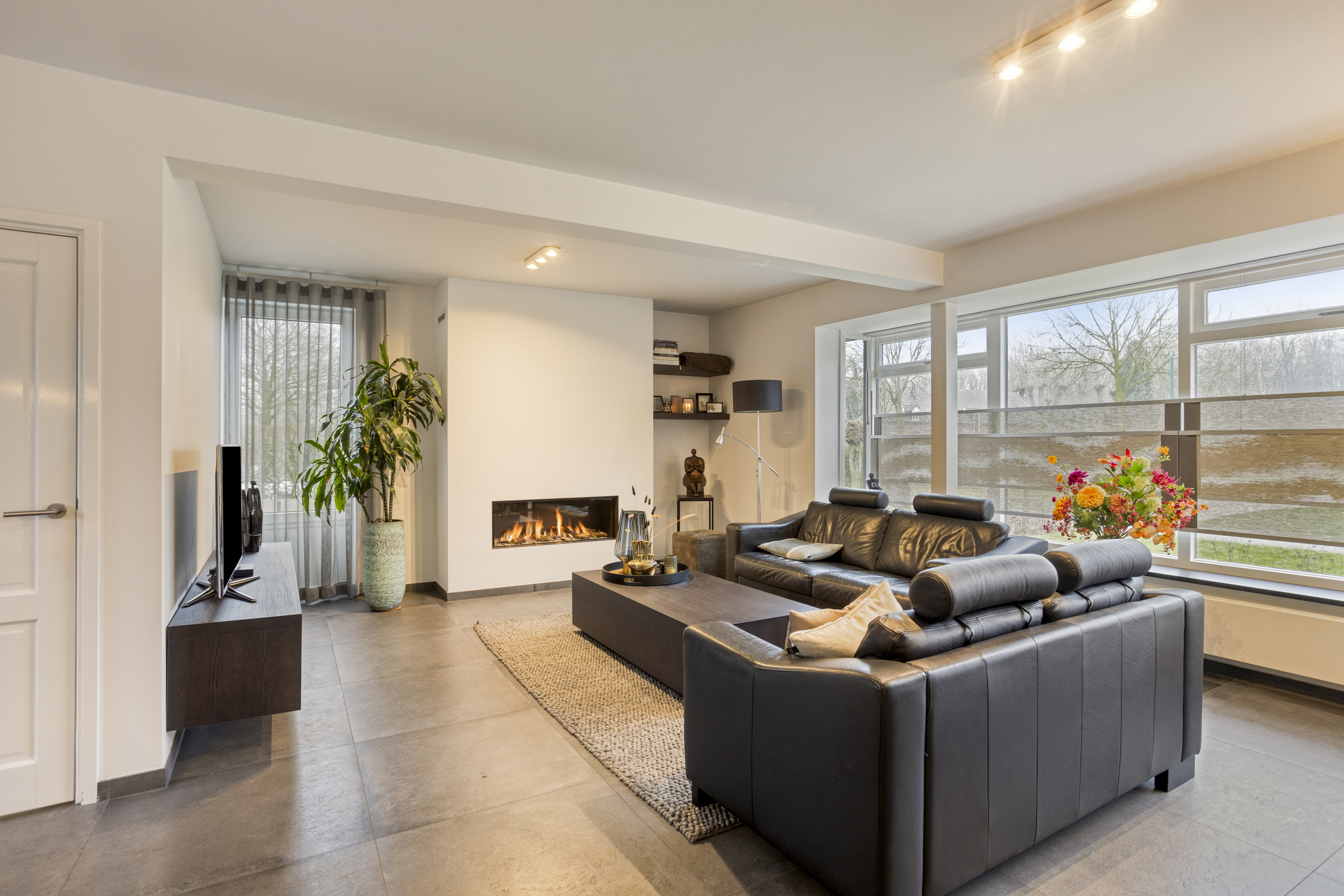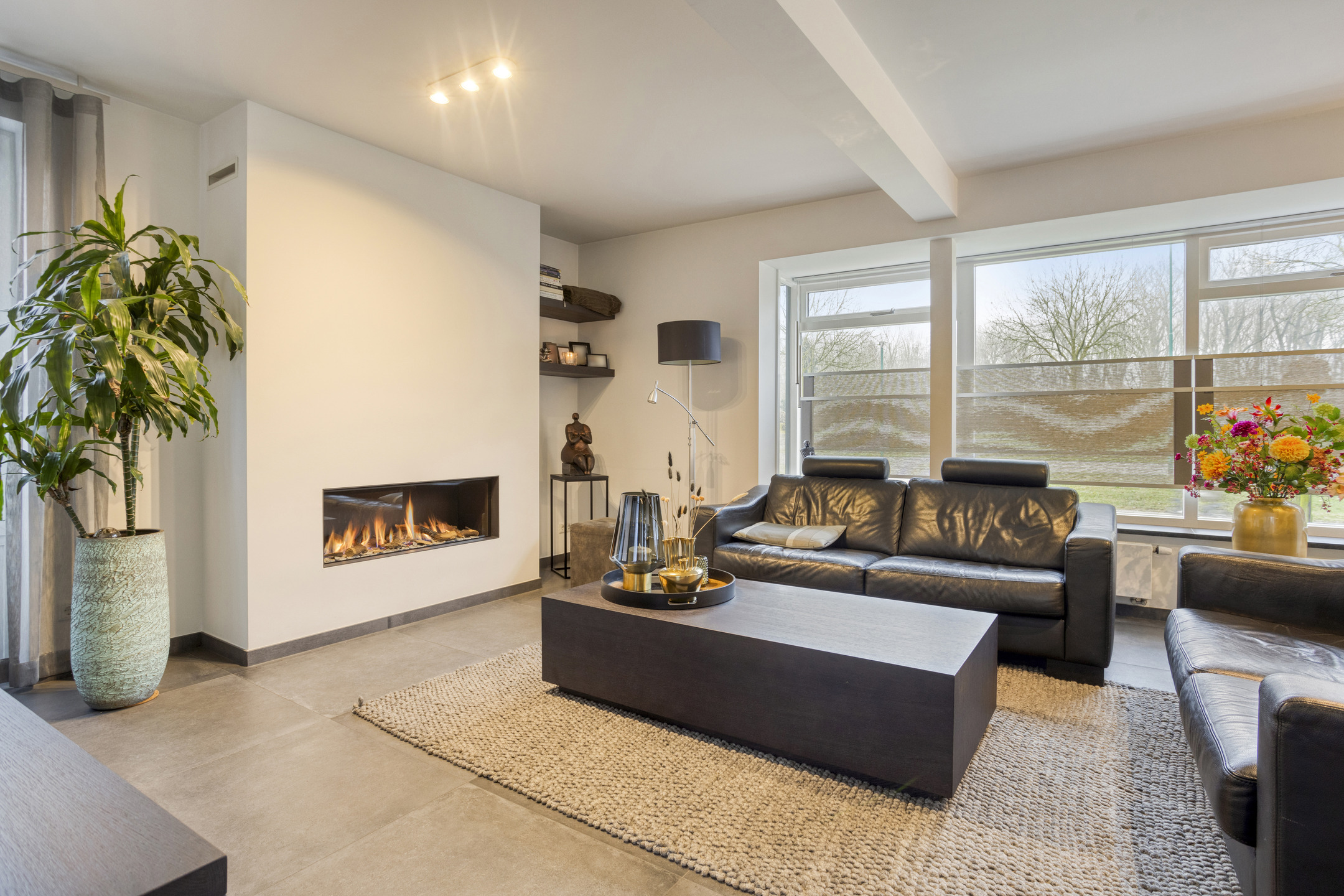 De lichte woonkamer is voorzien van een strakke tegelvloer en een sfeervolle gashaard (2016), wat zorgt voor een warme en comfortabele leefruimte met uitzicht op de tuin.
