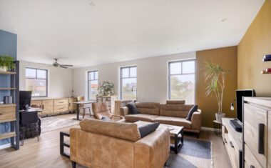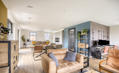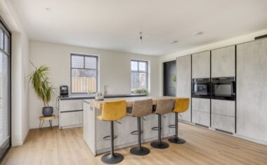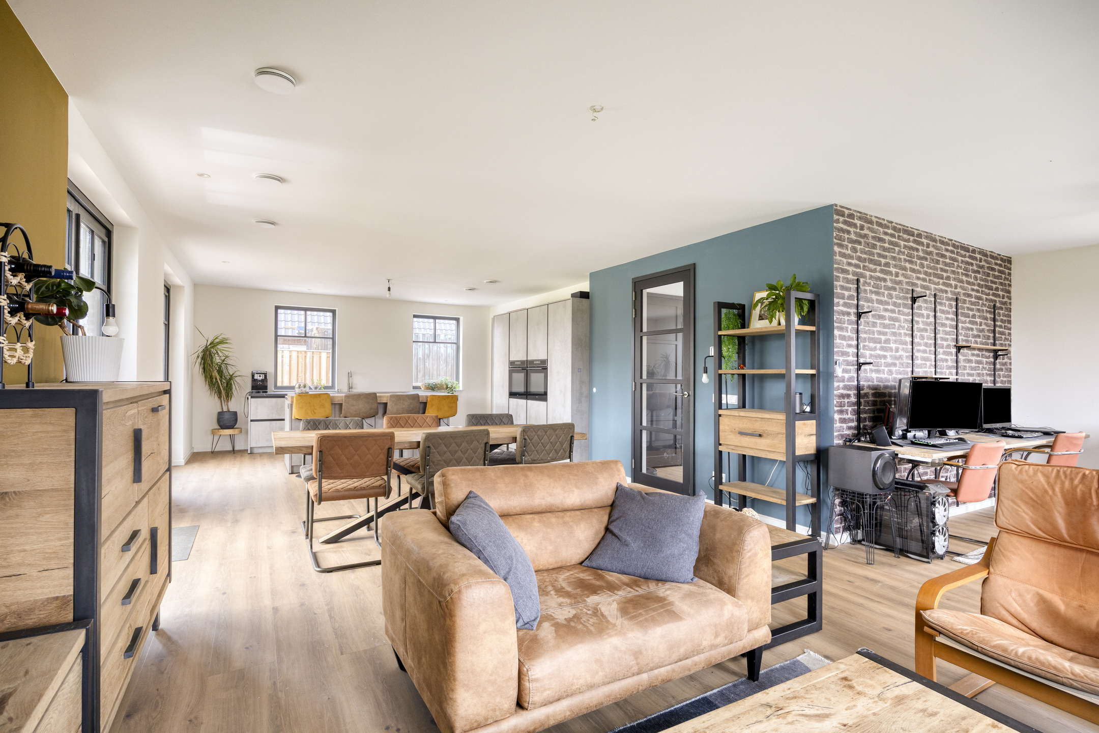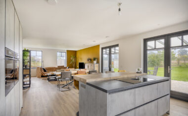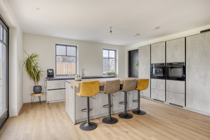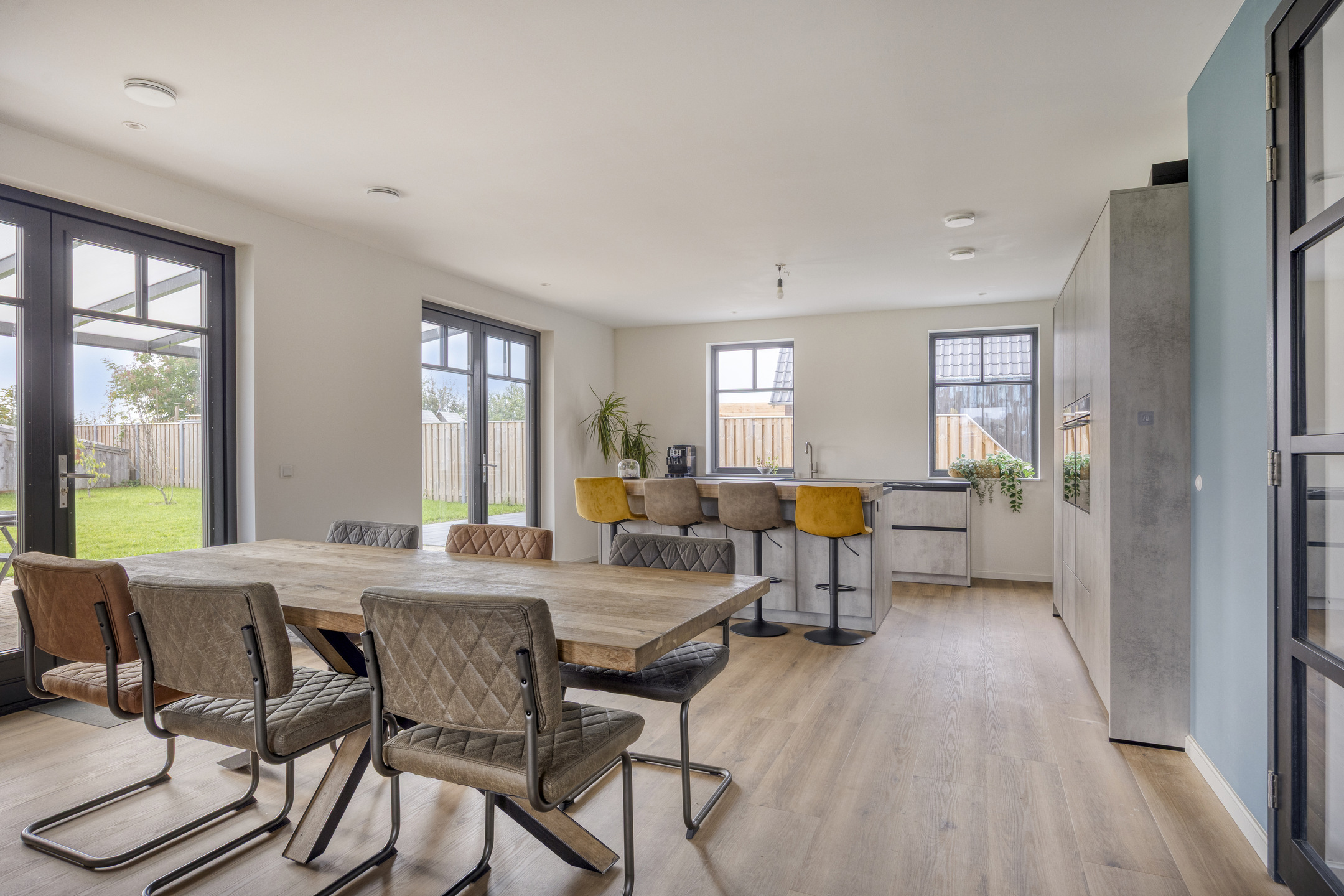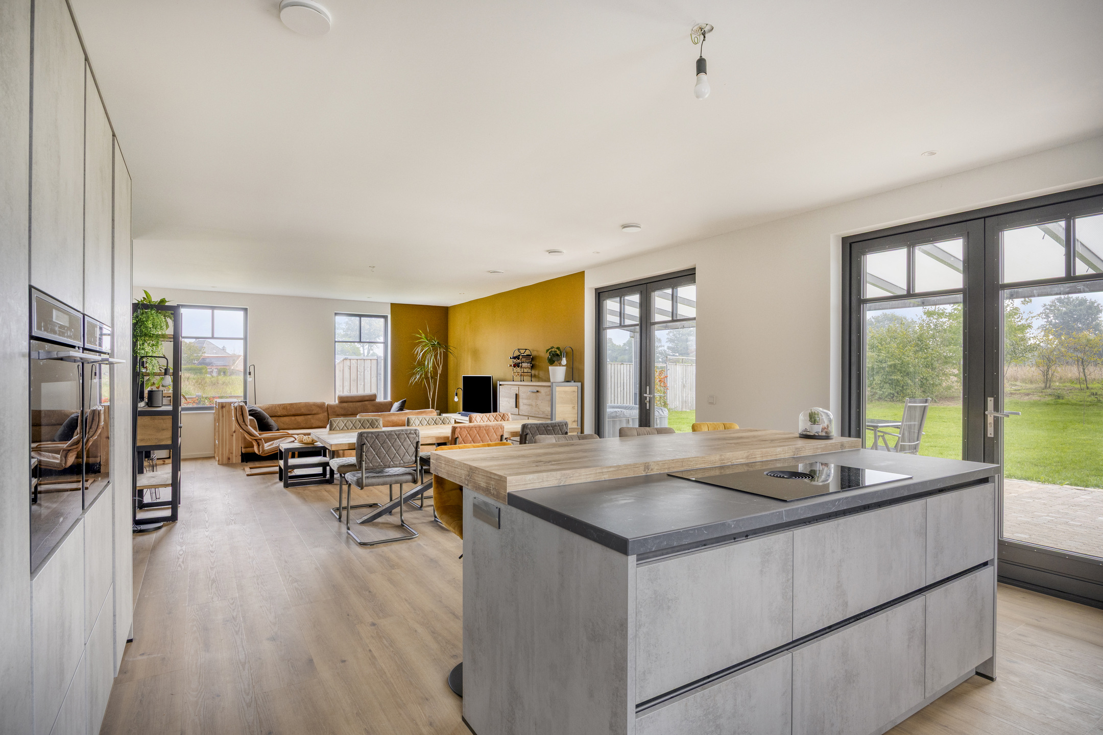 Binnen word je ontvangen in een lichte en open leefruimte. De woonkamer loopt vloeiend over in de eetkamer en moderne keuken met kookeiland — een perfecte plek voor gezellige avonden met familie of vrienden. Grote ramen zorgen voor veel daglicht en een prachtig uitzicht op de tuin.