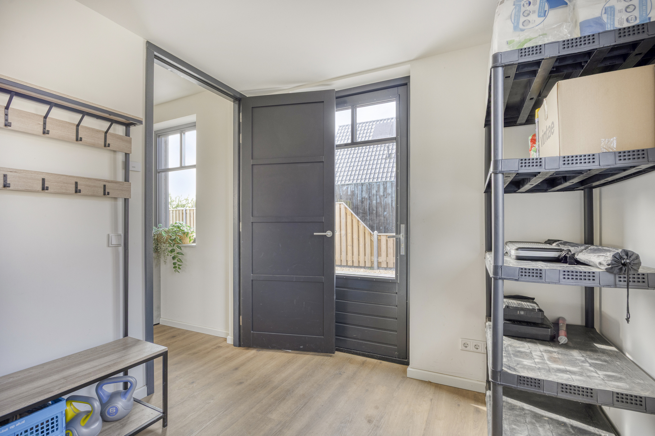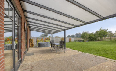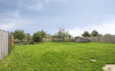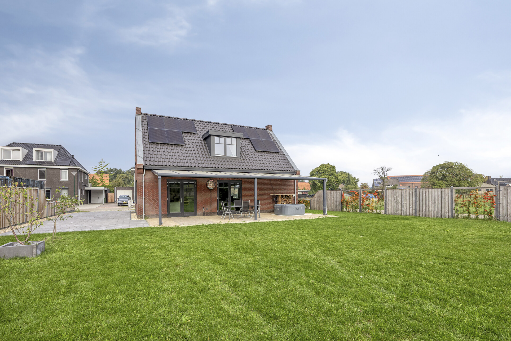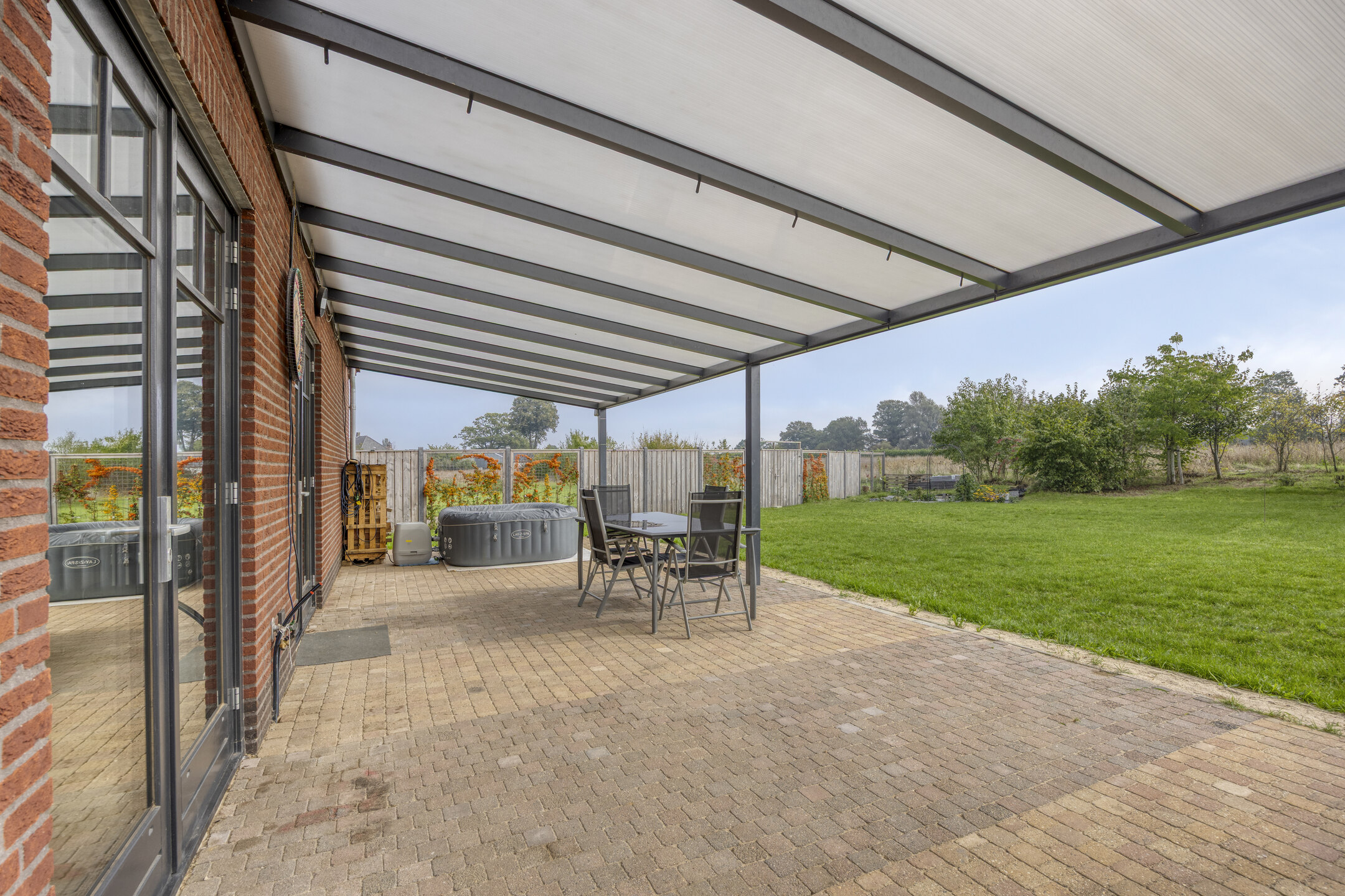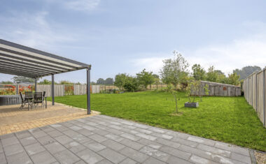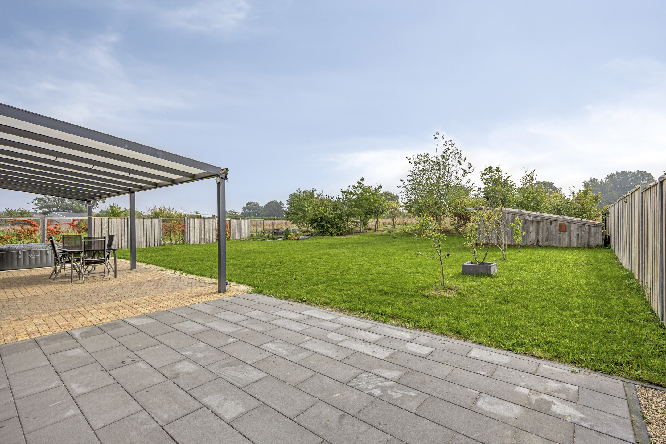 Via de openslaande deuren bereik je de ruime, fraai aangelegde achtertuin. Hier vind je een overkapping waar je heerlijk kunt ontspannen of buiten kunt dineren, met uitzicht op het gazon en het omliggende groen.