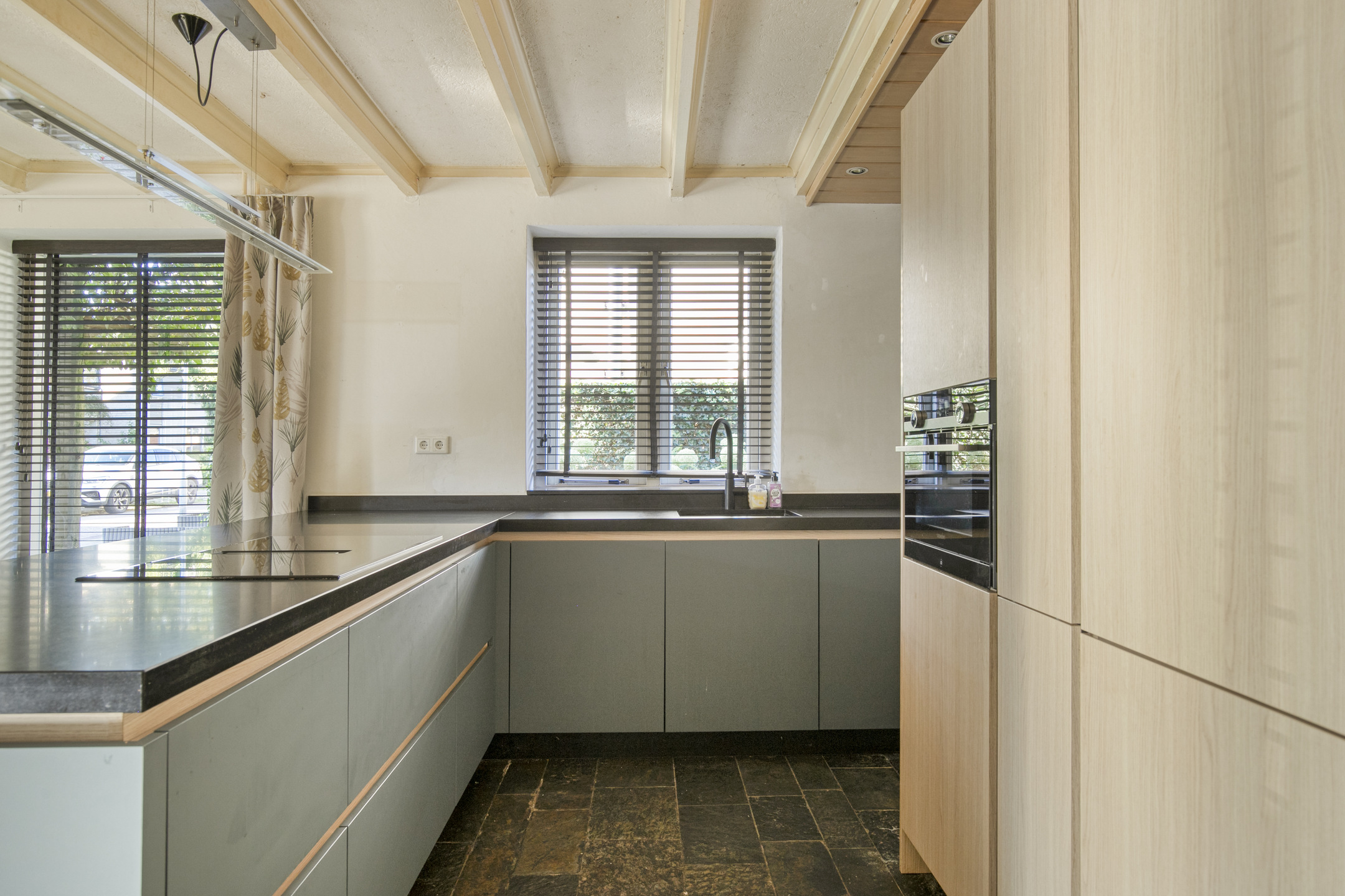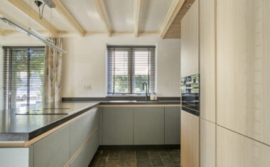– moderne keuken met apparatuur: inductiekookplaat met geïntegreerde afzuiging, quooker, koelkast, combimagnetron/oven en vaatwasser.