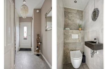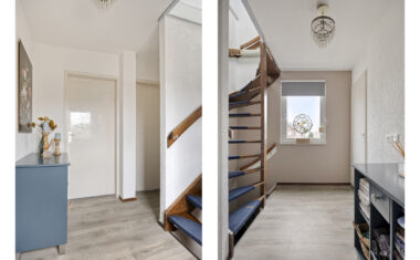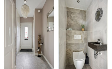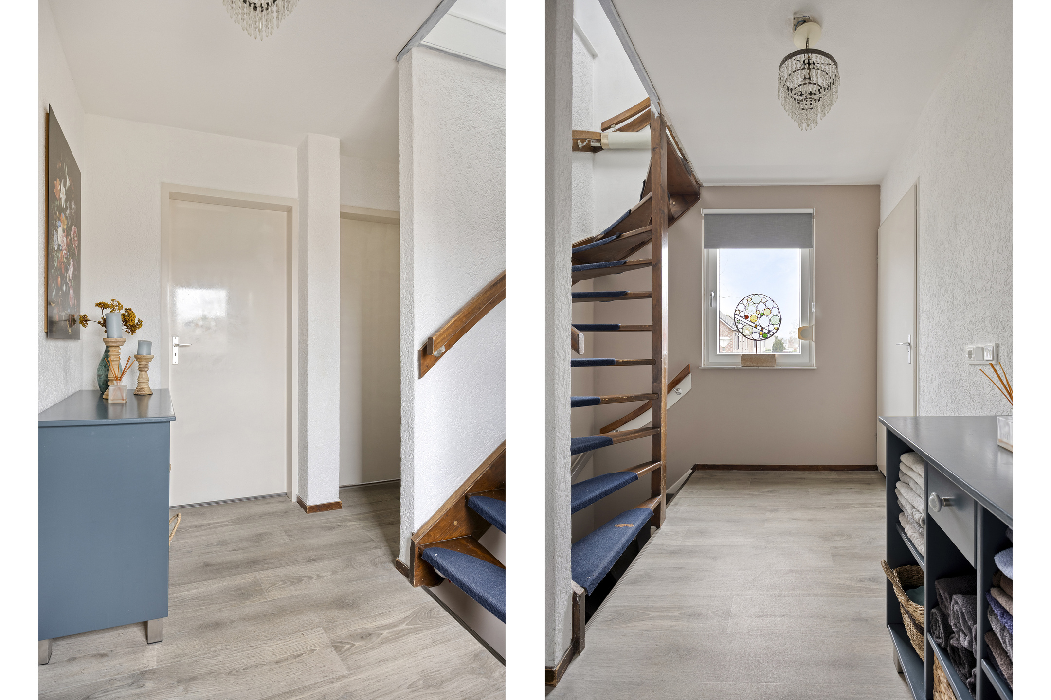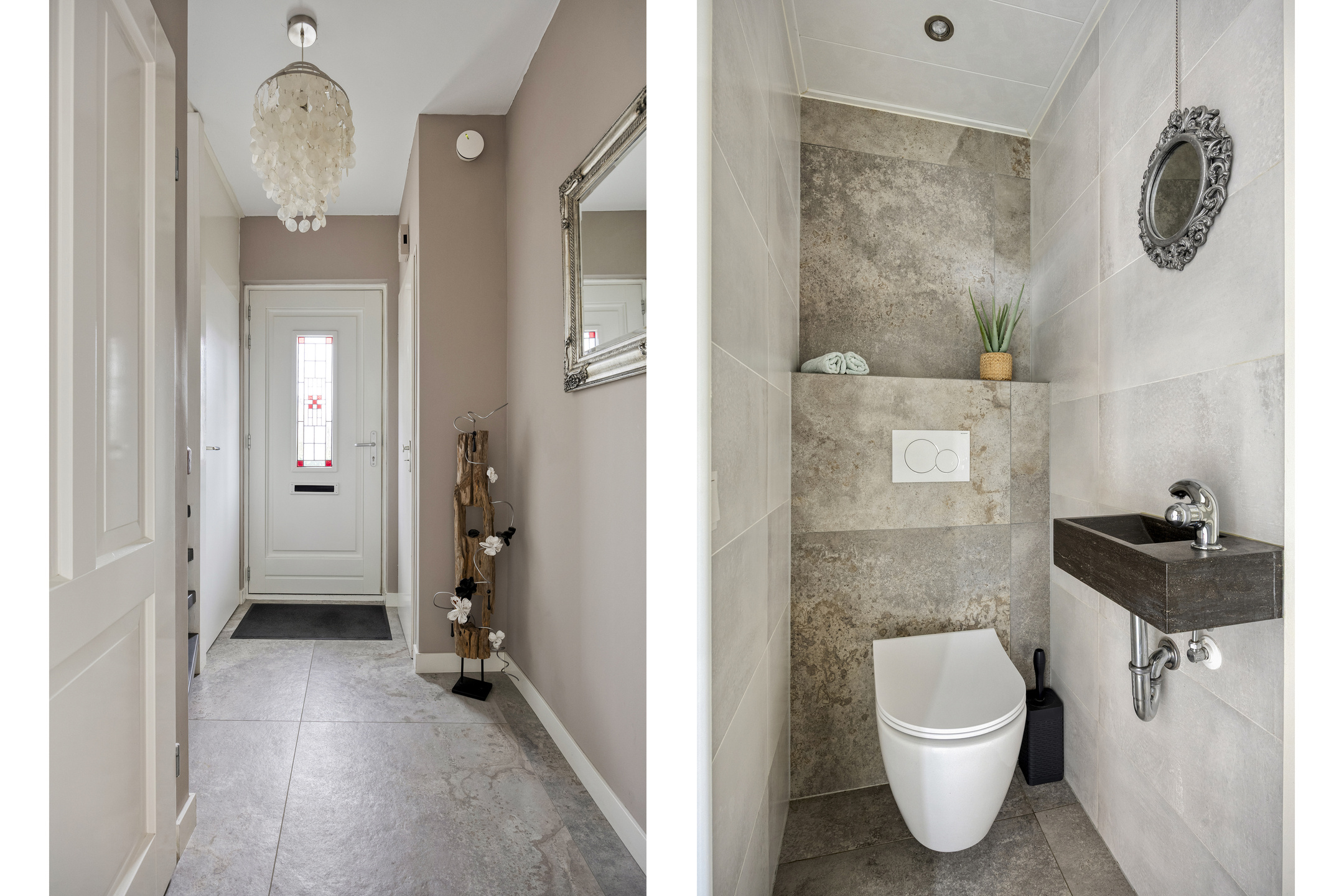 Via de entree kom je in de hal met meterkast, toilet en trapopgang naar de eerste verdieping. De hal vormt het centrale punt van de woning en geeft toegang tot de keuken en woonkamer.