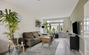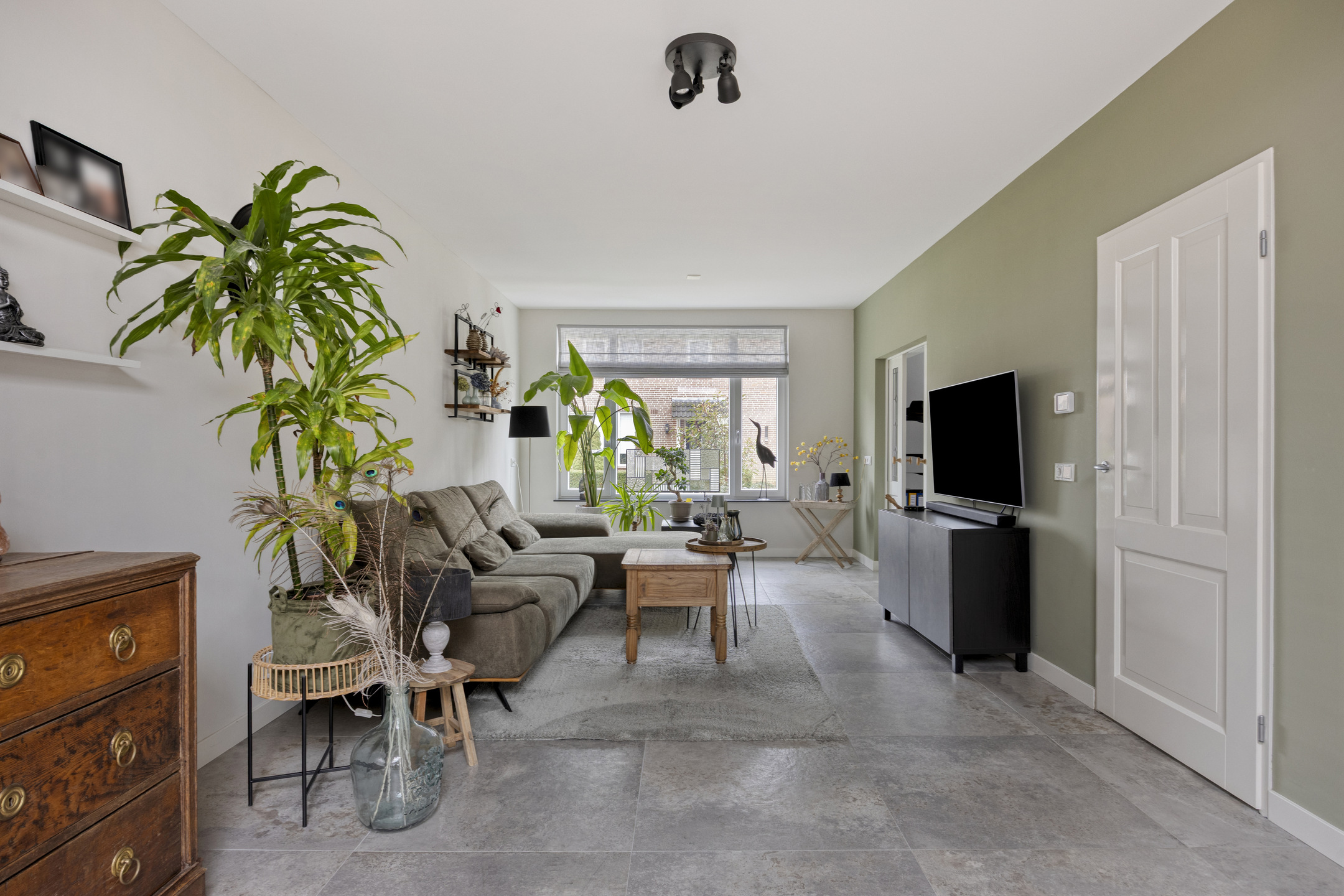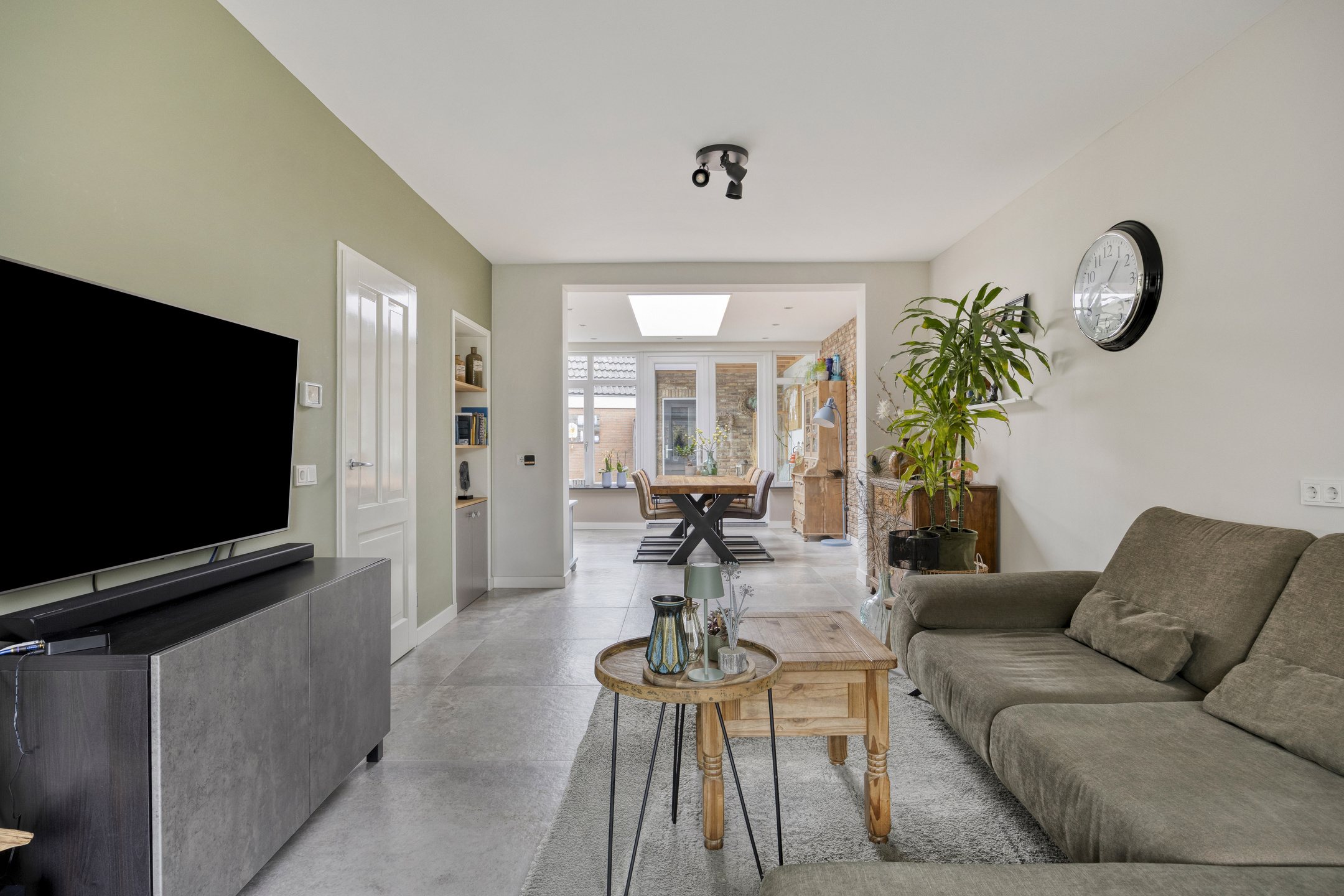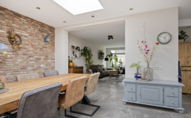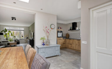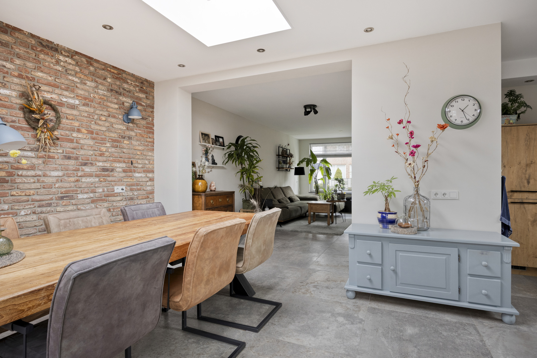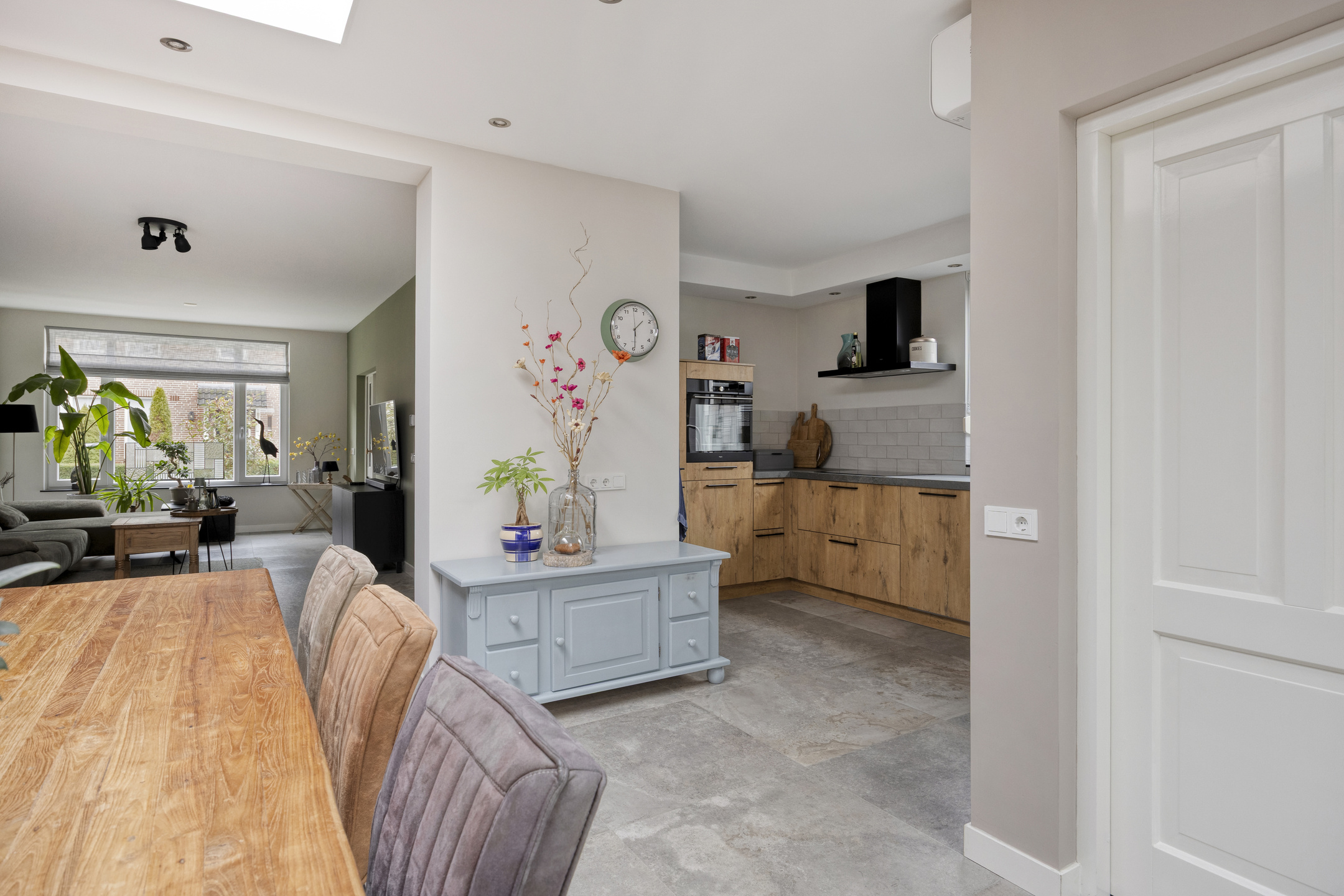 De royale woonkamer is tuingericht en biedt volop ruimte voor een comfortabele zithoek en een ruime eettafel. Dankzij de grote raampartijen geniet je hier van veel natuurlijk lichtinval.