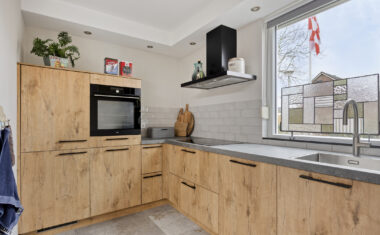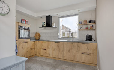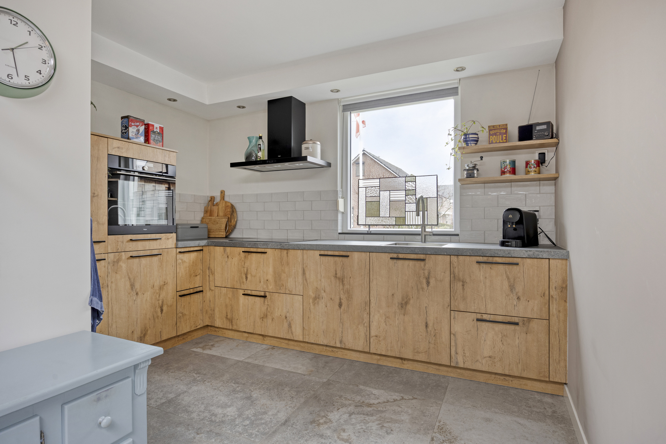 De keuken is praktisch ingericht en biedt voldoende werk- en bergruimte. Aansluitend bevindt zich de bijkeuken, ideaal voor extra opslag, provisie en het plaatsen van witgoedapparatuur. Vanuit de keuken is er direct toegang tot een berging, wat zorgt voor extra functionaliteit.