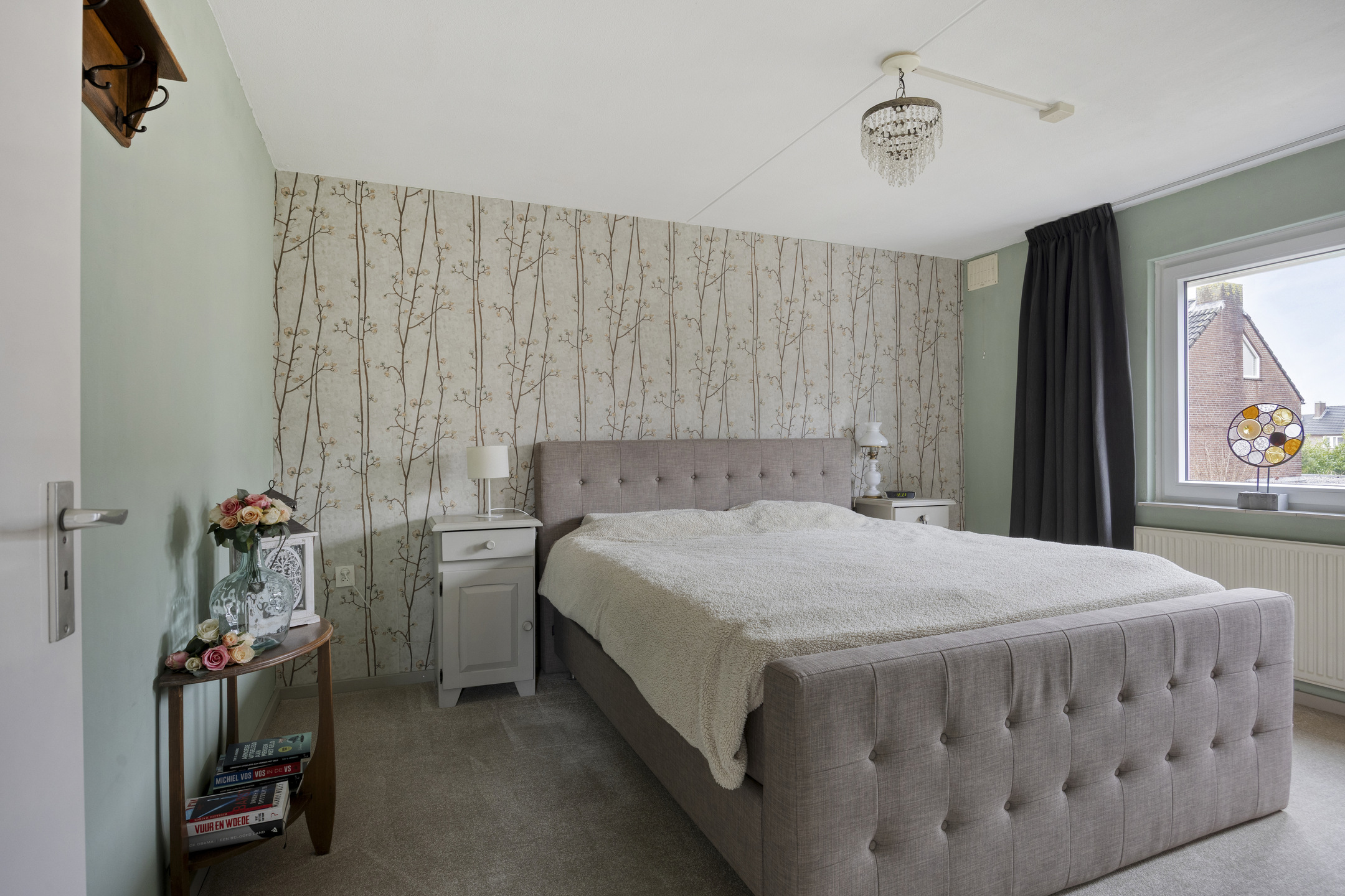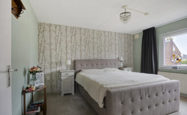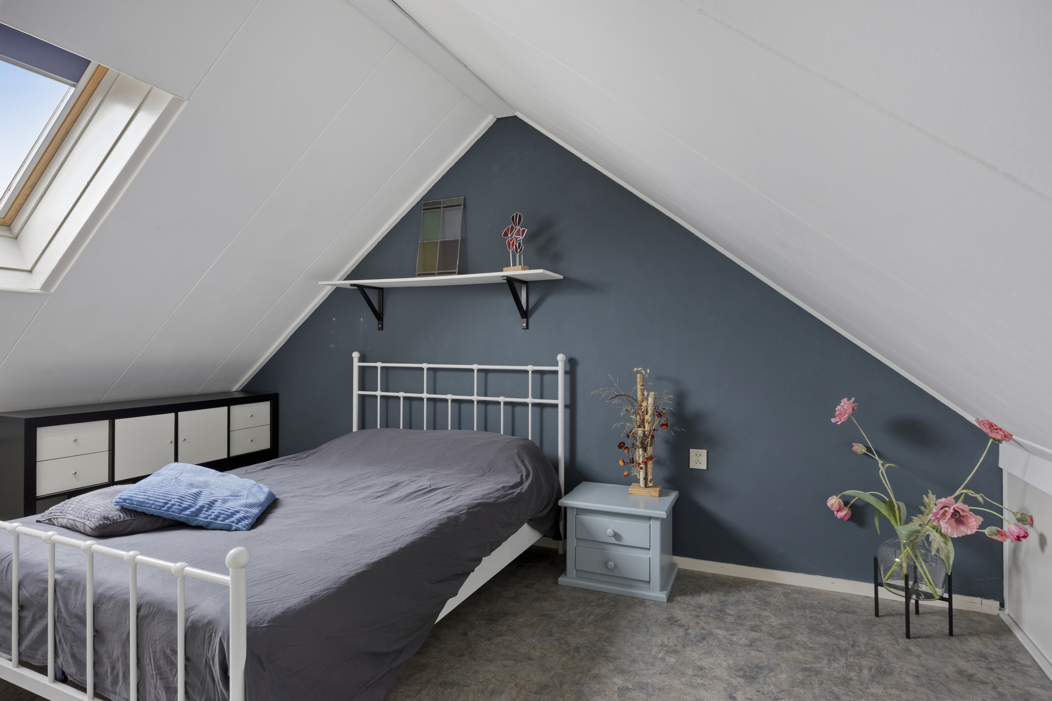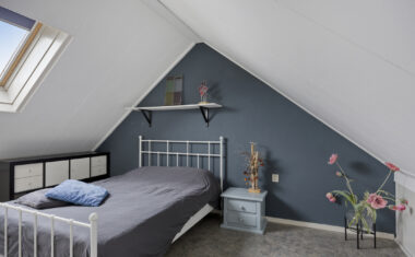 Via een vaste trap bereik je de tweede verdieping. Hier bevindt zich een ruime vierde slaapkamer met dakraam en praktische knieschotten voor extra bergruimte.