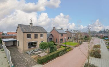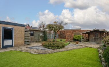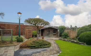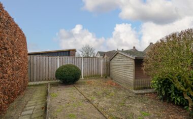Rondom de woning ligt een verzorgde tuin met diverse groenpartijen, terrasmogelijkheden, veel privacy en een achterom. Daarnaast beschikt het perceel over een garage, een houten tuinhuis en een aparte tuinberging, ideaal voor opslag, klussen of hobby’s.