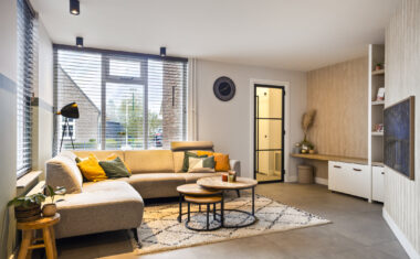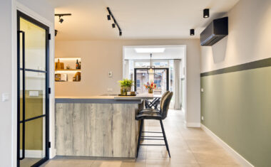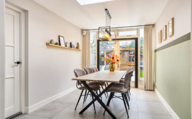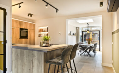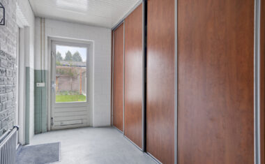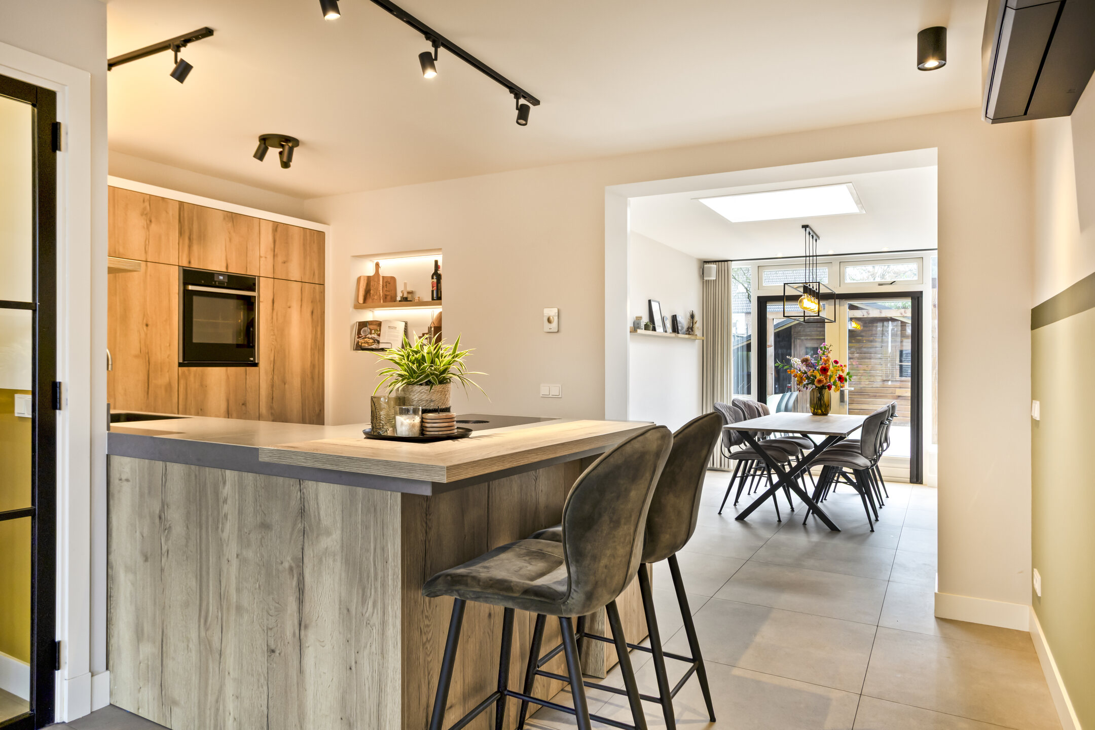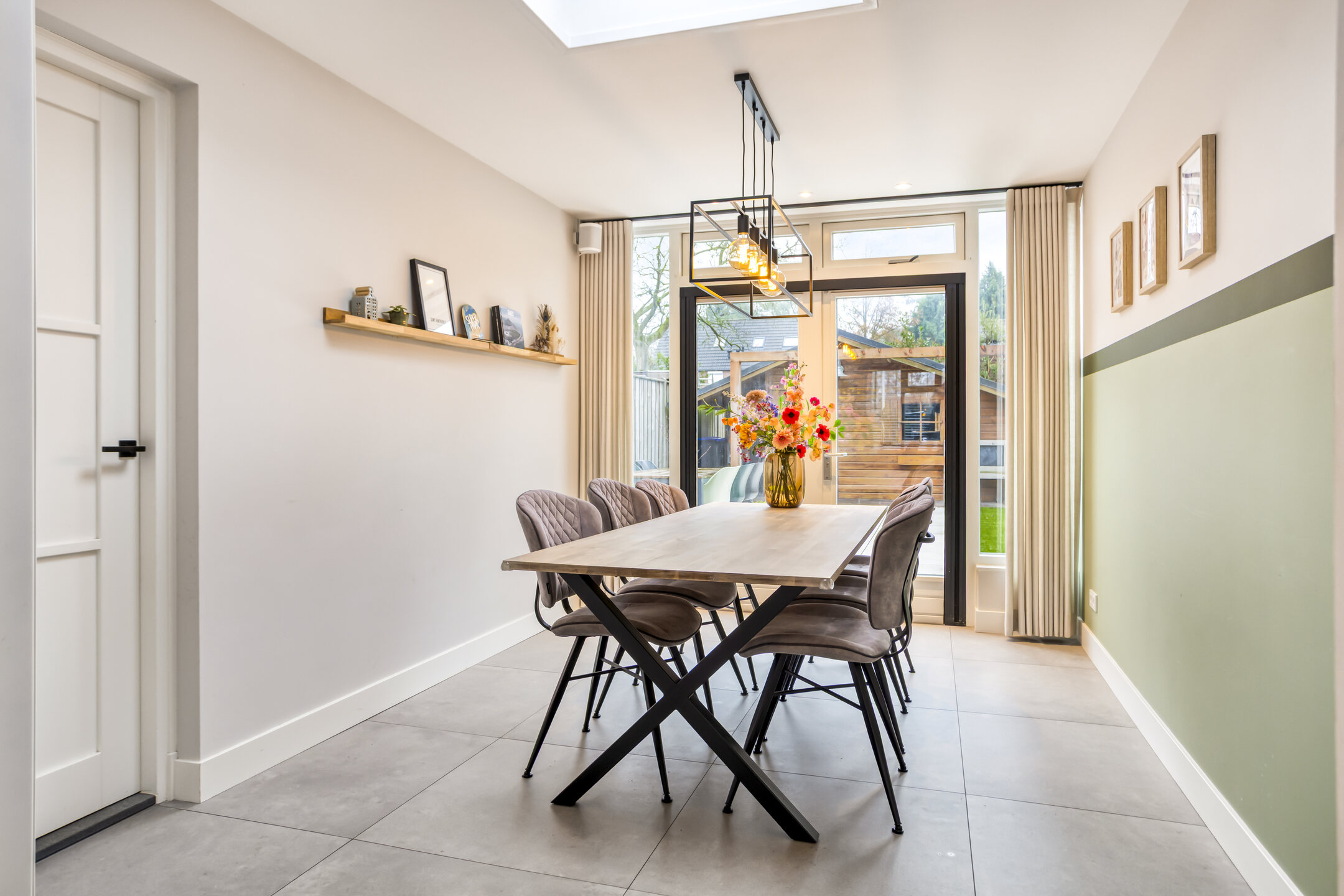 Vanuit hier loop je door naar de tuinkamer, een heerlijke extra leefruimte met openslaande deuren naar het terras en directe toegang tot de berging en de bijkeuken. De bijkeuken is voorzien van extra aanrechtblad, opstelling cv-ketel en witgoedaansluitingen.