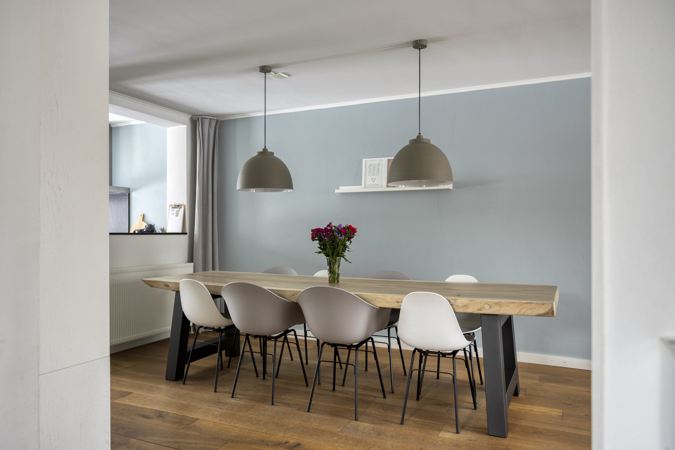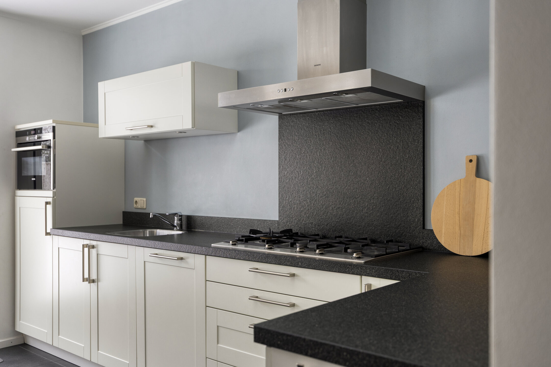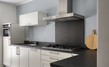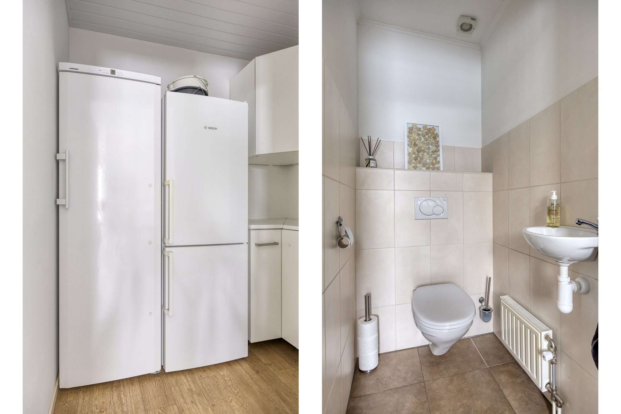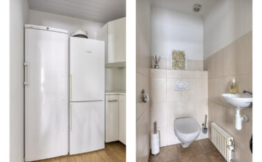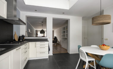 Aan de achterzijde bevindt zich de woonkeuken (2008) met openslaande tuindeuren en inbouwapparatuur: oven/vaatwasser, afzuigkap, boiler (2021) en koelkast (2025). Vanuit de keuken is de bijkeuken bereikbaar, waar zich extra bergruimte bevinden. Daarnaast is er een achterportaal aanwezig met het toilet.