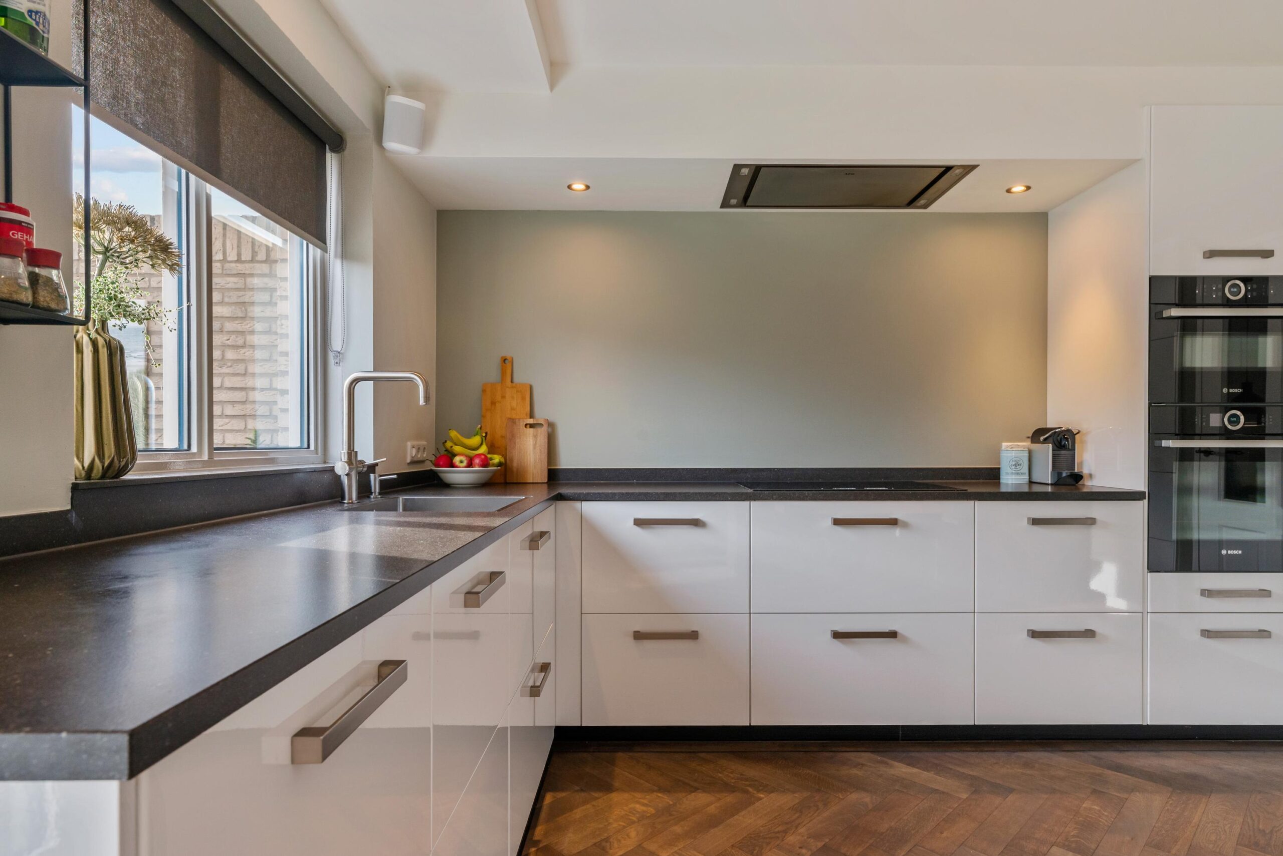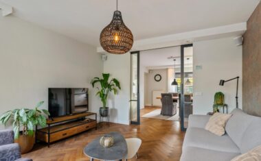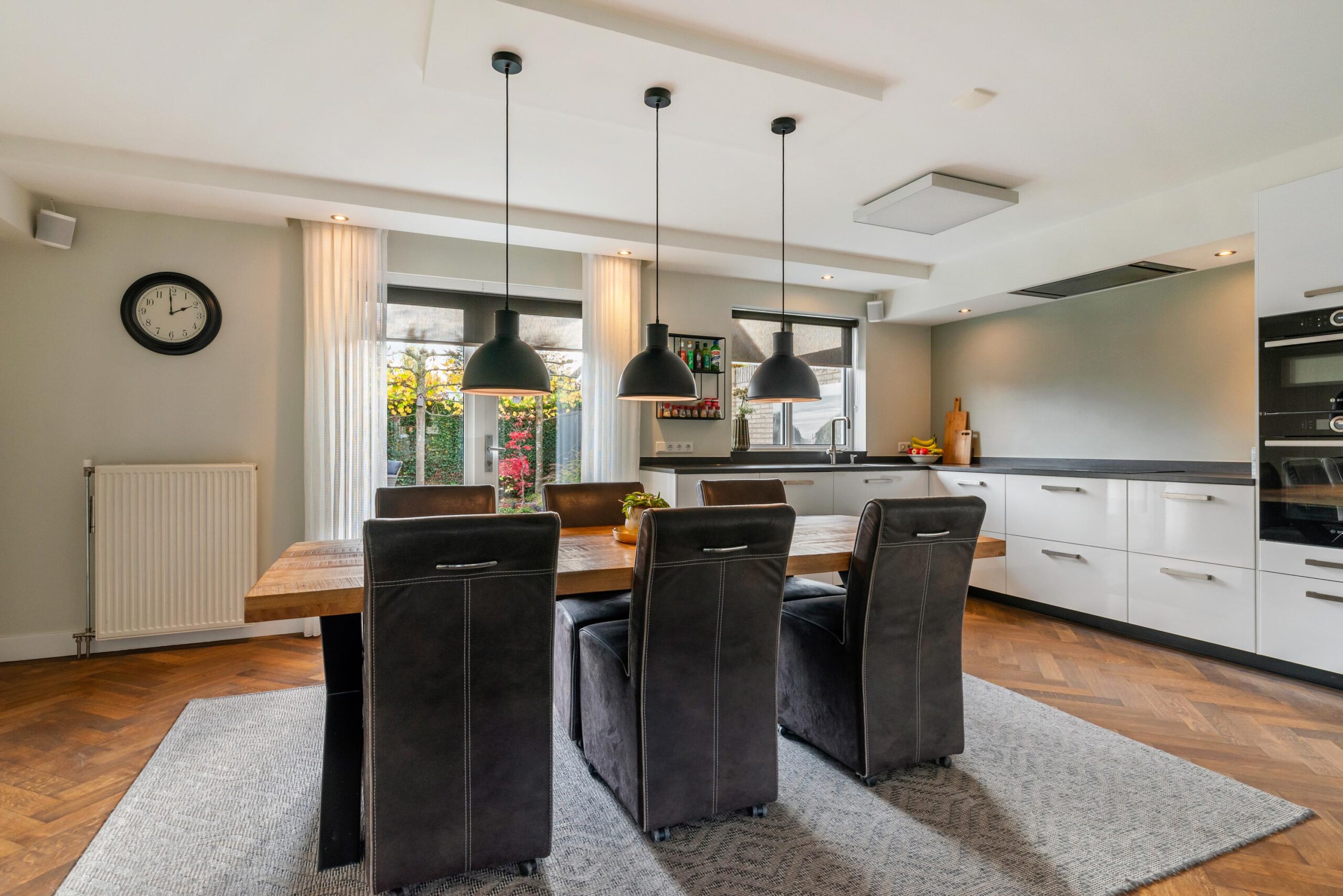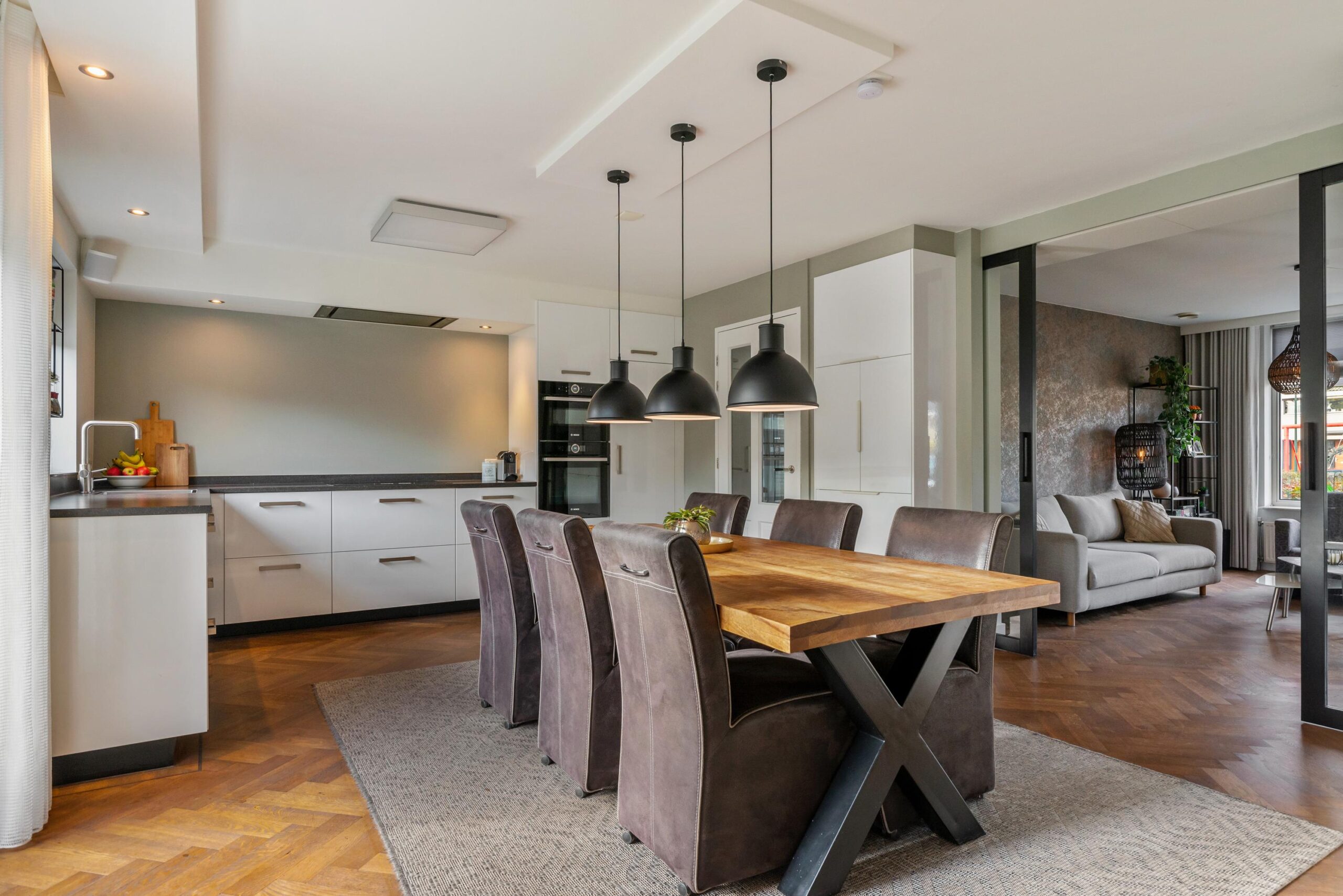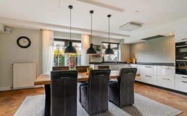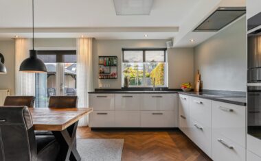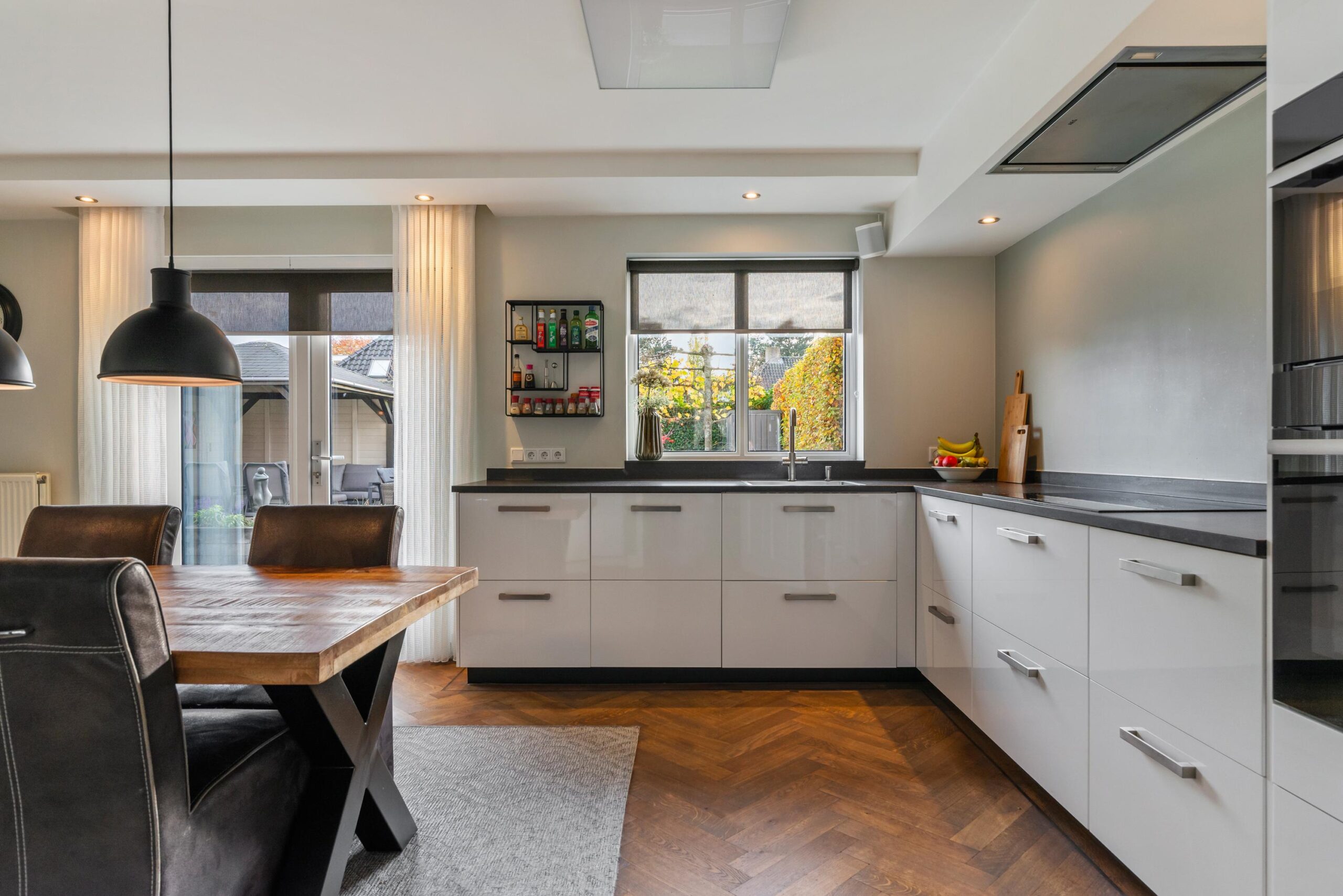 De openslaande tuindeuren brengen veel licht binnen en geven direct toegang tot het zonnige terras. De woonkeuken staat in verbinding middels ensuite deuren met de stijlvolle woonkamer, waar de fraaie visgraat parketvloer zorgt voor een warme en luxe uitstraling.