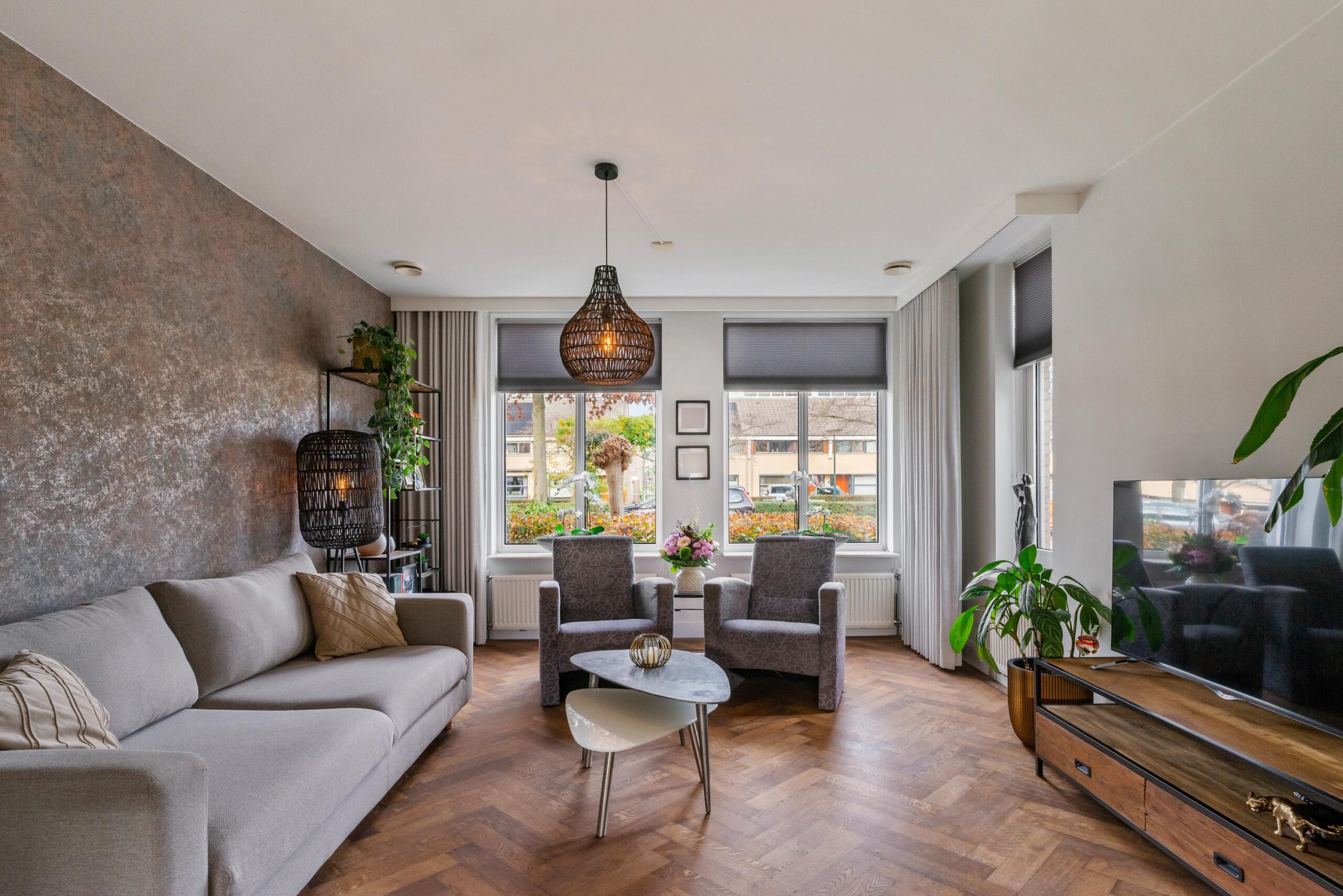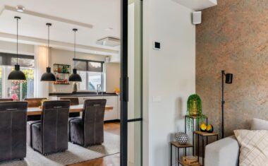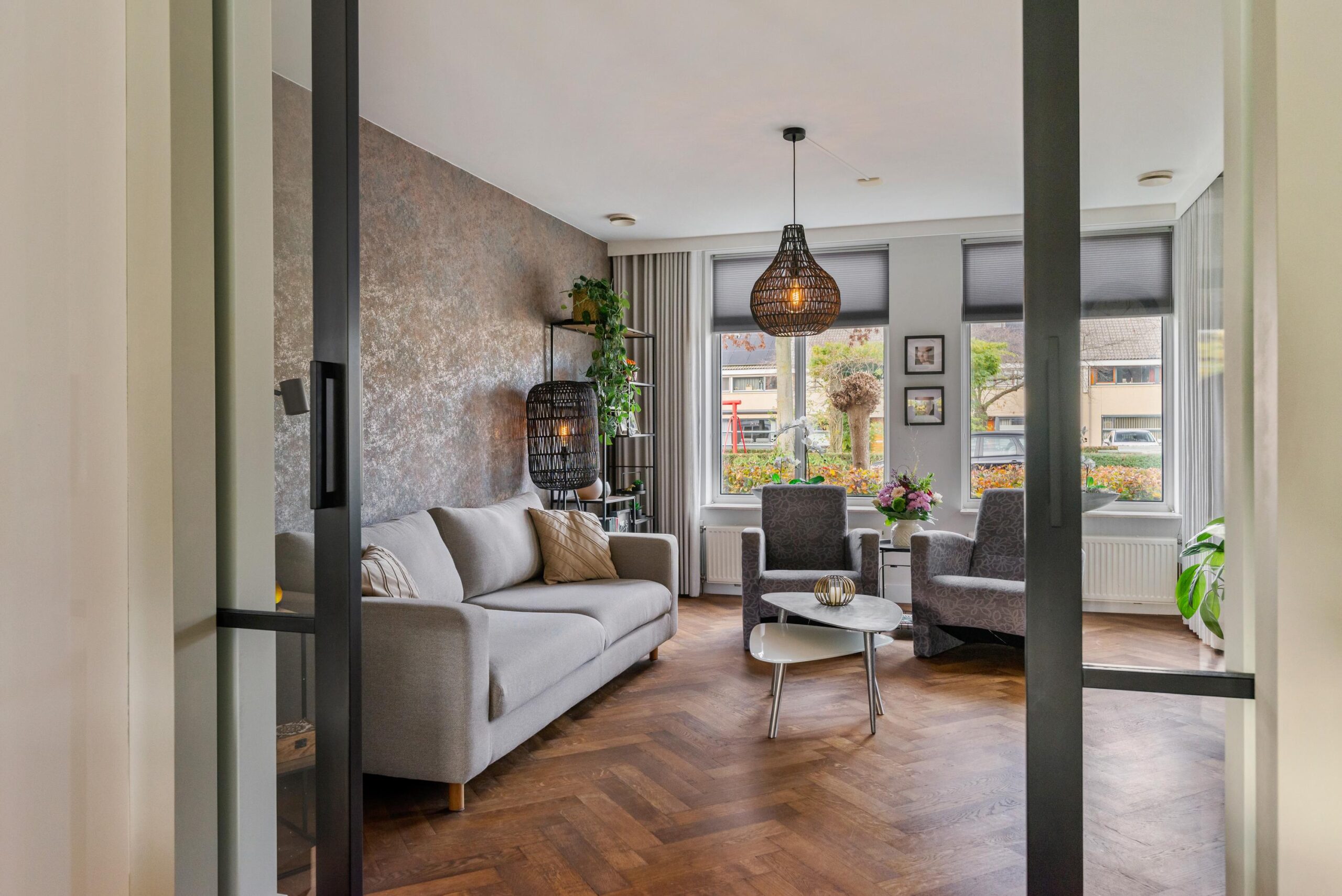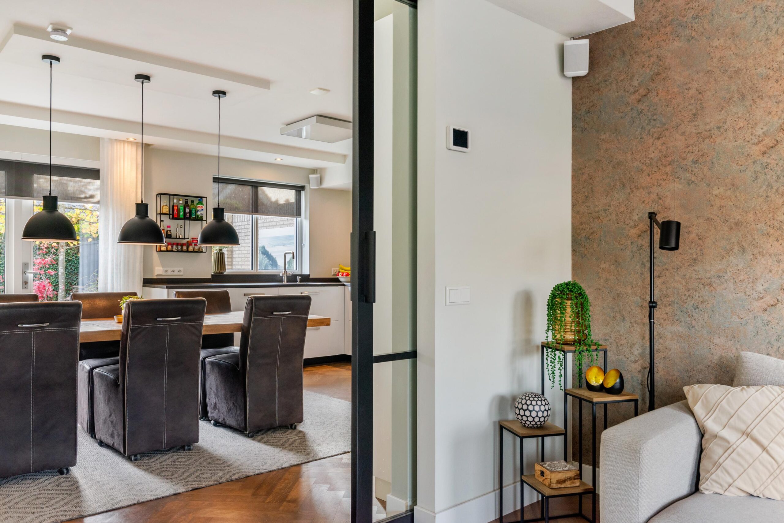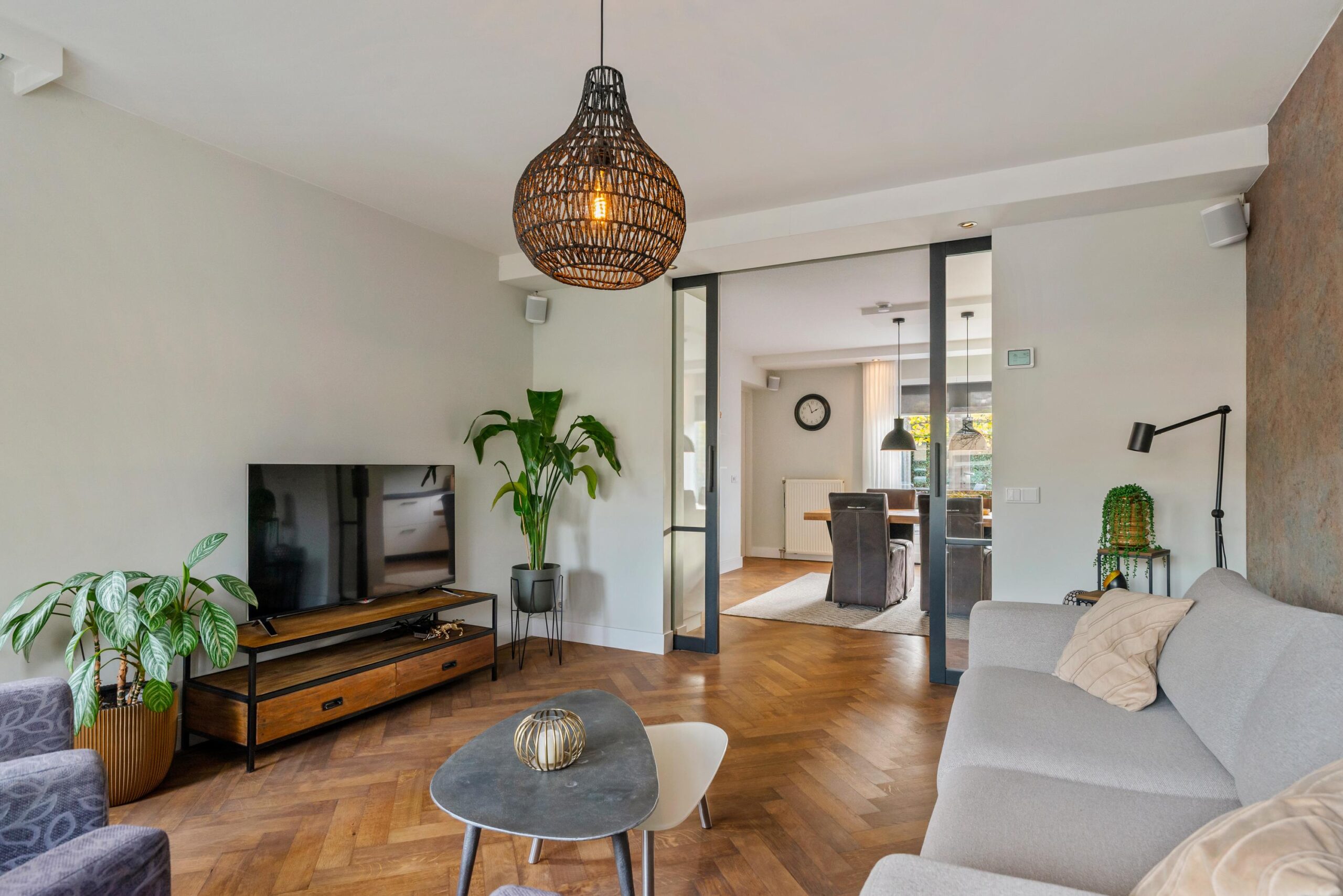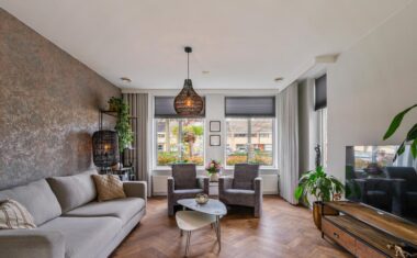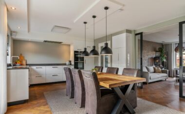 De openslaande tuindeuren brengen veel licht binnen en geven direct toegang tot het zonnige terras. De woonkeuken staat in verbinding middels ensuite deuren met de stijlvolle woonkamer, waar de fraaie visgraat parketvloer zorgt voor een warme en luxe uitstraling.