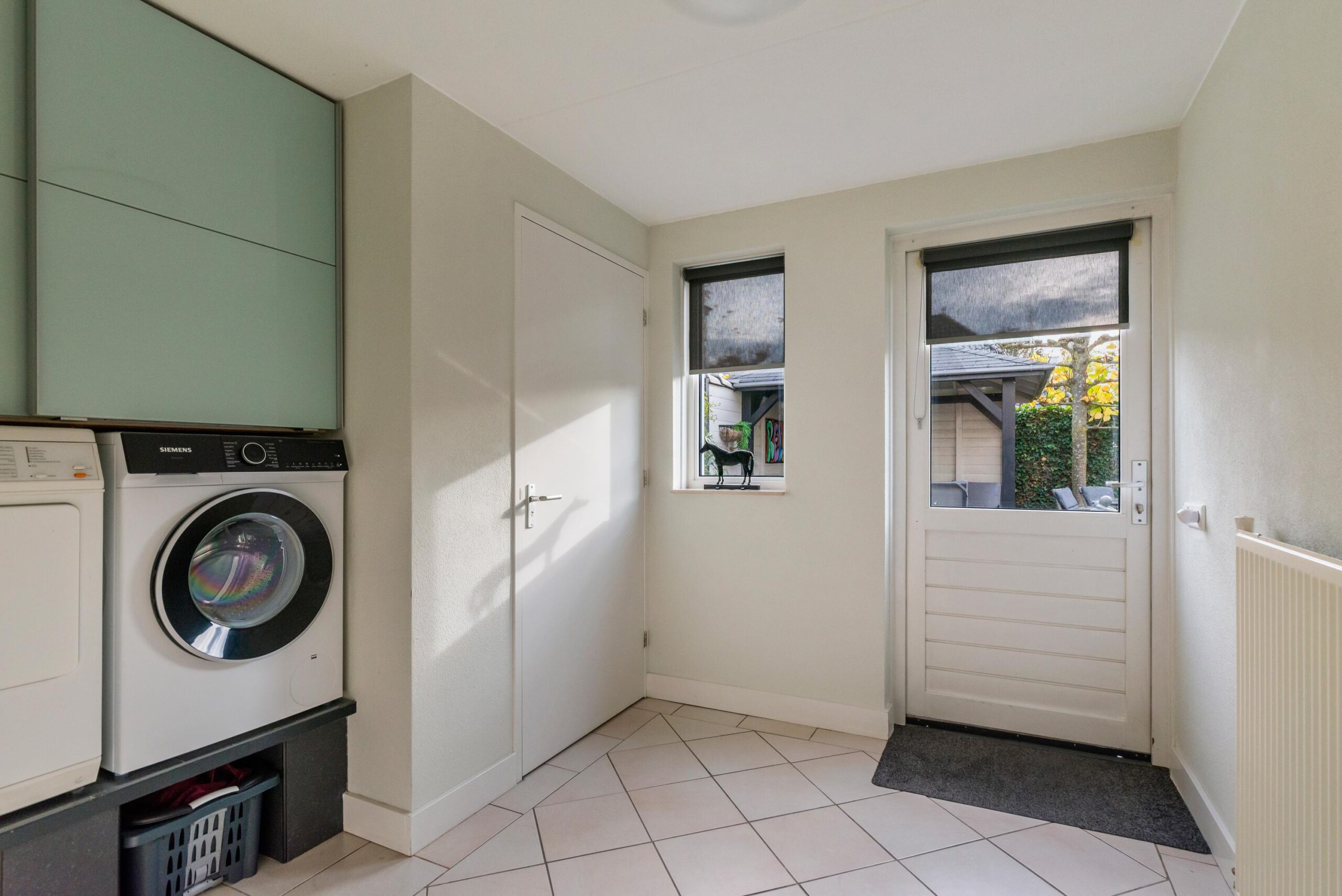 Aangrenzend aan de keuken bevindt zich de praktische bijkeuken, voorzien van een vaste kastenwand en aansluiting voor de wasmachine en het toilet.