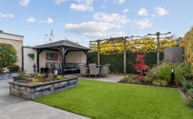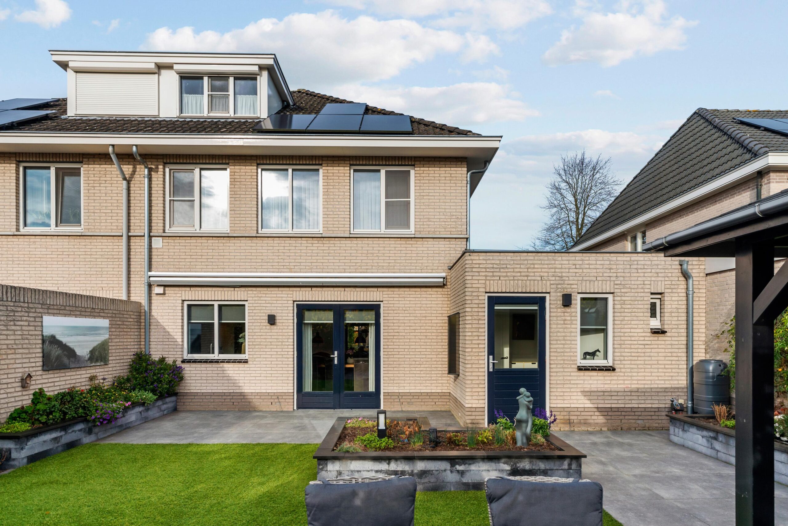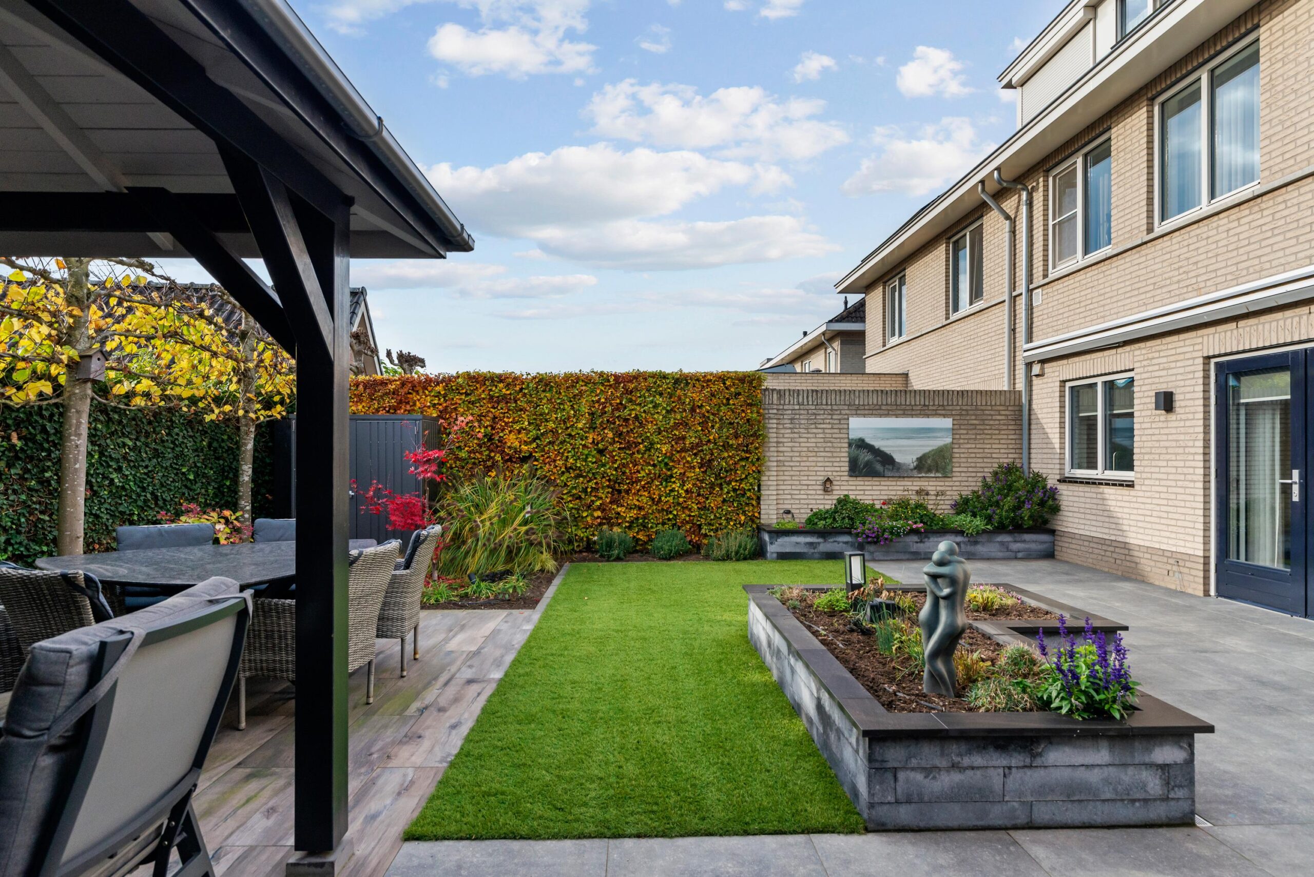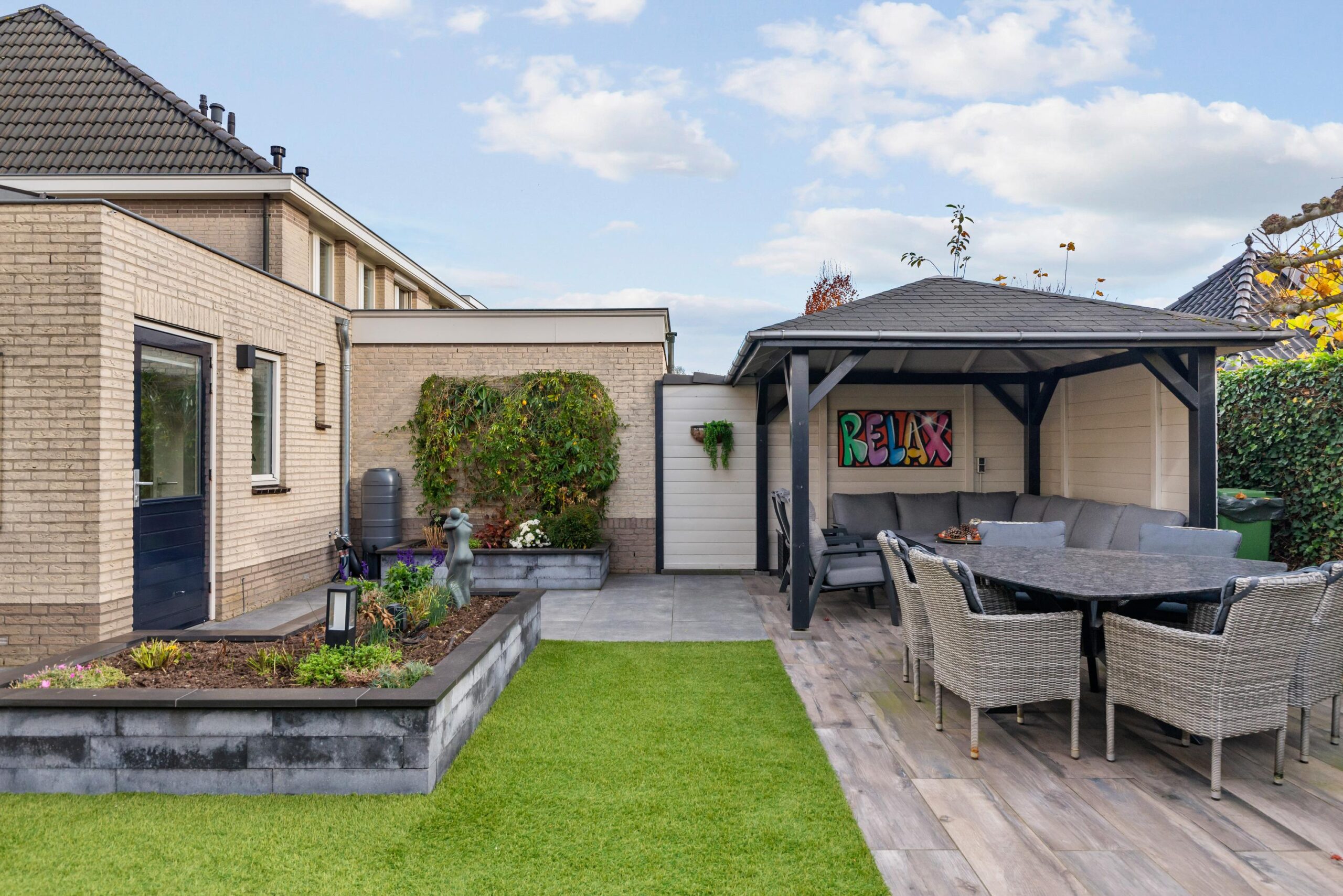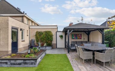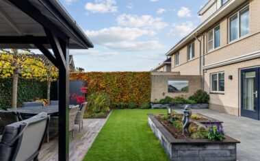 De achtertuin is strak en onderhoudsvriendelijk ingericht met kunstgras, grote terrastegels en groene borders incl. automatische beregening middels druppelslangen. De ruime overkapping met comfortabele zithoek vormt een perfect verlengstuk van de leefruimte—ideaal om het hele jaar door te ontspannen of gasten te ontvangen. Dankzij de privacy, nette afwerking en verschillende zitplekken is dit een heerlijke plek om van buiten te genieten.