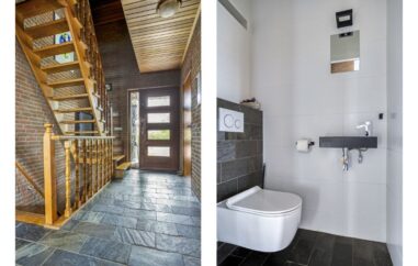 Overdekte entree met toegang tot de ruime hal voorzien van meterkast en modern toilet. L-vormige living met sfeervolle houten vloer en schuifpui naar het half overdekte zonneterras. Aan de andere kant van de hal bevindt zich de extra woon-werkruimte met eigen portaal/ingang. De woonkeuken is voorzien van voldoende daglichttoetreding en heeft mooi zicht op de achtertuin. De moderne inbouwkeuken met natuurstenen aanrechtblad is voorzien van alle denkbare inbouwapparatuur: 5-pits gaskookplaat, afzuigkap, quooker, hoge-drukoven, vaatwasser en koel-vriescombinatie. Vanuit de bijkeuken met wasmachineaansluiting loop je de achtertuin in.