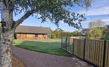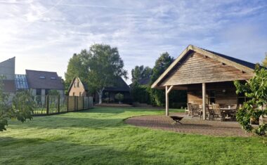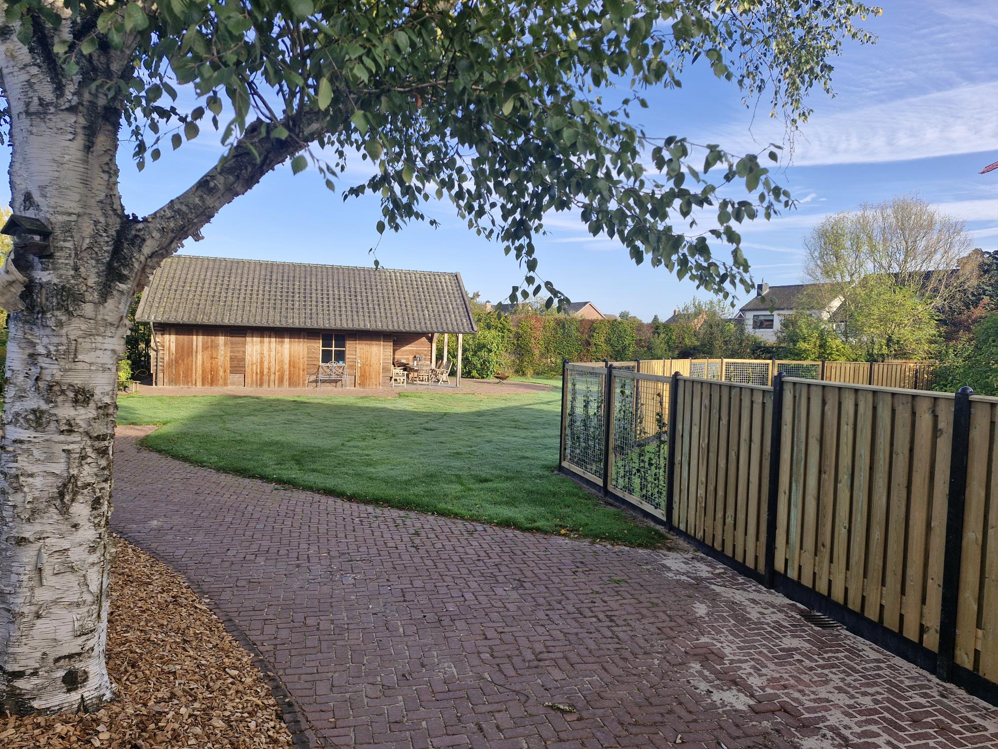 Achter in de tuin staat de vrijstaande, volledig geïsoleerde tuingarage, opgetrokken in steen/hout (Douglas). Dit sfeervolle gebouw is te gebruiken om meerdere auto’s te stallen of om een hobby uit te oefenen.