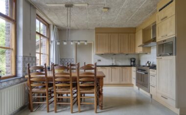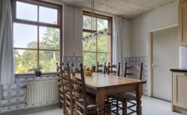 Aan de achterzijde bevindt zich de ruime eetkamer, een perfecte plek om samen te komen met familie en vrienden. Aangrenzend vindt u de open keuken, die praktisch is ingedeeld en beschikt over veel werk- en bergruimte. Vanuit de keuken loopt u door naar de bijkeuken waar zich witgoed aansluitingen bevinden.