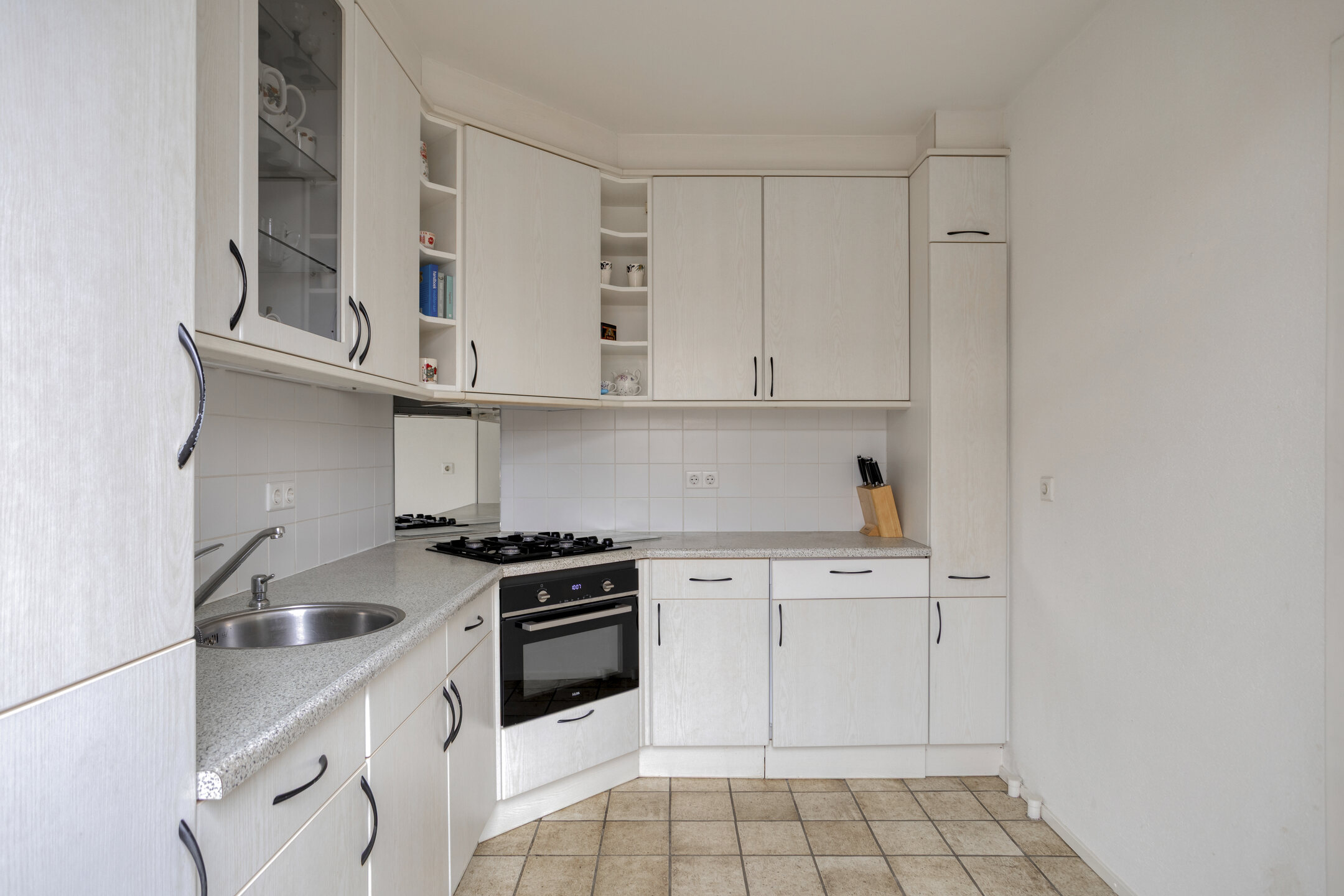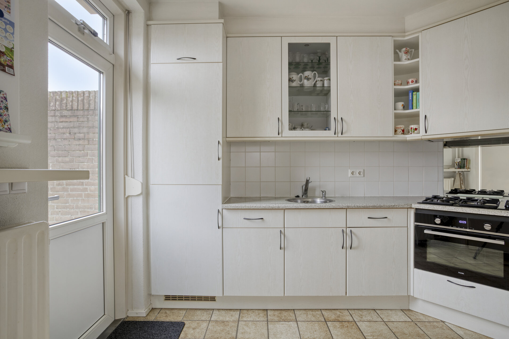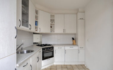 De keuken is vanuit de woonkamer bereikbaar en is voorzien van diverse inbouwapparatuur, waaronder een oven/magnetron, gaskookplaat, afzuigkap, koelkast, diepvries en wasmachine. Vanuit de keuken heeft u direct toegang tot de afgesloten tuin, waardoor binnen en buiten prettig met elkaar in verbinding staan.