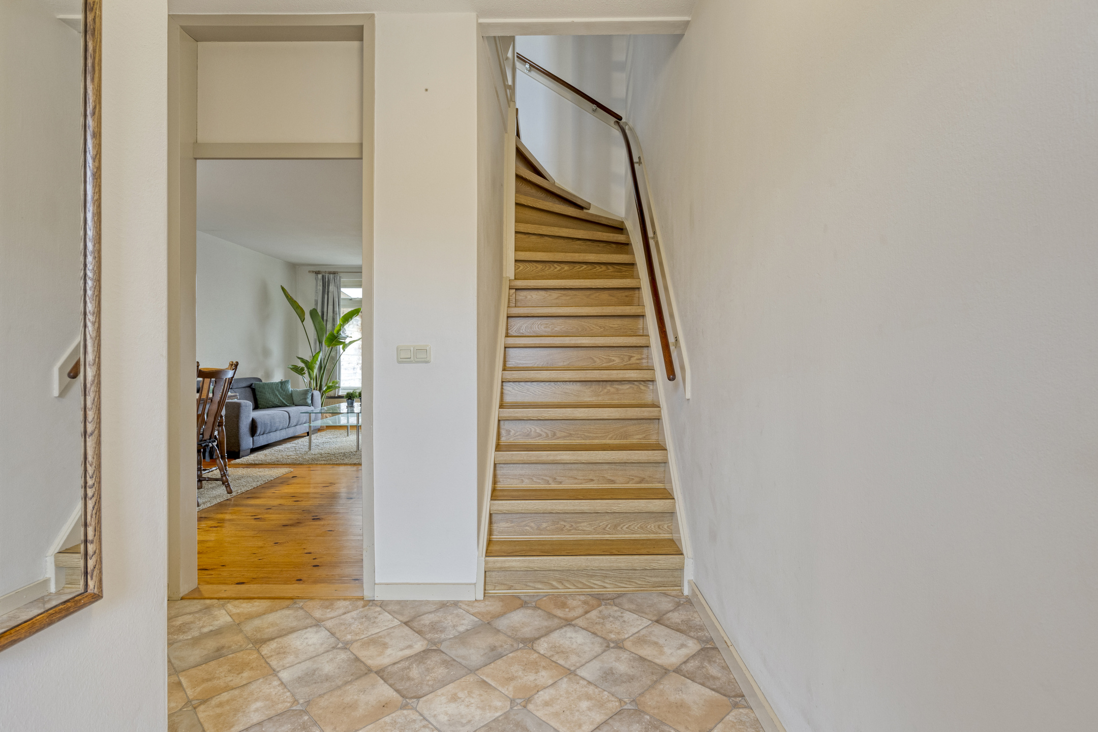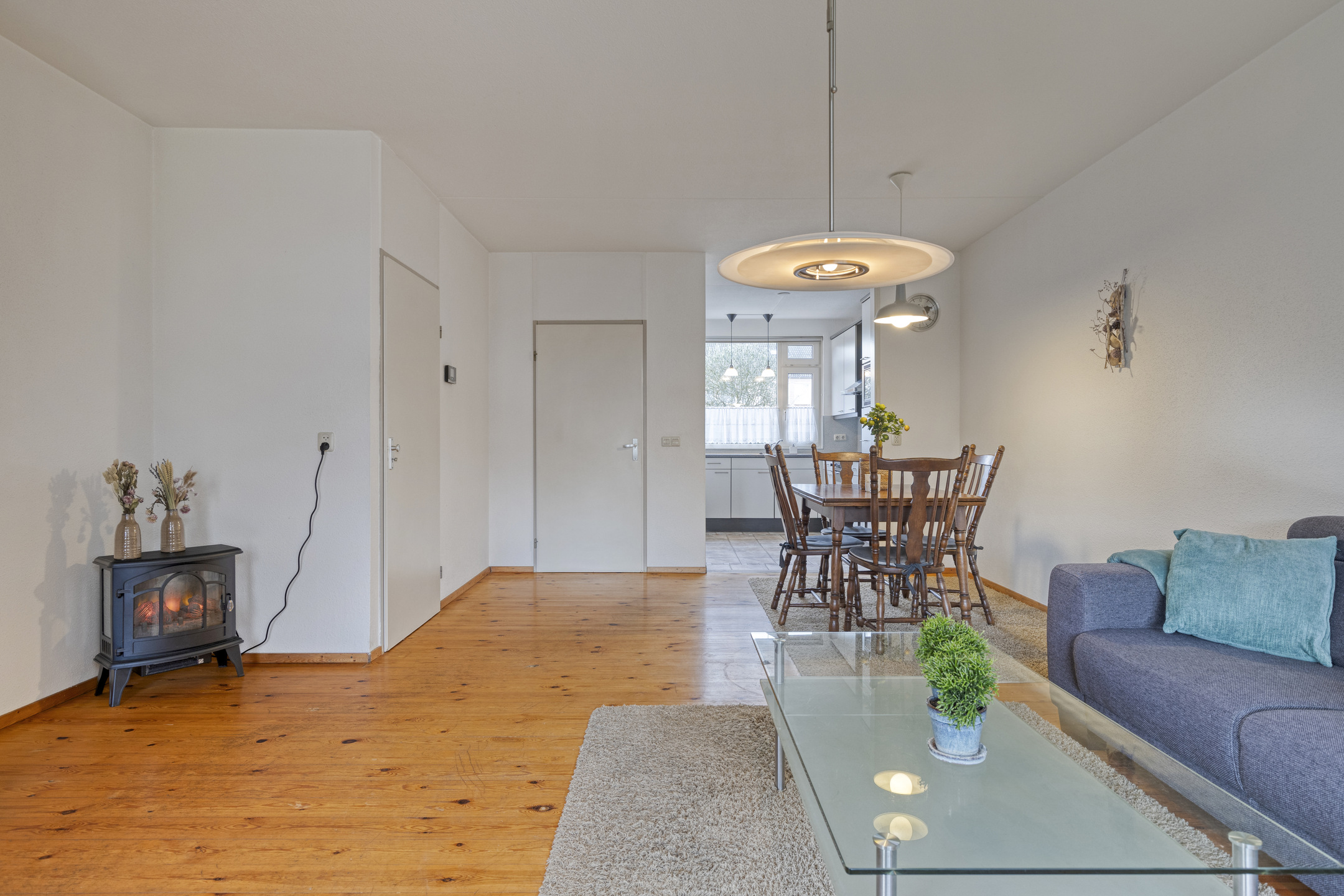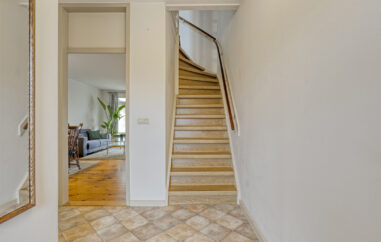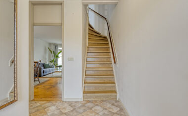 Via de entree betreed je de hal met toegang tot het toilet, de trapopgang en de woonkamer. De woonkamer is licht en ruim opgezet en biedt voldoende plaats voor een comfortabele zithoek. Aansluitend bevindt zich de eethoek, met ruimte voor een royale eettafel en direct contact met de keuken.