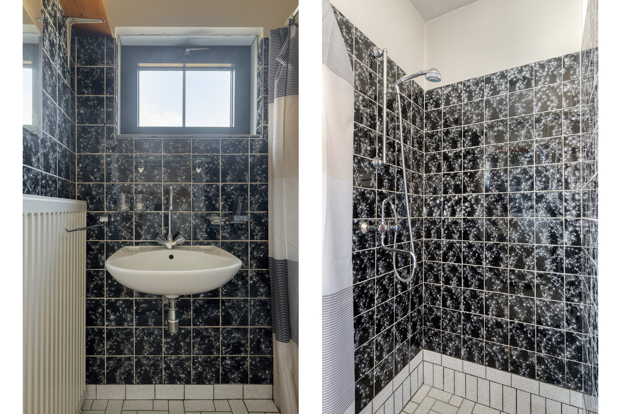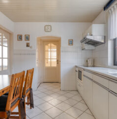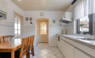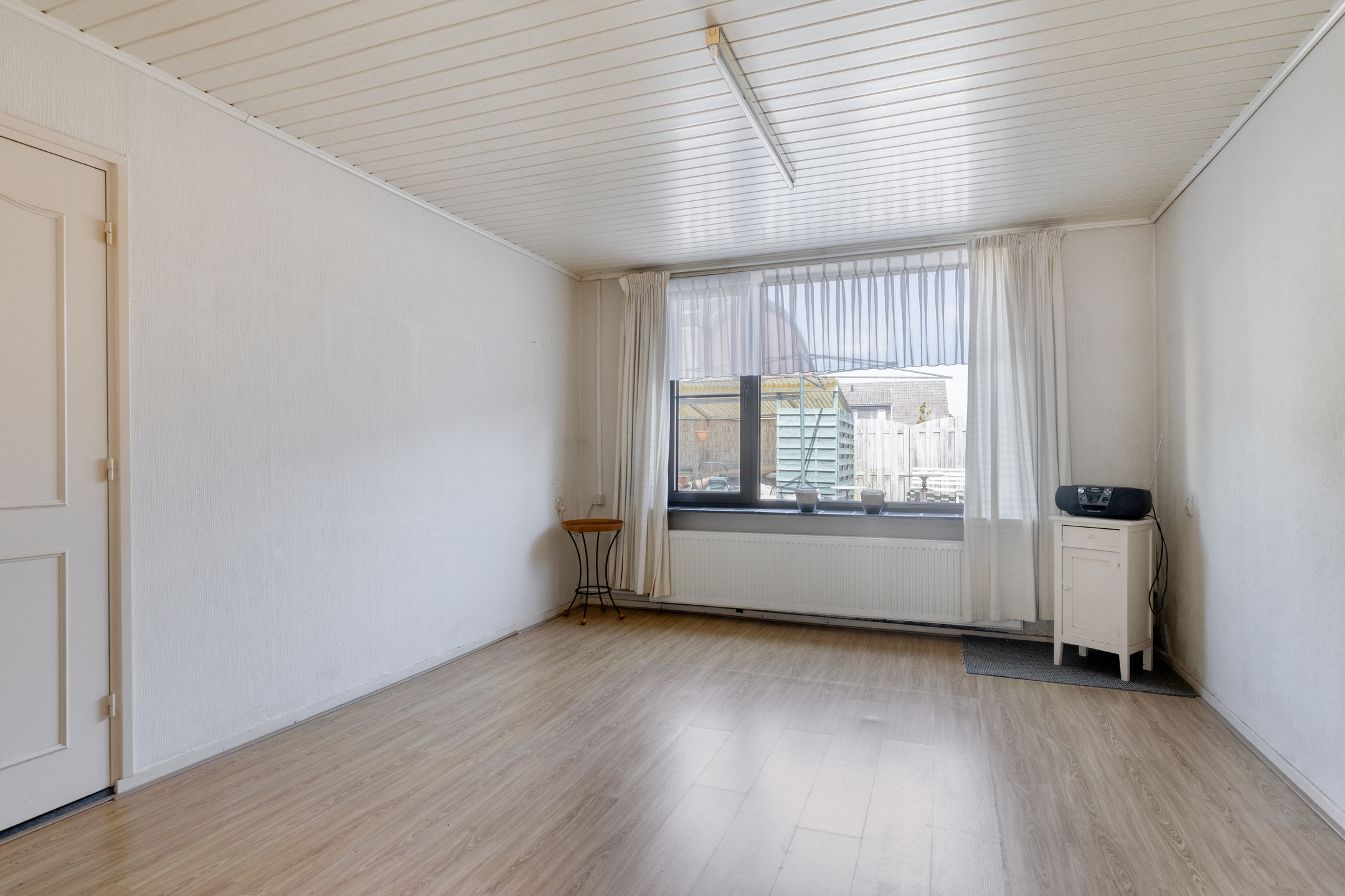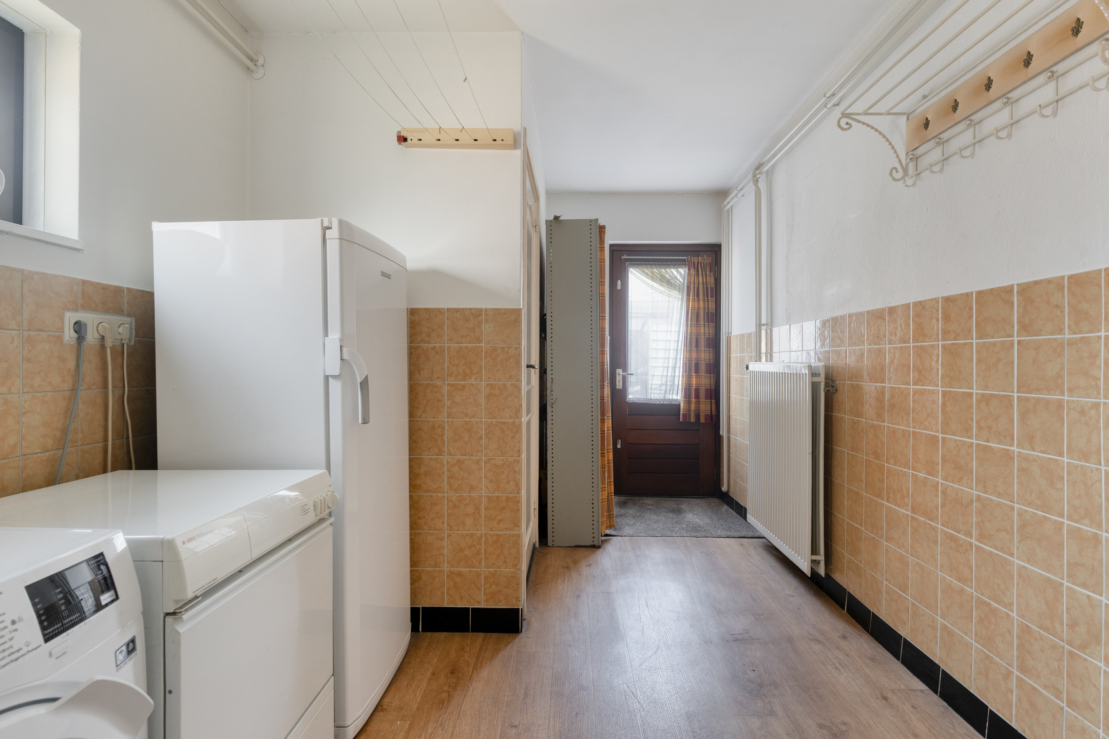 Aangrenzend bevindt zich de bijkeuken met aansluitingen voor witgoed en de badkamer, voorzien van een douche en wastafel. Vanuit de bijkeuken heeft u tevens toegang tot de tuin.
