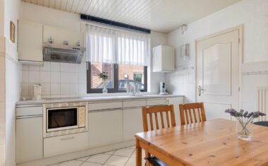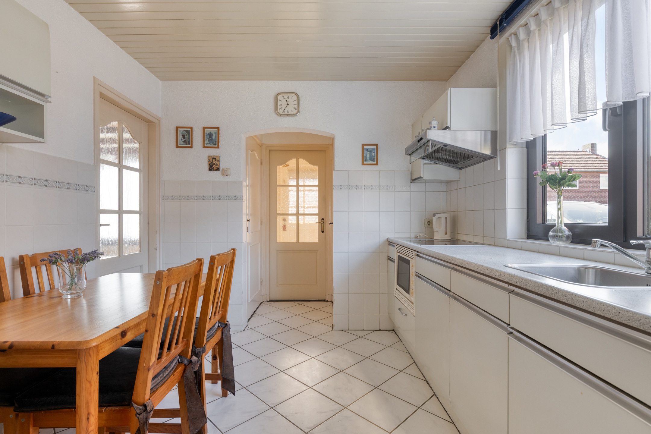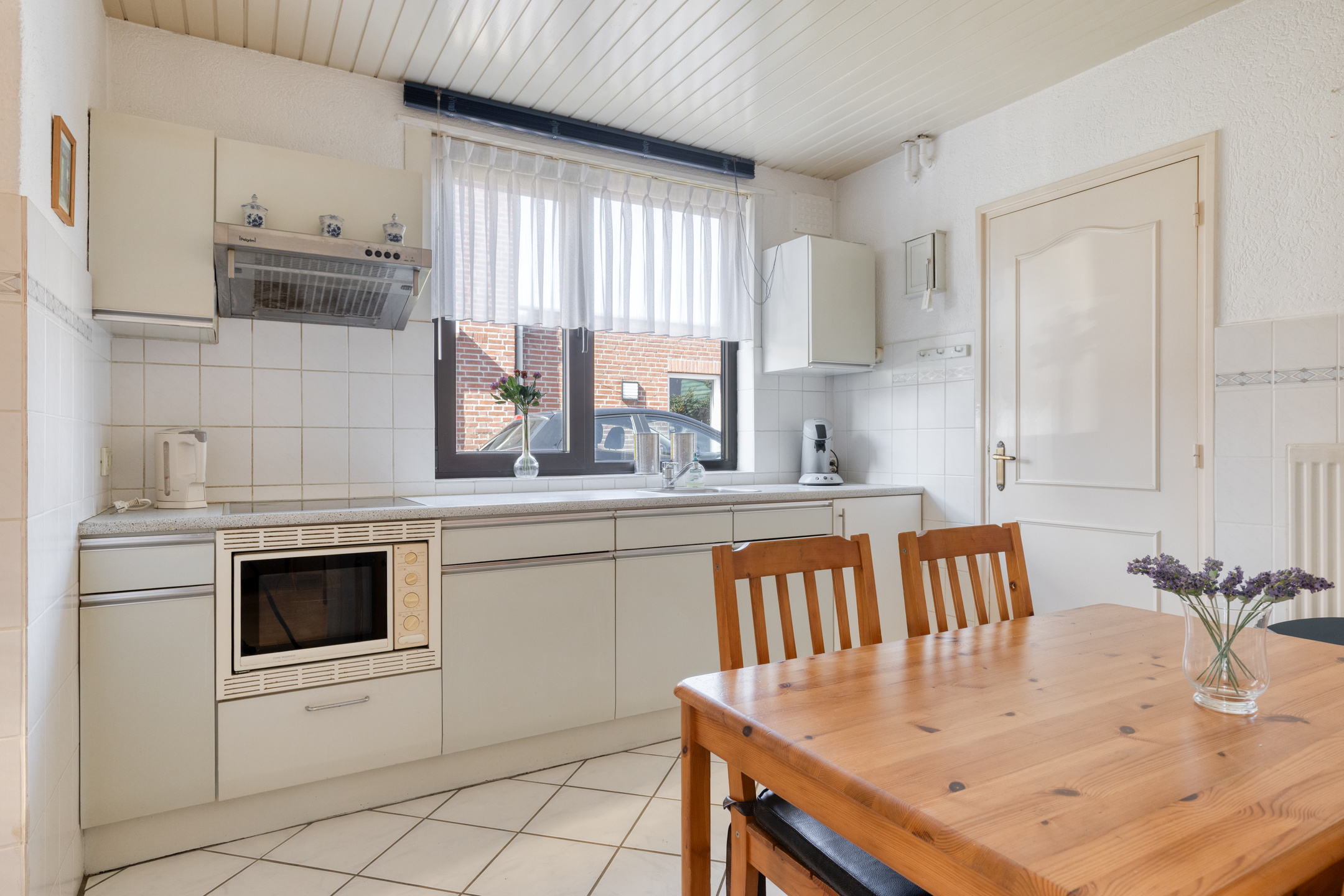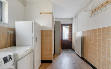 Aangrenzend bevindt zich de bijkeuken met aansluitingen voor witgoed en de badkamer, voorzien van een douche en wastafel. Vanuit de bijkeuken heeft u tevens toegang tot de tuin.