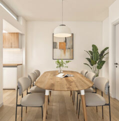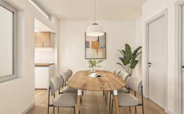 De open keuken bevindt zich aan de achterzijde van de woning en is uitgerust met een keramische kookplaat, ingebouwde oven, vaatwasser en koelkast.