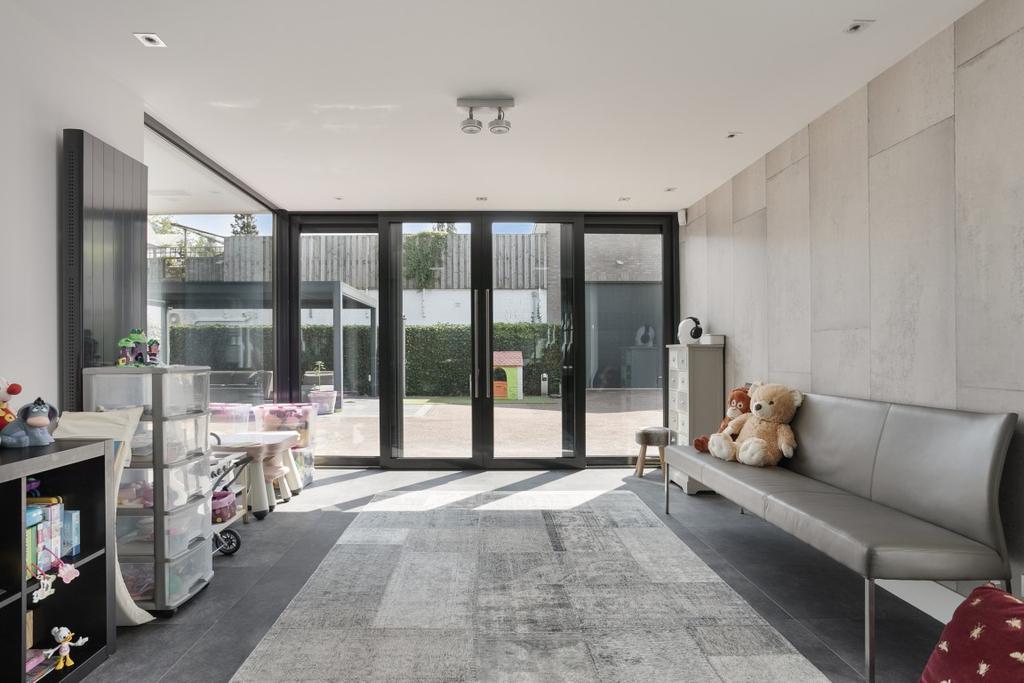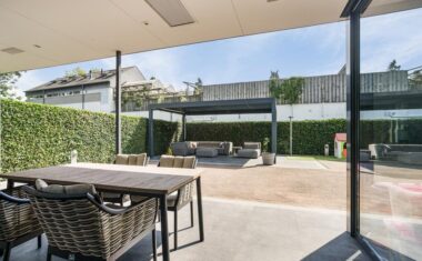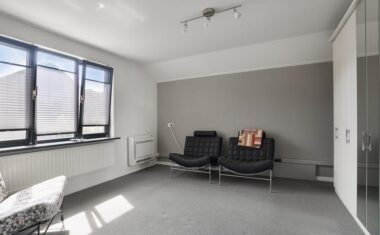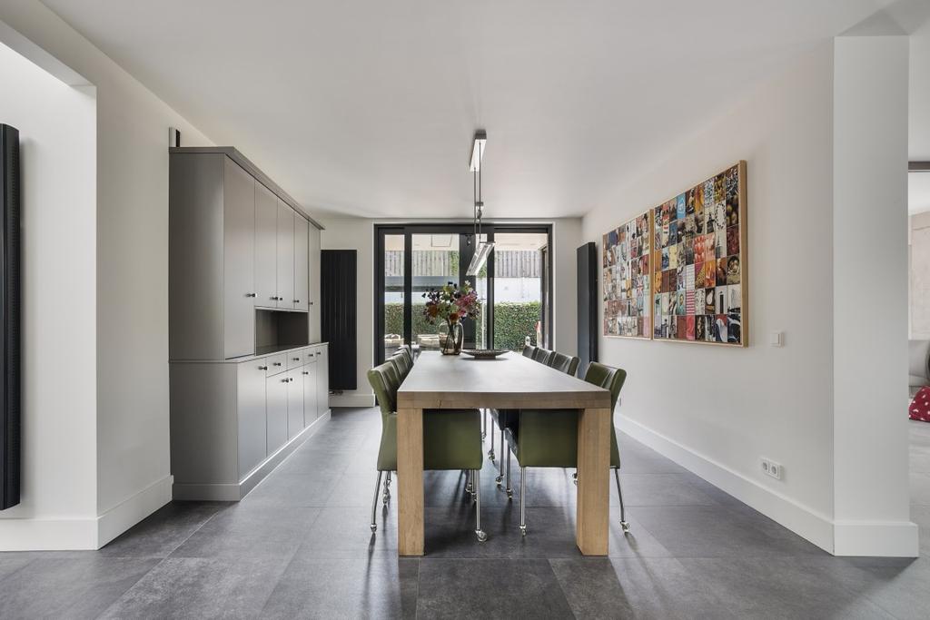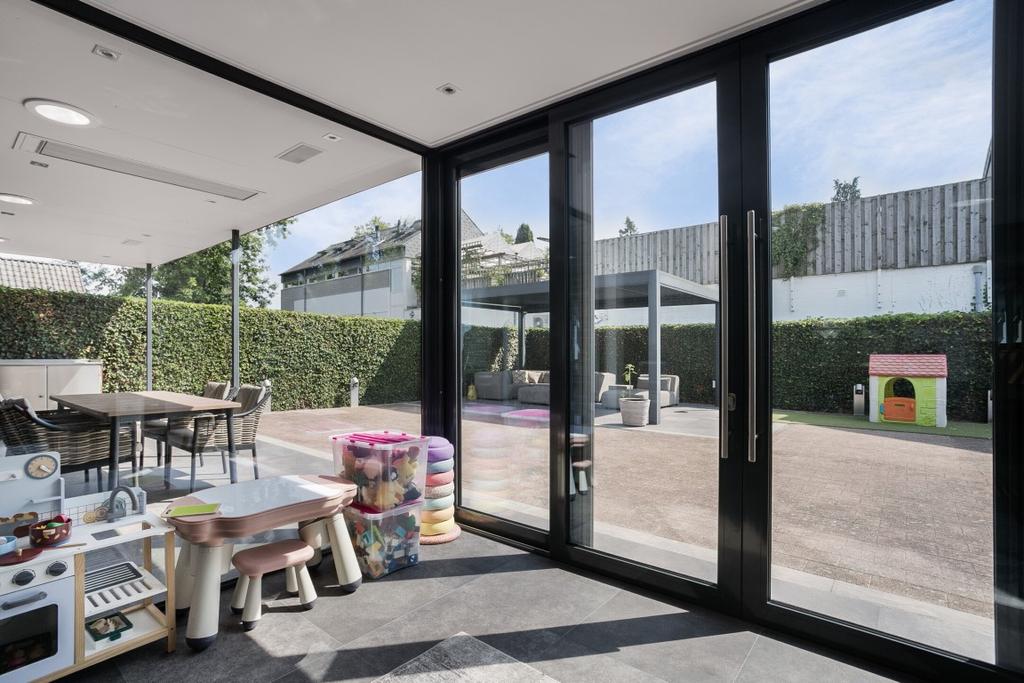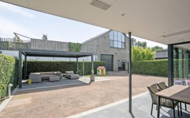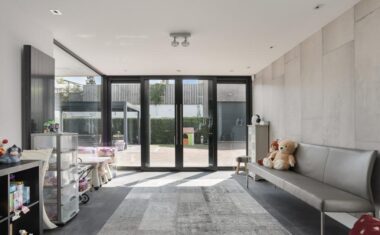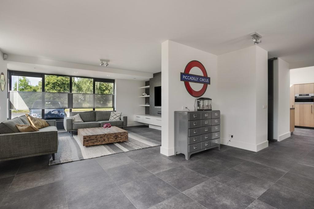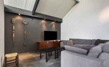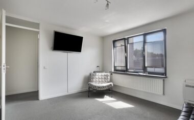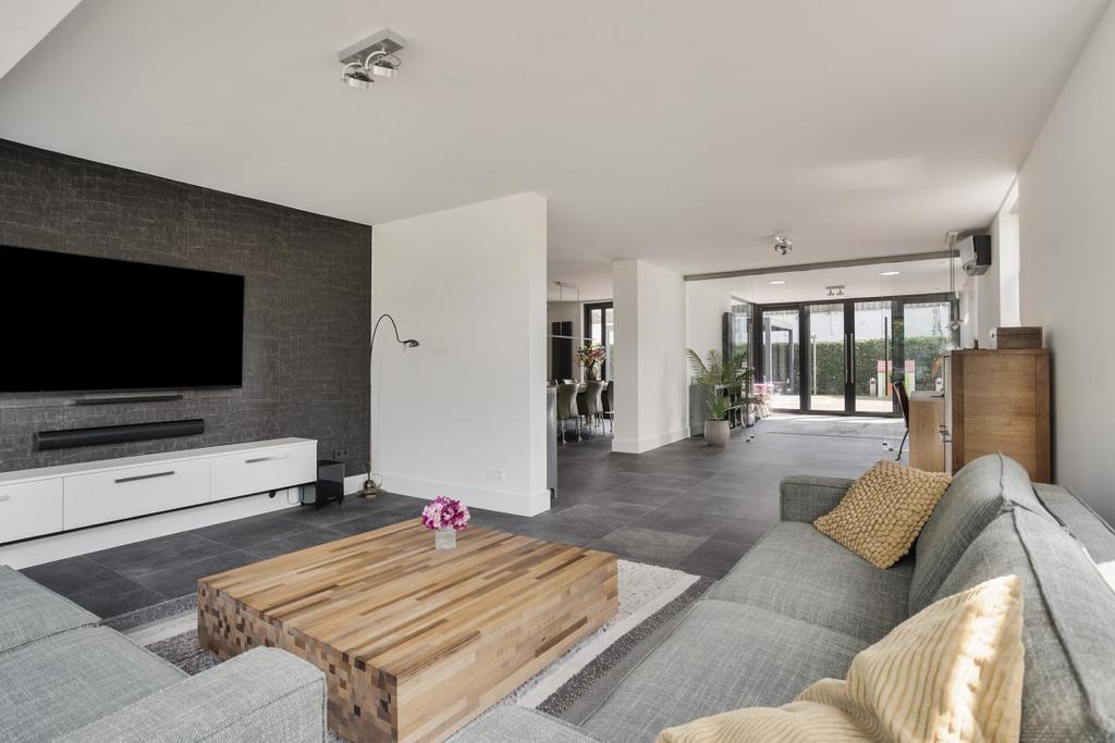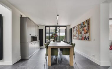 De woonkamer is het hart van de woning. Door de grote raampartijen stroomt het natuurlijke licht naar binnen, waardoor de ruimte nog groter en lichter aanvoelt. De open indeling biedt talloze mogelijkheden om de kamer naar eigen wens in te richten. De strakke afwerking geeft de ruimte een moderne uitstraling en de schuifdeuren naar de tuinkamer/serre zorgen voor een perfecte verbinding tussen binnen en buiten.