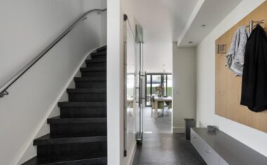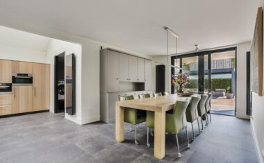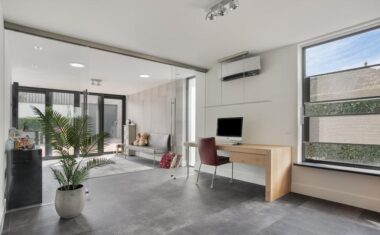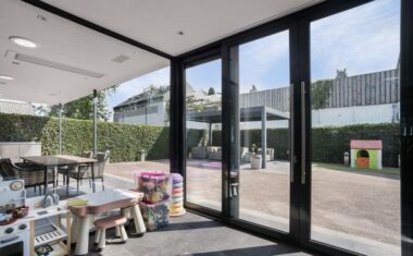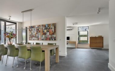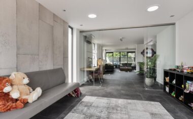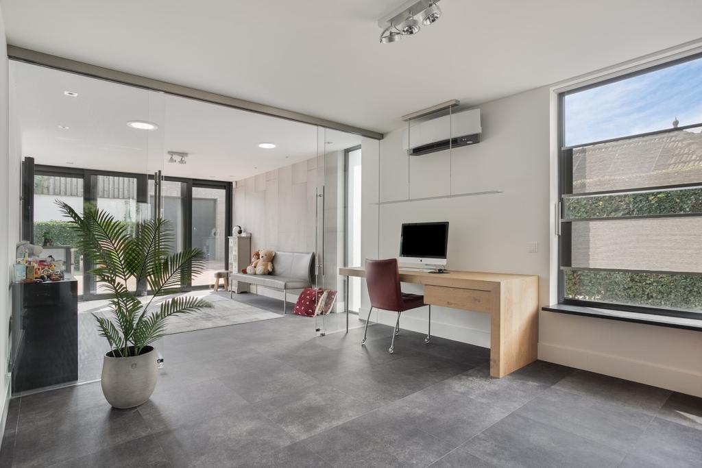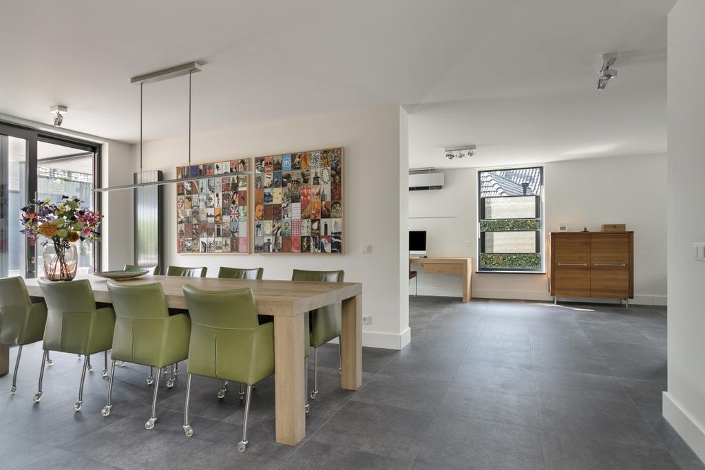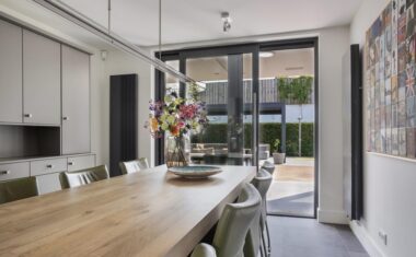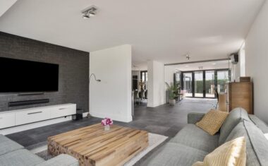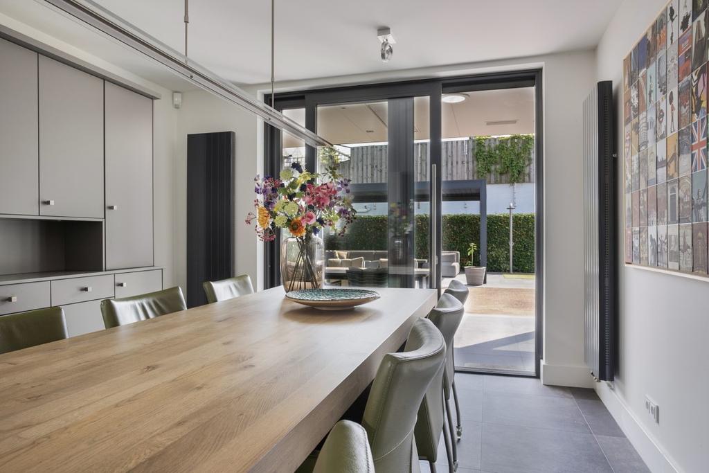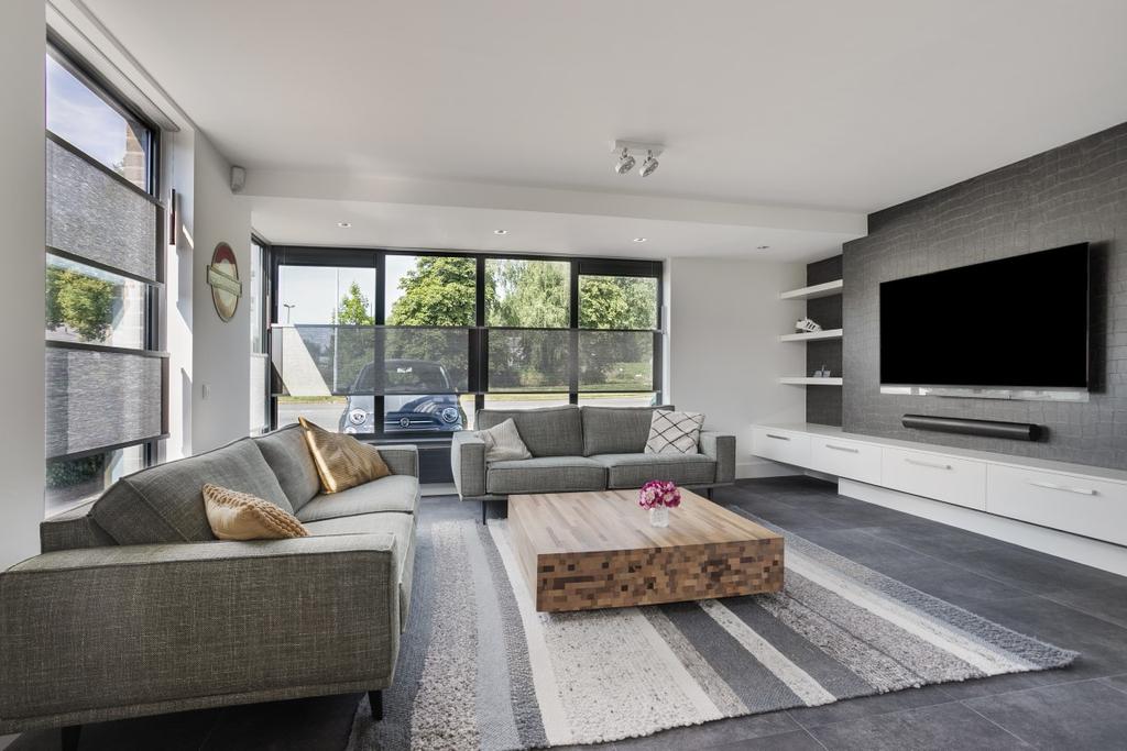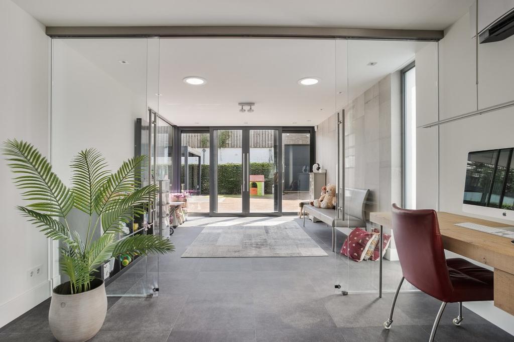 De woonkamer is het hart van de woning. Door de grote raampartijen stroomt het natuurlijke licht naar binnen, waardoor de ruimte nog groter en lichter aanvoelt. De open indeling biedt talloze mogelijkheden om de kamer naar eigen wens in te richten. De strakke afwerking geeft de ruimte een moderne uitstraling en de schuifdeuren naar de tuinkamer/serre zorgen voor een perfecte verbinding tussen binnen en buiten.