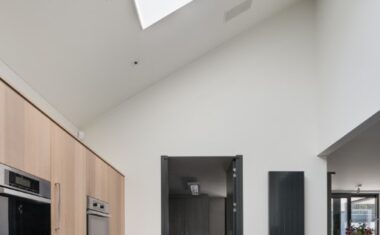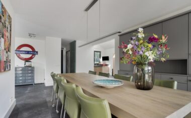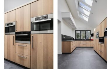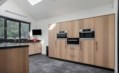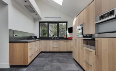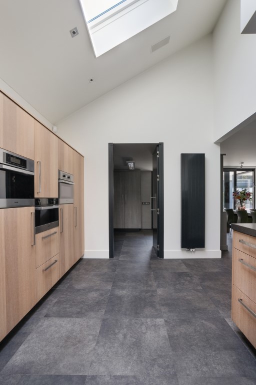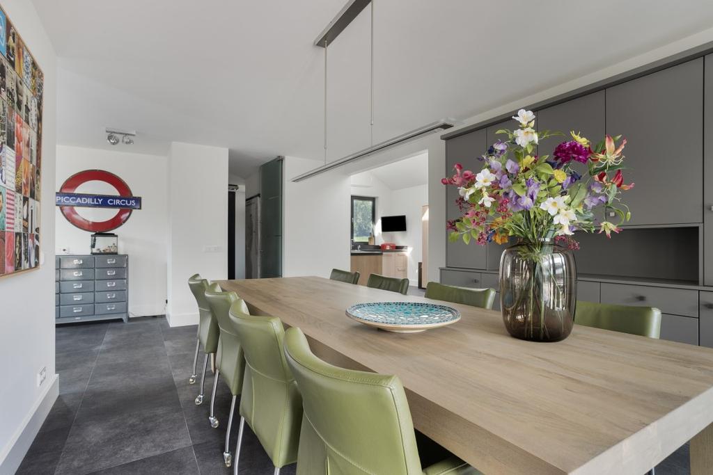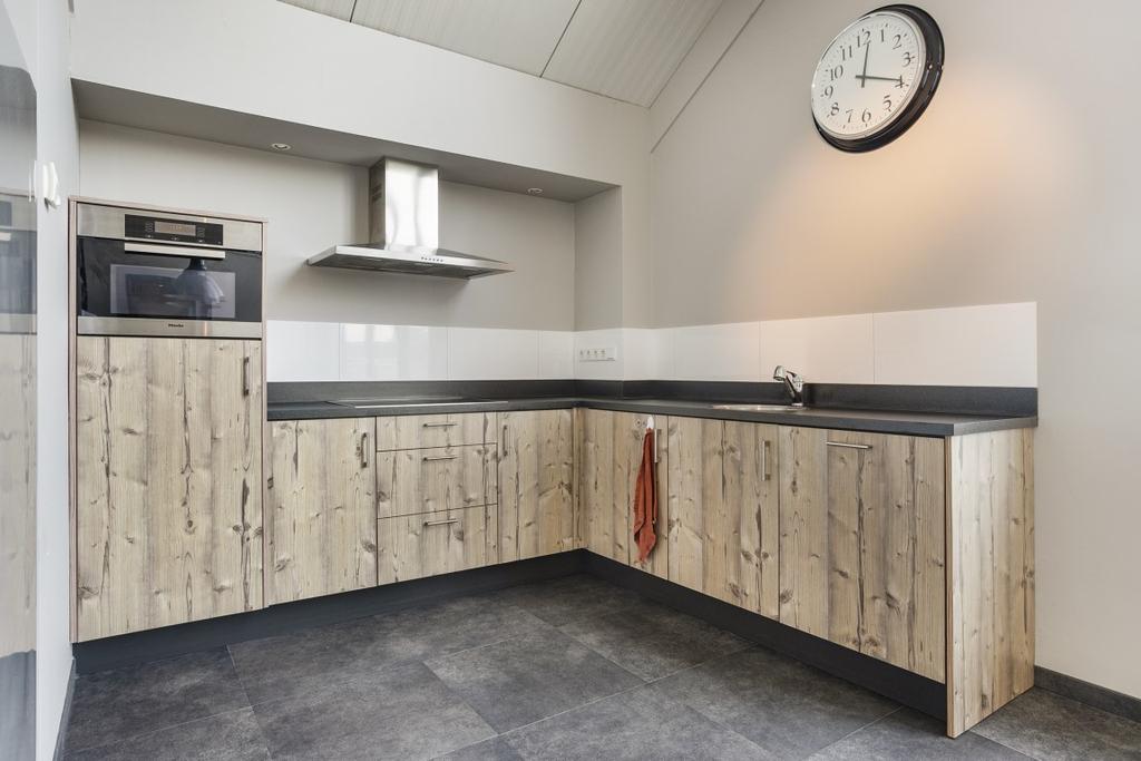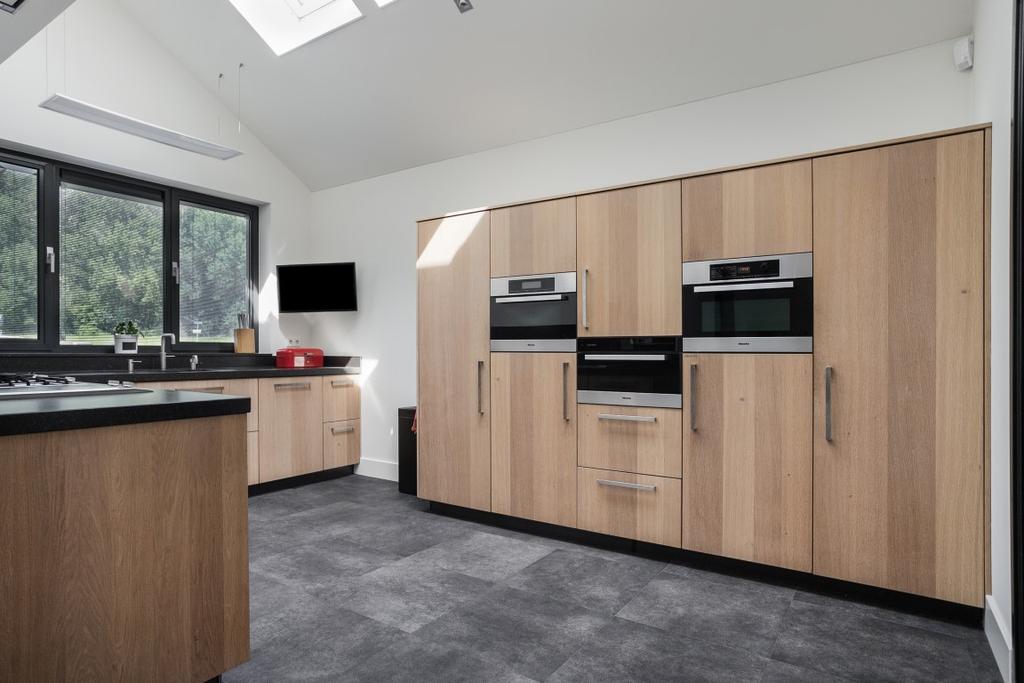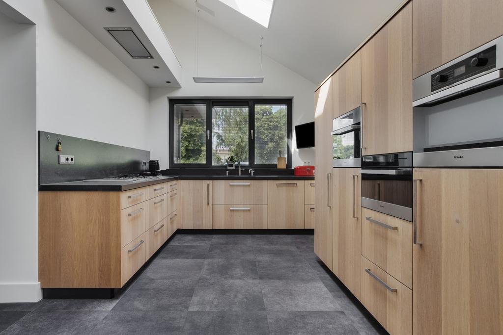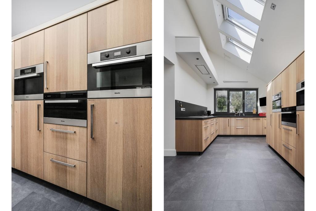 Grenzend aan de woonkamer bevindt zich de moderne leefkeuken. Het L-vormige aanrecht biedt niet alleen een royaal werkblad, maar ook volop opbergmogelijkheden. Met een alle denkbare inbouwapparatuur is deze keuken van alle gemakken voorzien. Dankzij de lichtstraat in het dak valt het daglicht prachtig binnen.