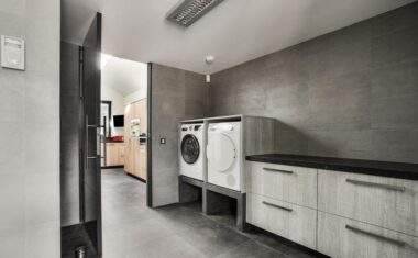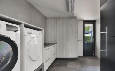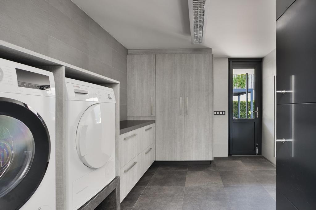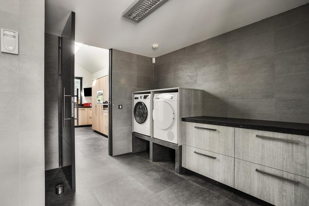 In het verlengde van de keuken bevindt zich de praktische wasruimte, die perfect dienstdoet als bijkeuken. Deze ruimte biedt meer dan genoeg opbergmogelijkheden en is ideaal voor het plaatsen van je wasmachine en droger. Bovendien grenst deze ruimte aan de tuin.