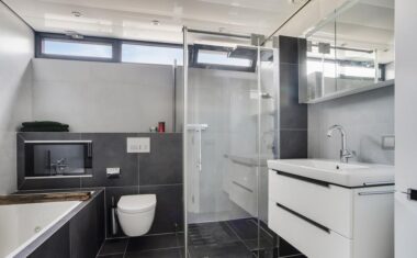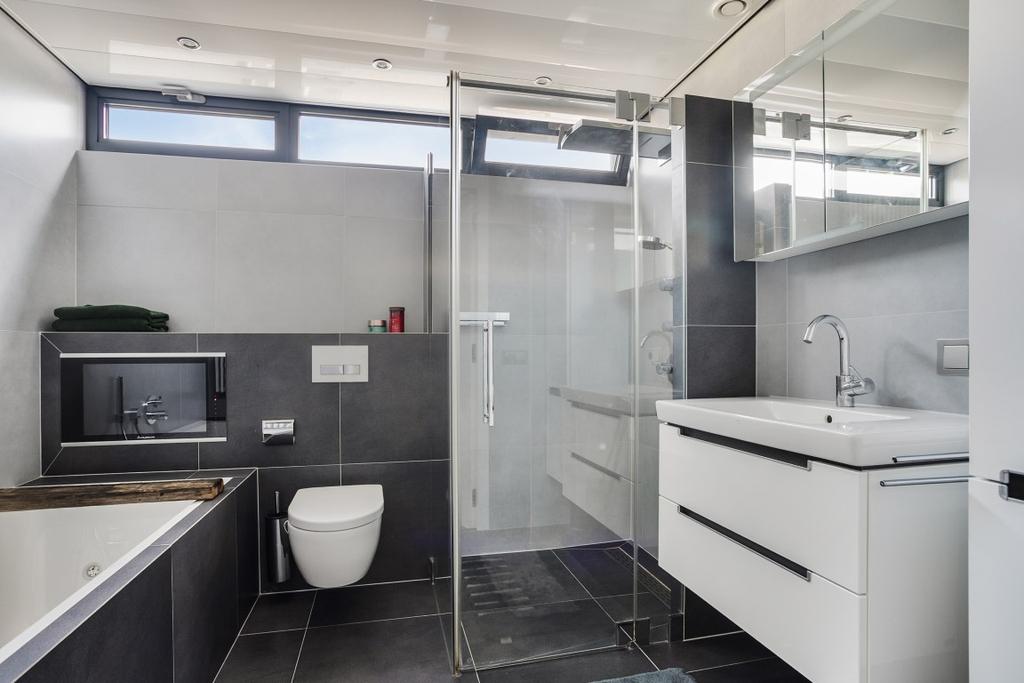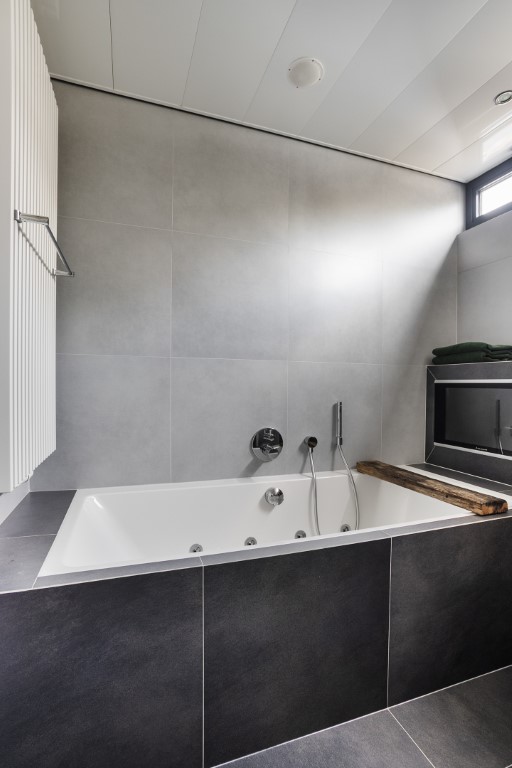 – luxe badkamer met vloerverwarming, inloopdouche, ligbad, toilet en wastafelmeubel.