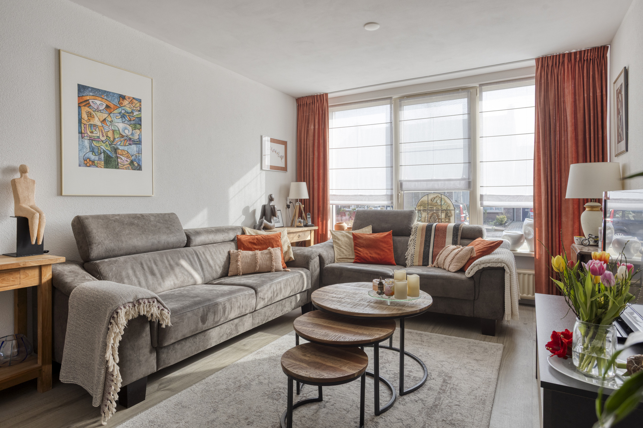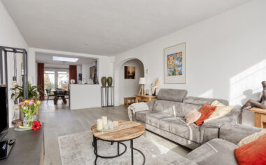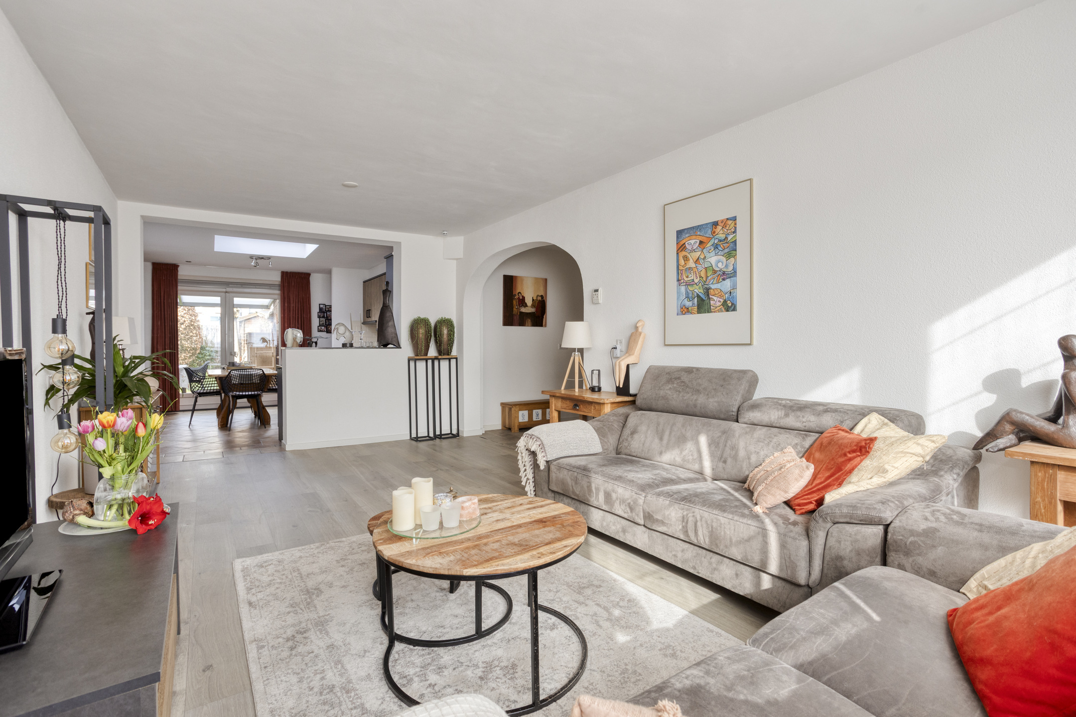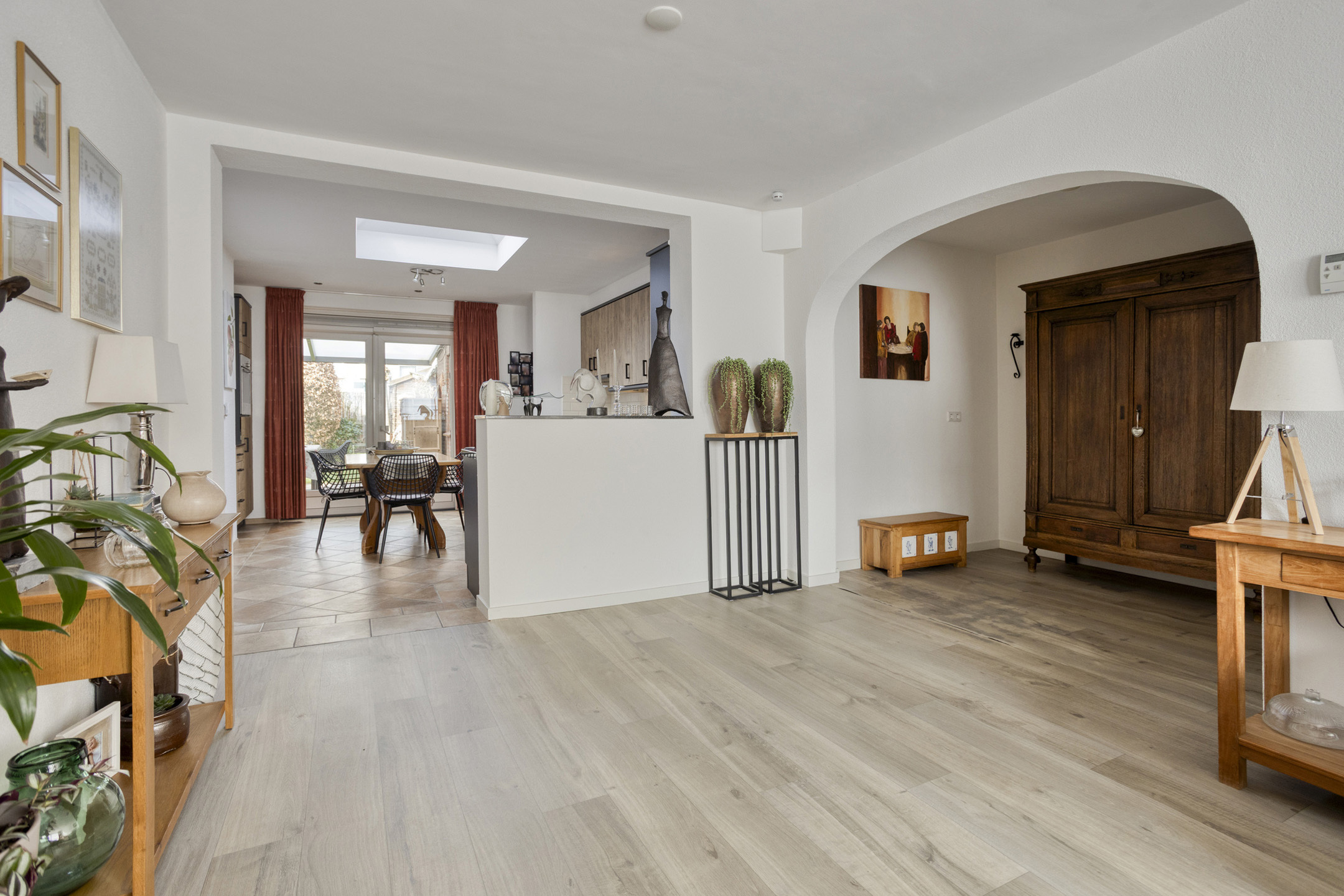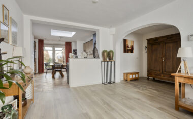 Via de entree kom je in de hal met meterkast, toilet, kelderkast en trapopgang naar de eerste verdieping. Vanuit hier loop je door naar de ruime woonkamer. De woonkamer is heerlijk licht en biedt voldoende ruimte voor een royale zithoek en eethoek. De grote raampartijen zorgen voor een prettige verbinding met buiten en een fijne sfeer in huis.