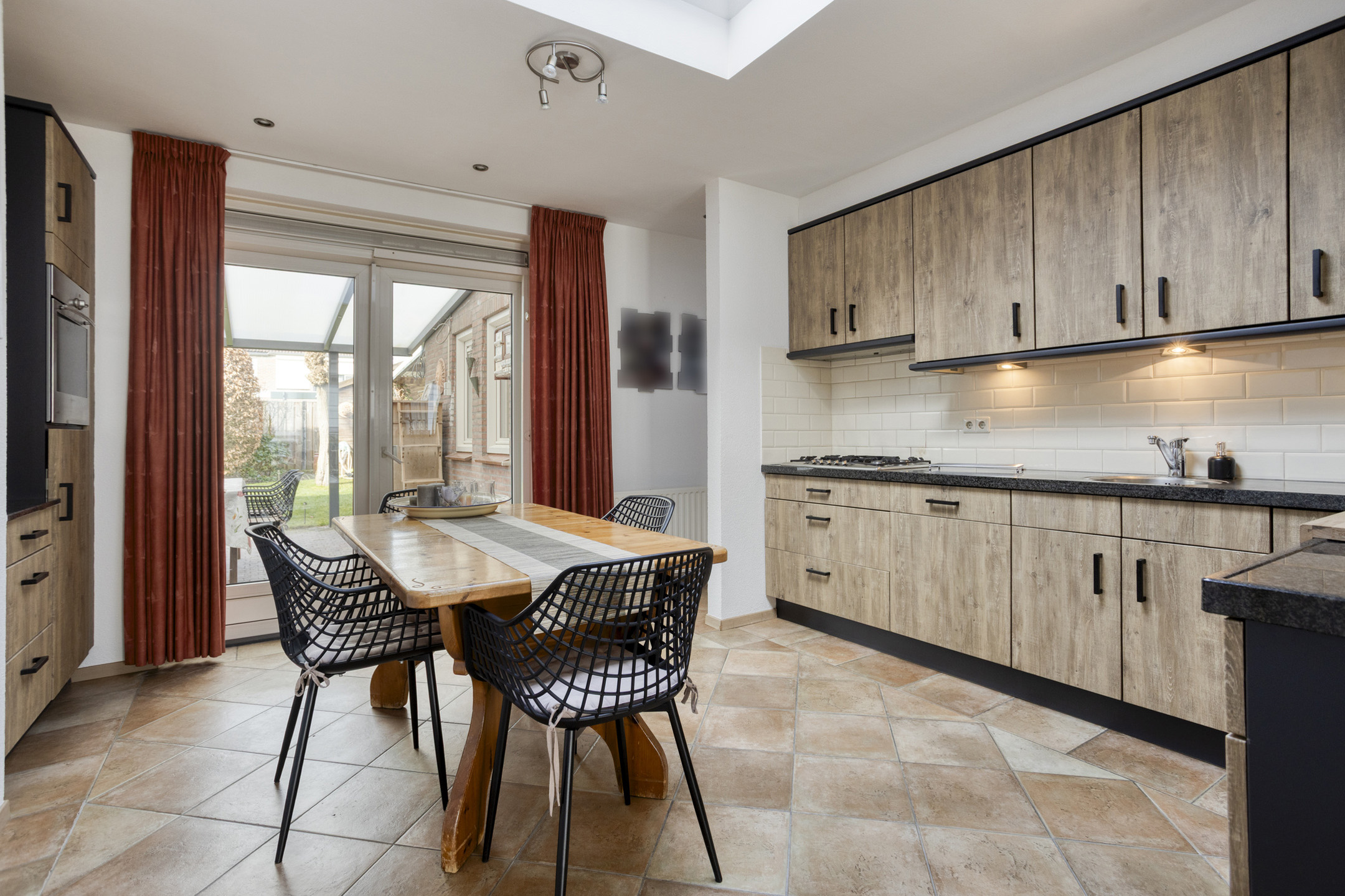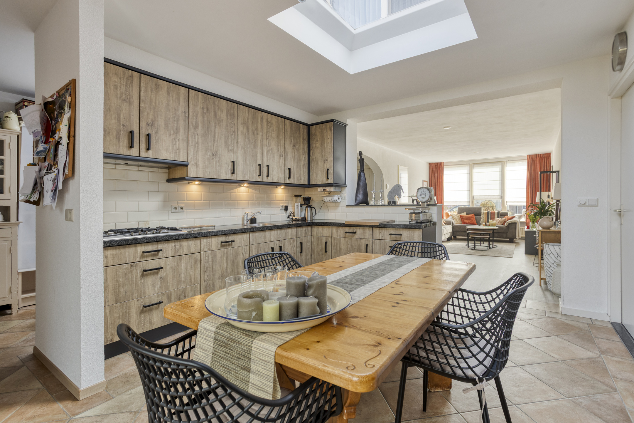 De leefruimte staat in open verbinding met de keuken. De keuken is praktisch ingericht en beschikt over diverse inbouwapparatuur: gaskookplaat, afzuigkap, oven, koelkast en vaatwasser.