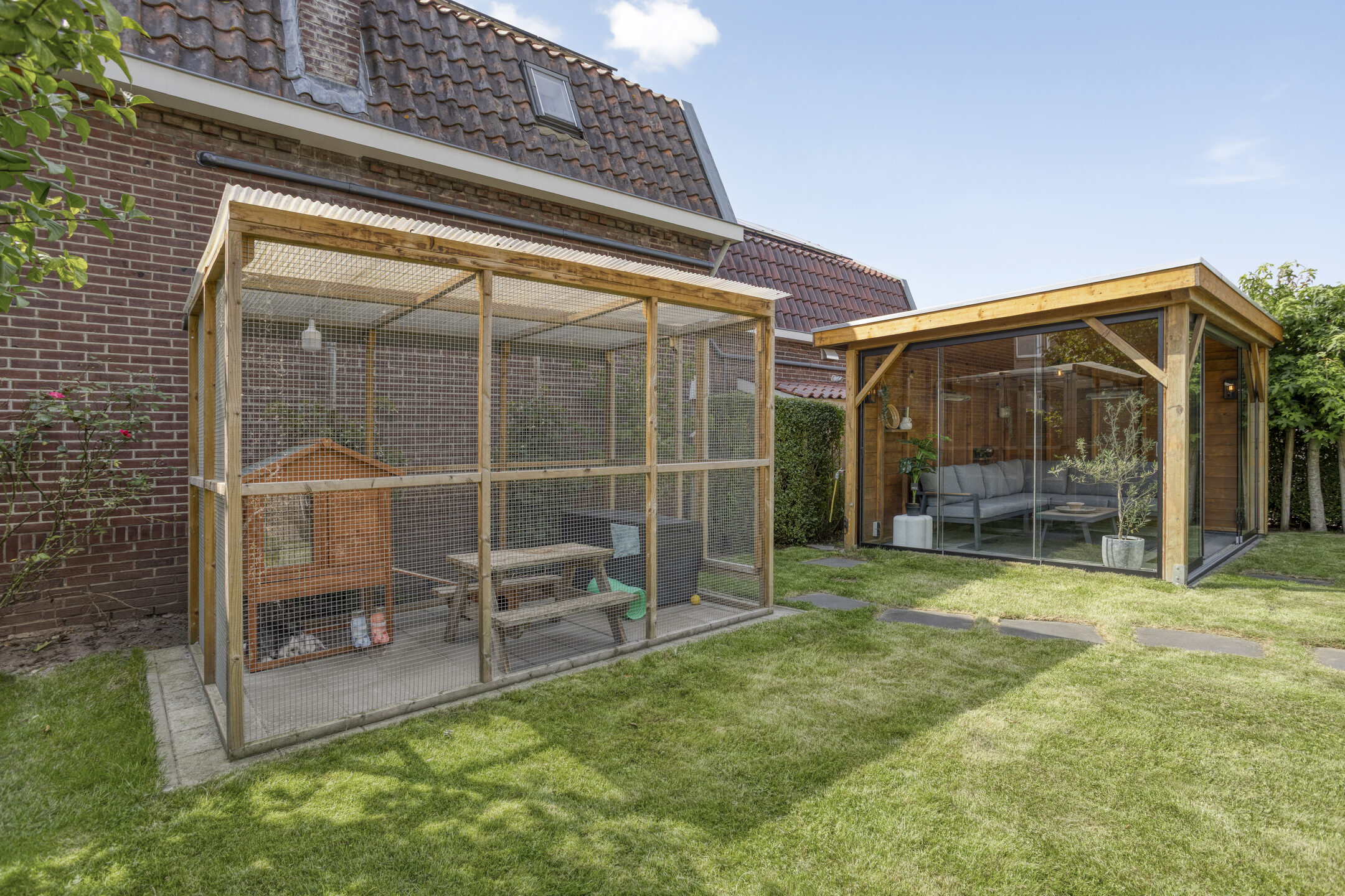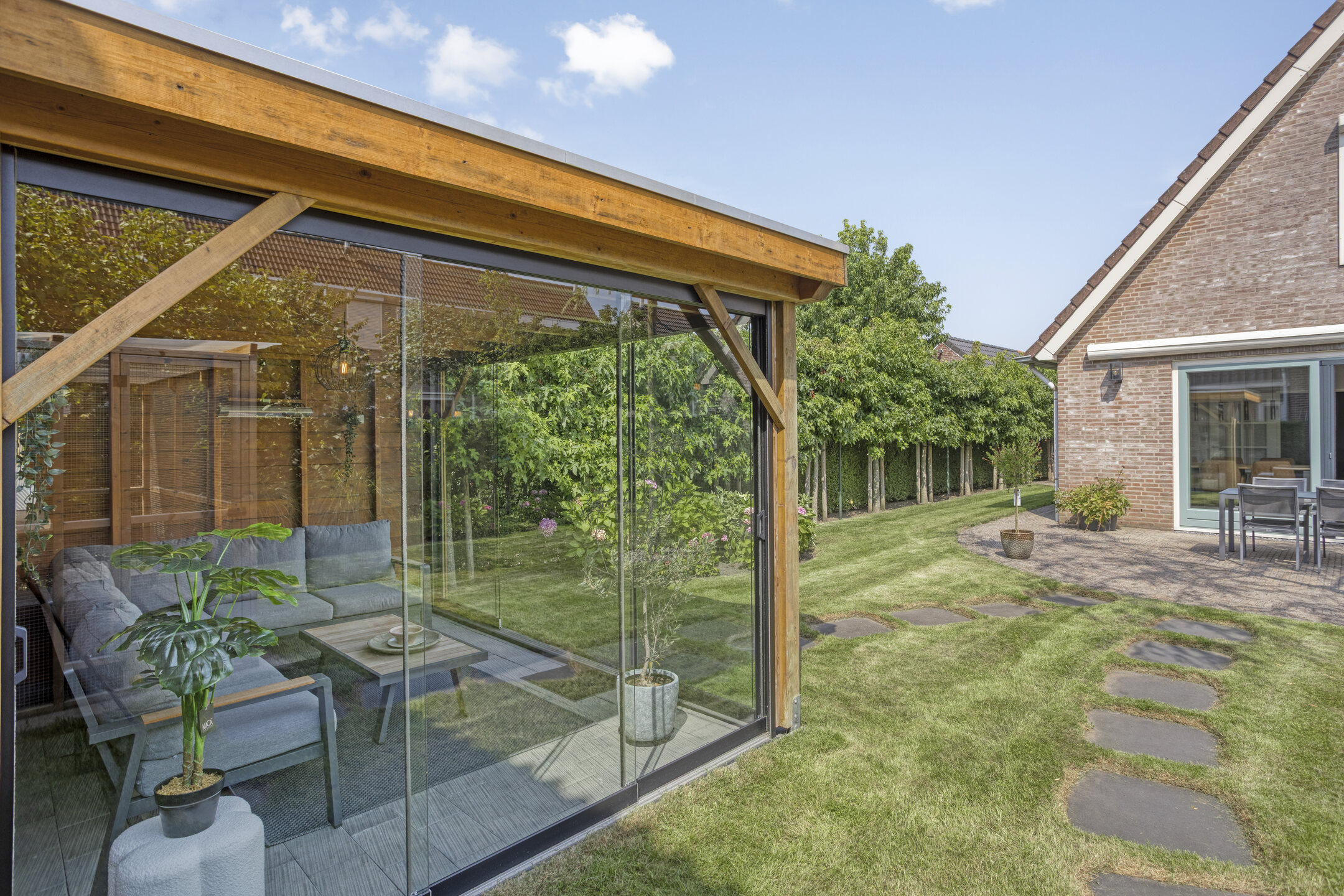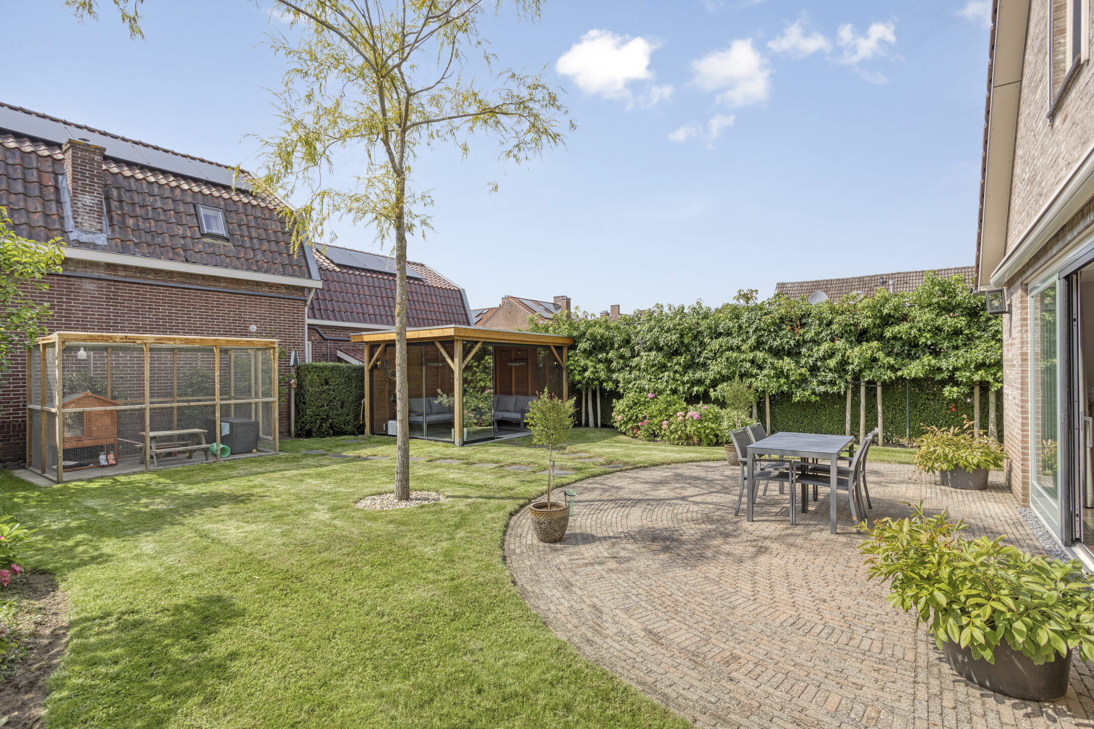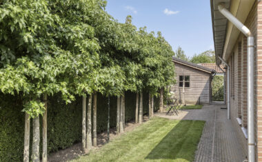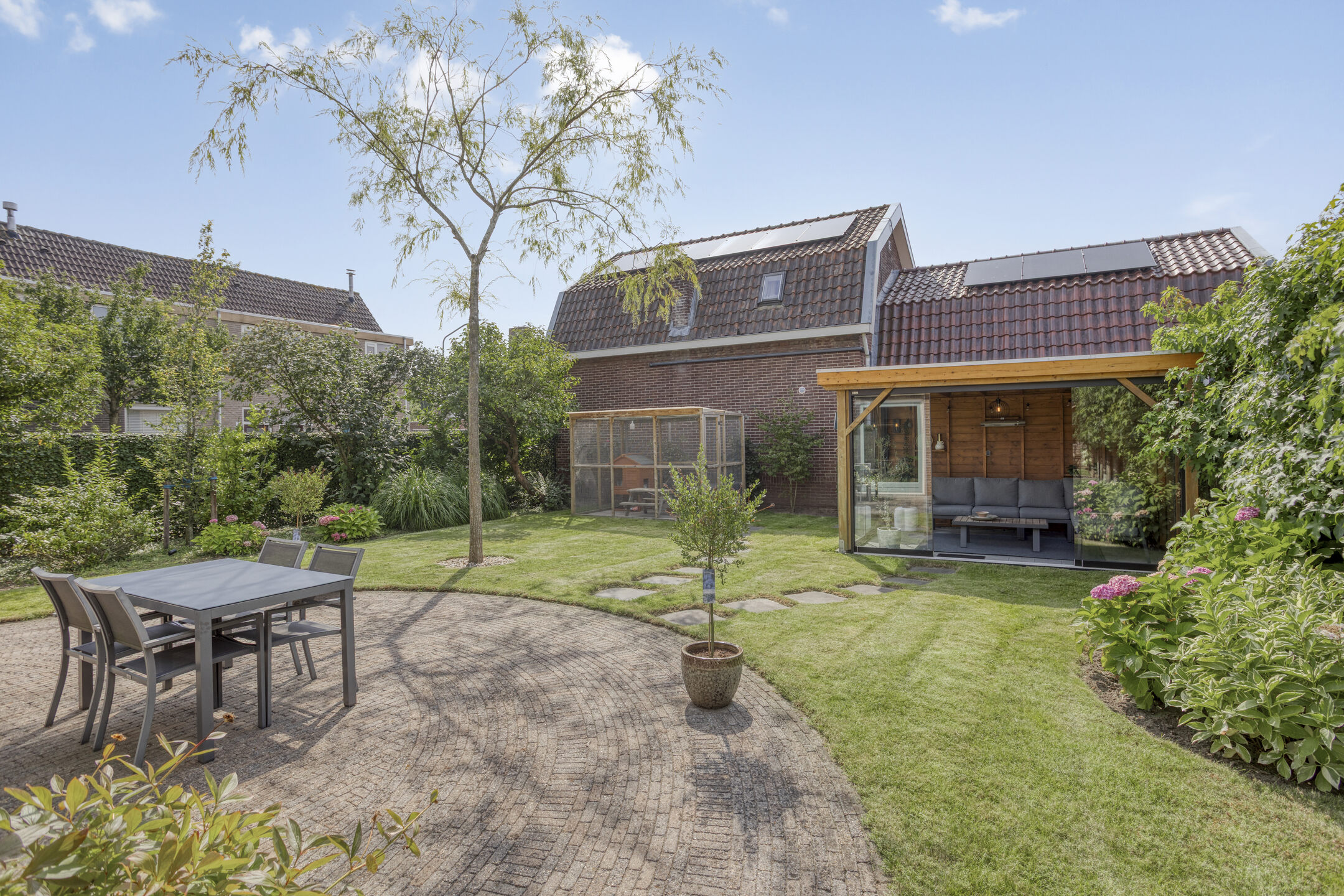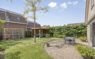 Buitenruimte: De tuin is smaakvol aangelegd met combinatie van groen en bestrating. Er zijn meerdere zitplekken, waaronder een gezellig terras bij het huis met elektrisch bedienbaar zonnescherm en een tuinkamer met glazen wanden waar je het hele jaar door kunt genieten.