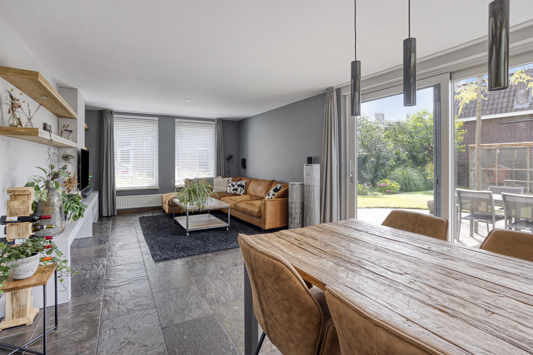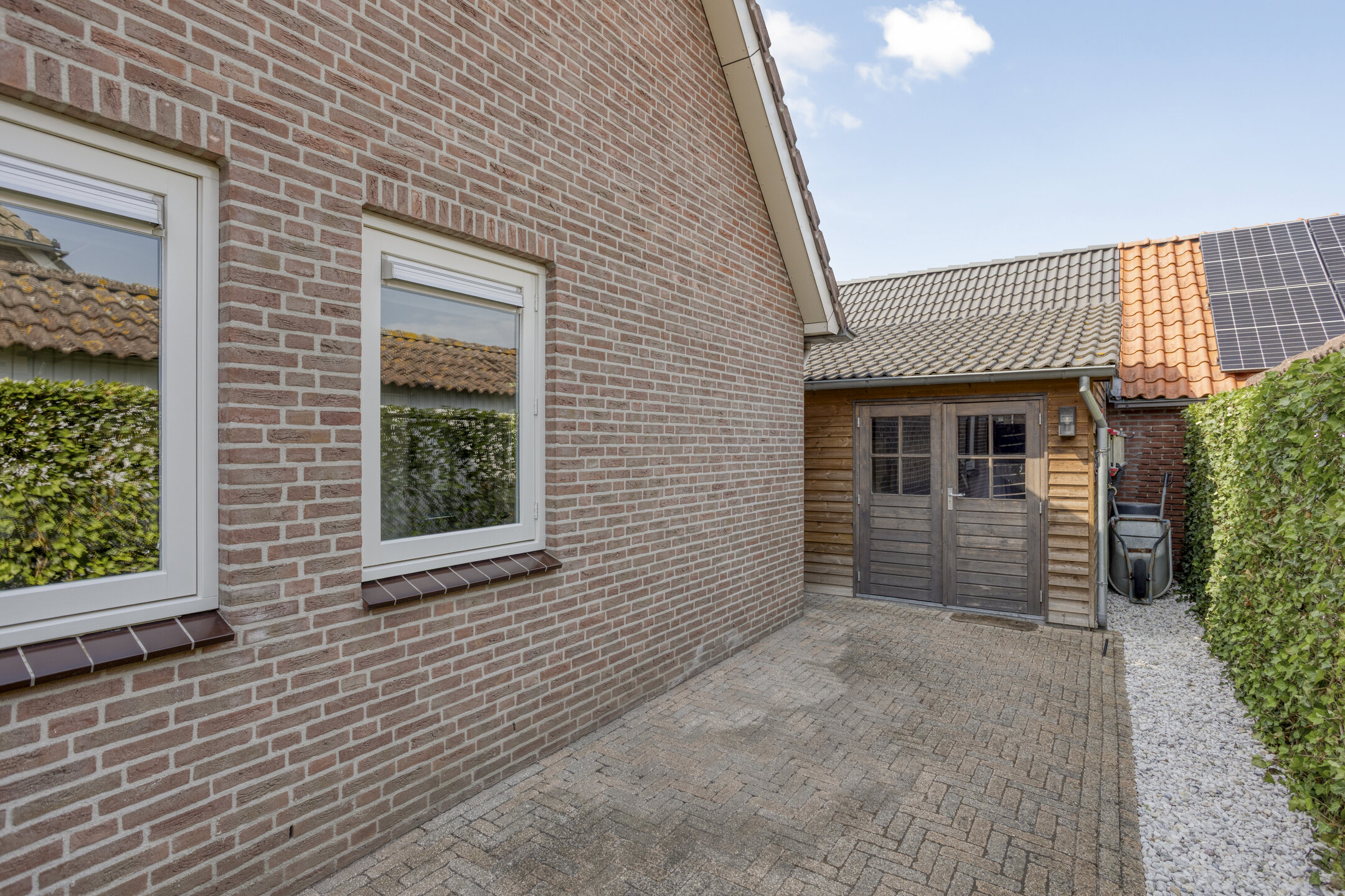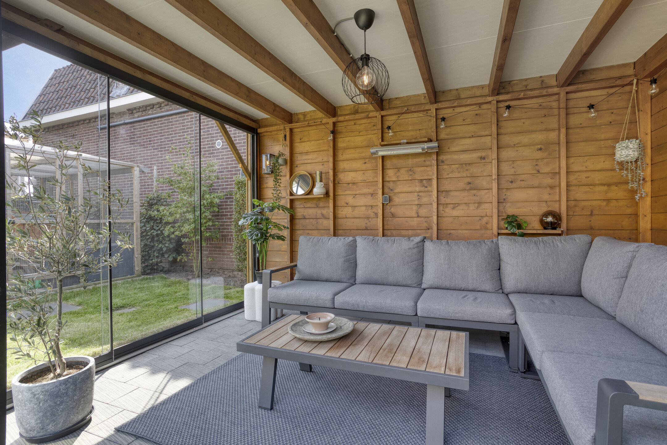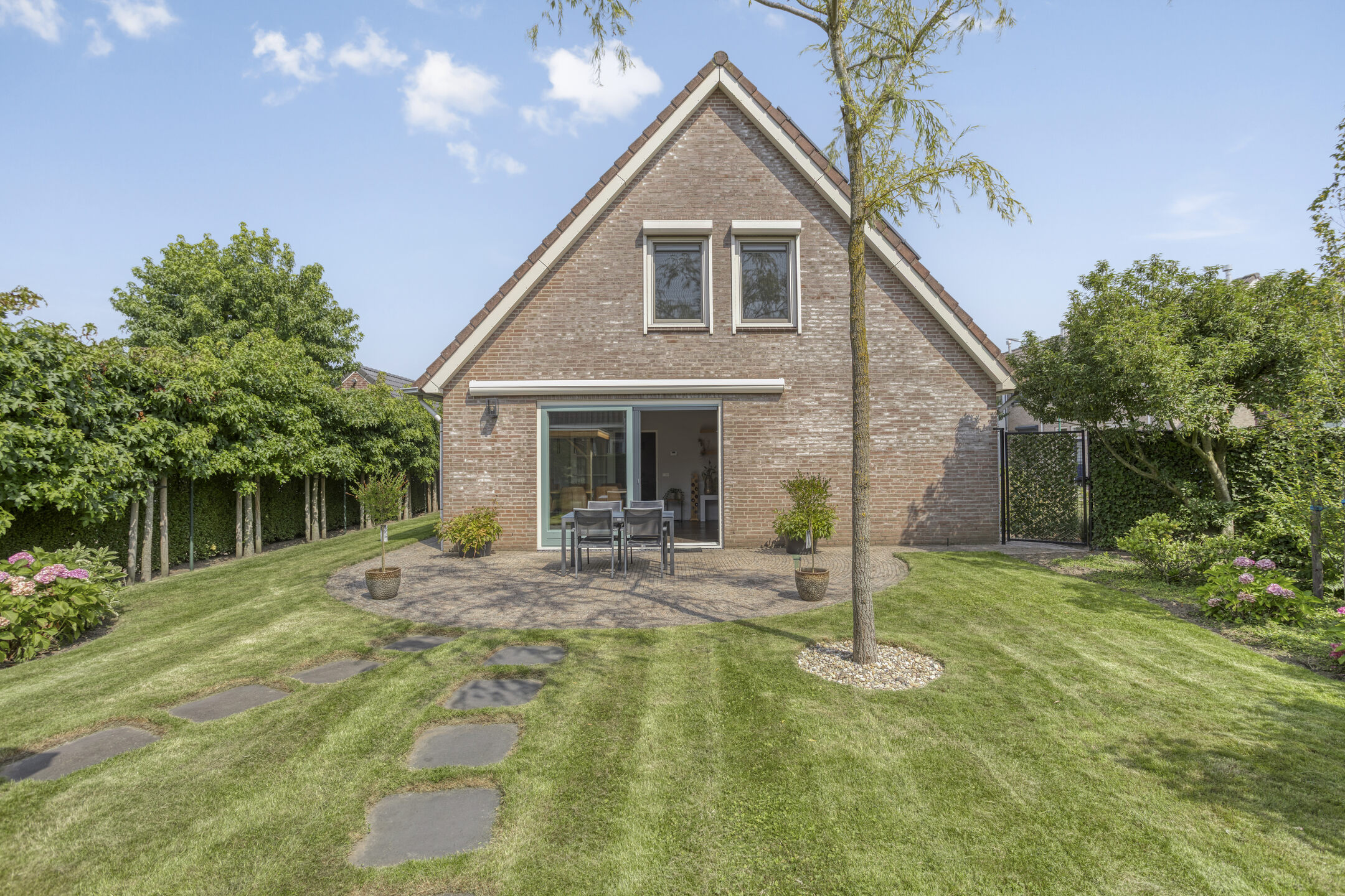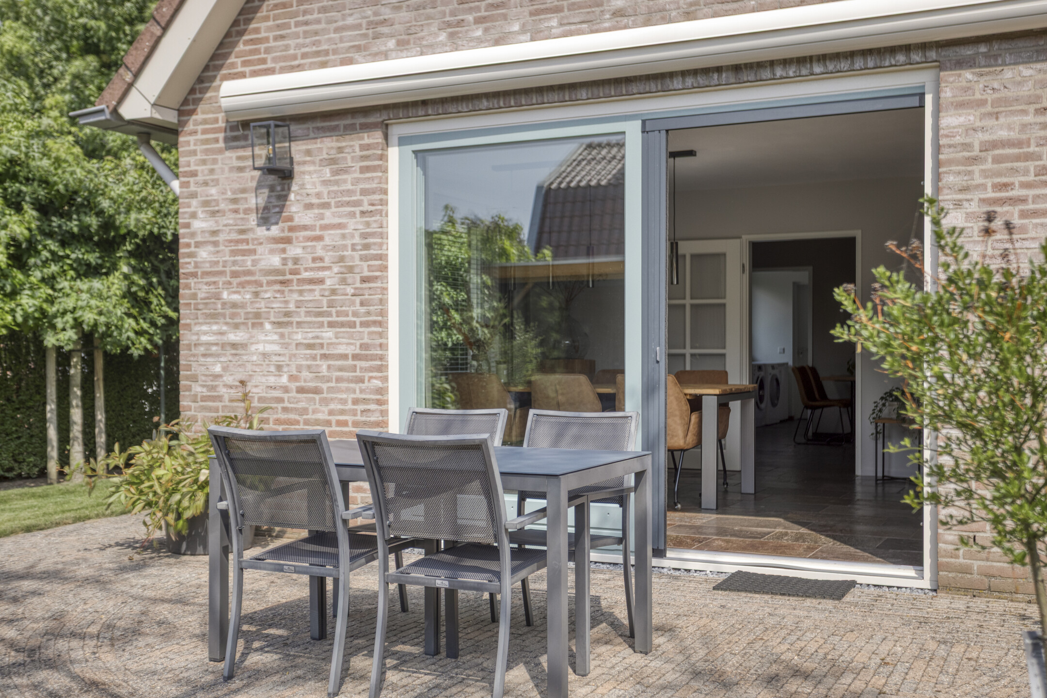 Buitenruimte: De tuin is smaakvol aangelegd met combinatie van groen en bestrating. Er zijn meerdere zitplekken, waaronder een gezellig terras bij het huis met elektrisch bedienbaar zonnescherm en een tuinkamer met glazen wanden waar je het hele jaar door kunt genieten.