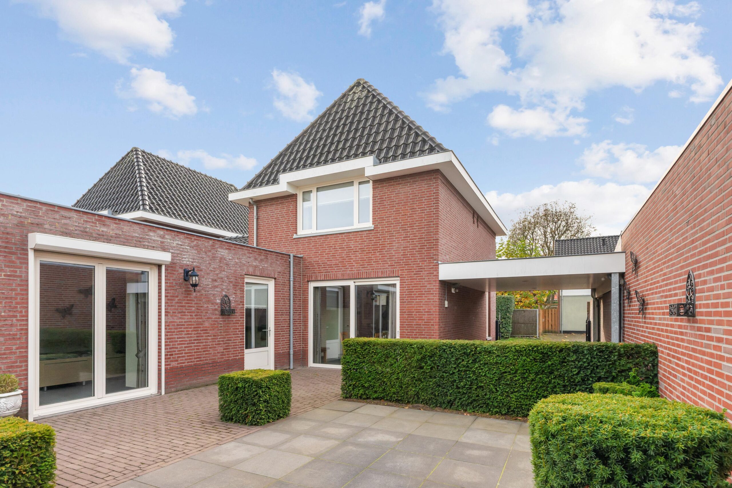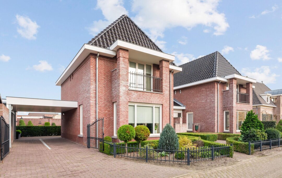 Aan de zijkant van de woning bevindt zich een carport. De tuin voor- en achter biedt veel privacy en ruimte voor zowel zon als schaduw.