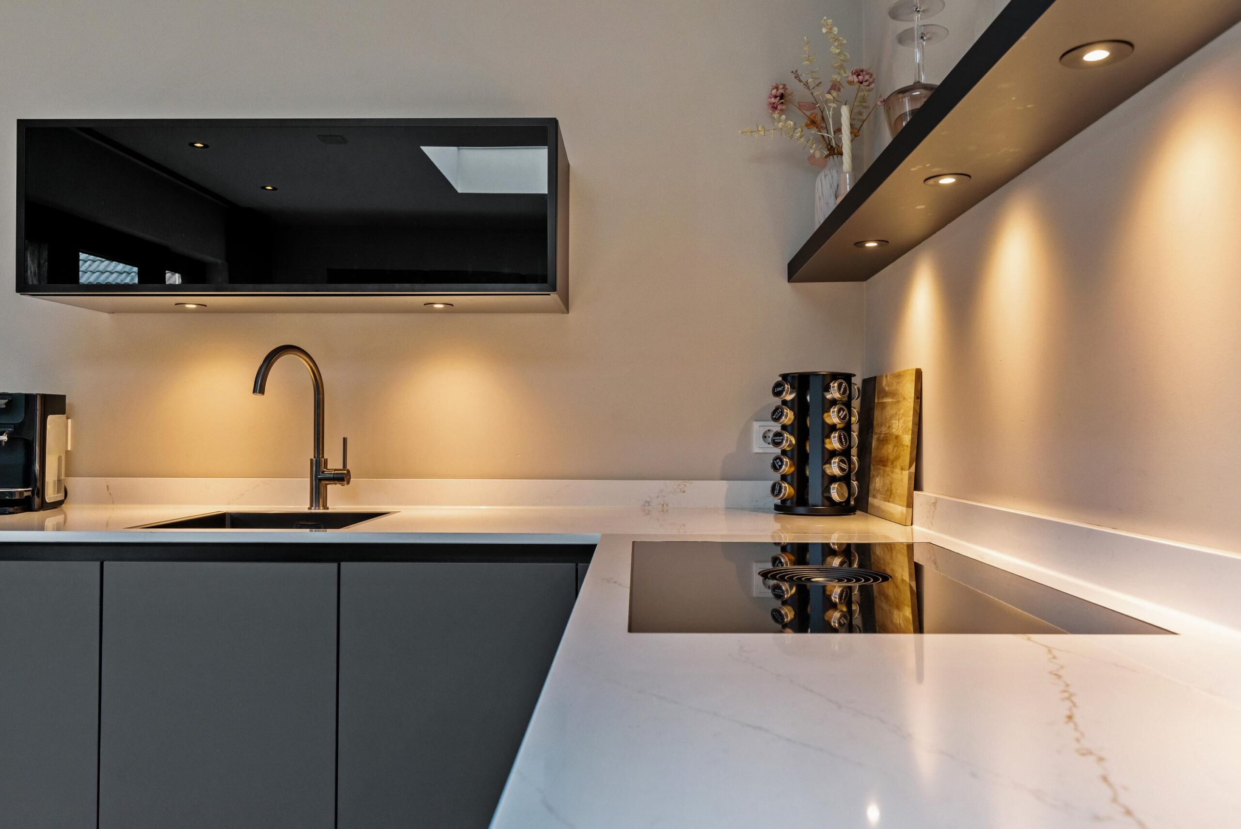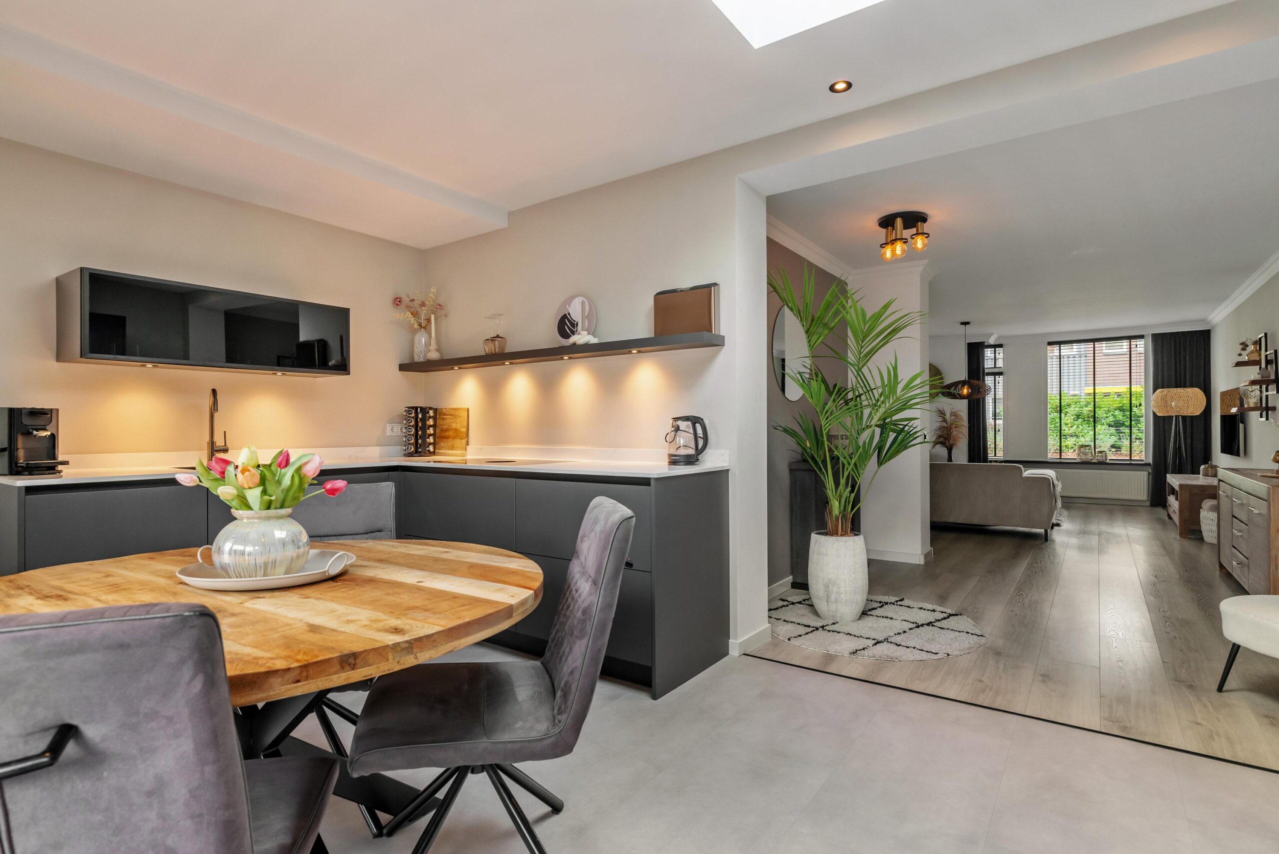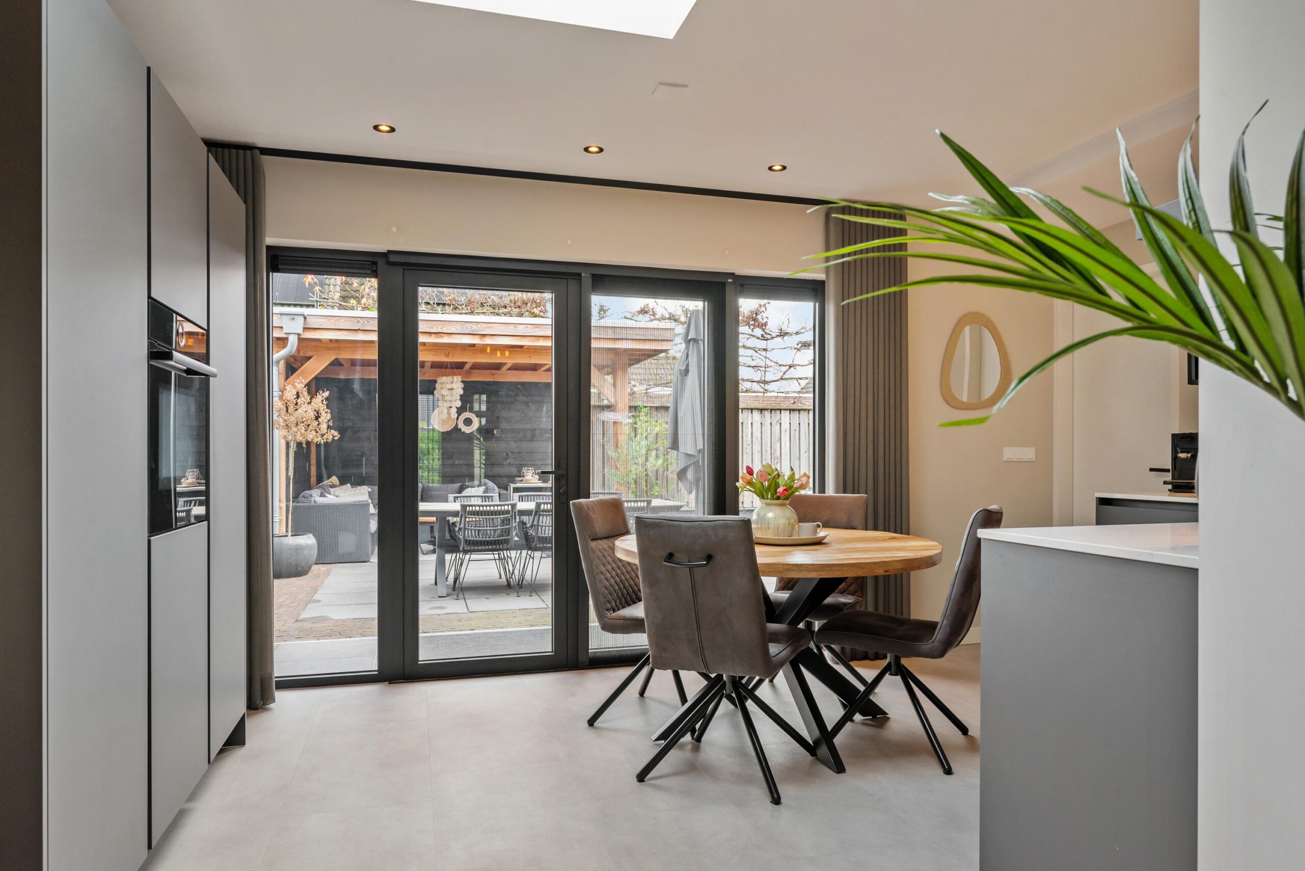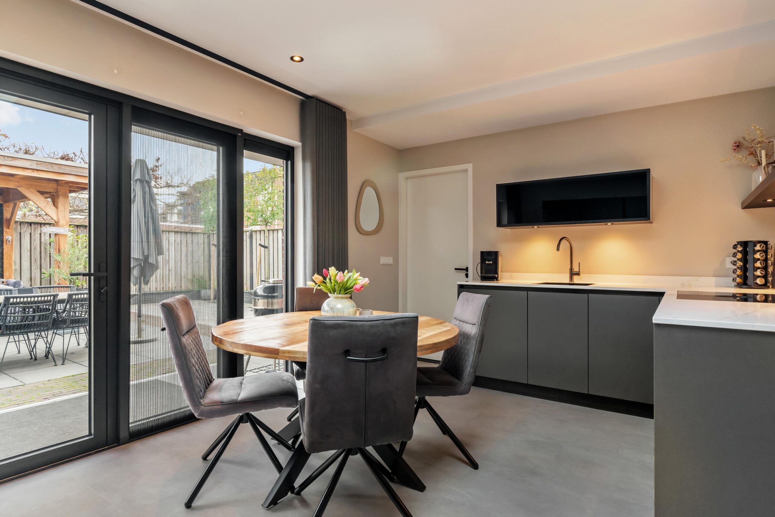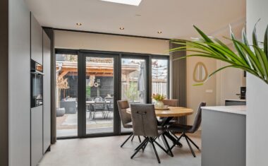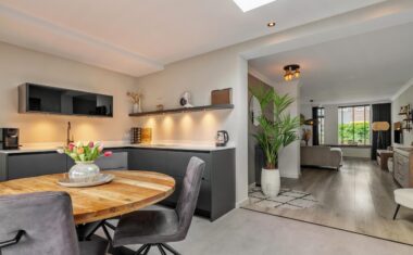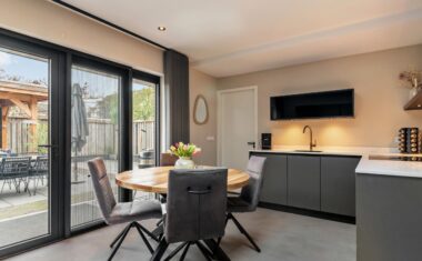Aan de achterzijde bevindt zich de moderne keuken (2022), ingericht in een praktische opstelling en uitgerust met diverse inbouwapparatuur: inductiekookplaat met geïntegreerde afzuiging, koelkast, vaatwasser en combimagnetron. Vanuit de keuken heb je middels openslaande deuren direct toegang tot de achtertuin.