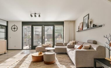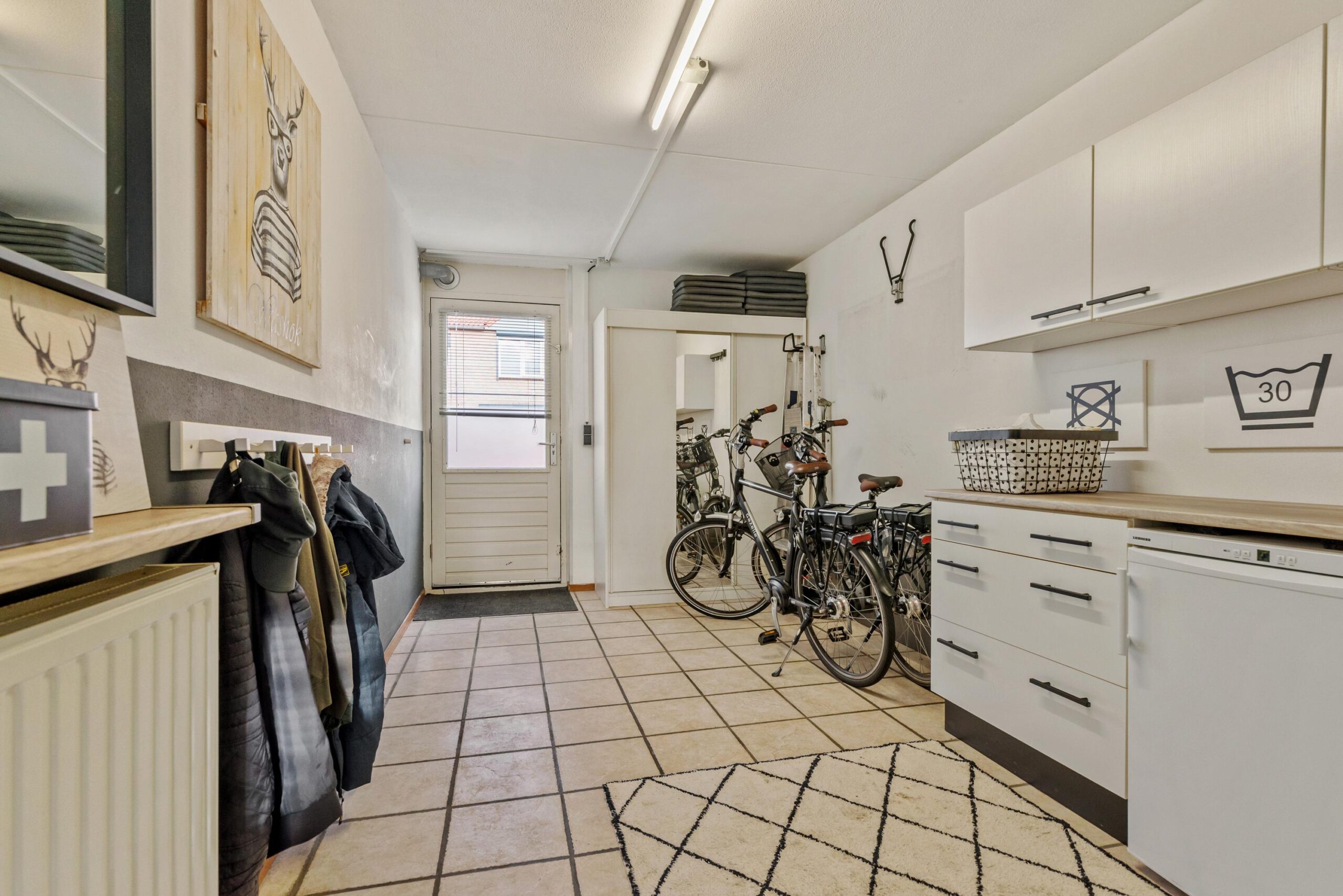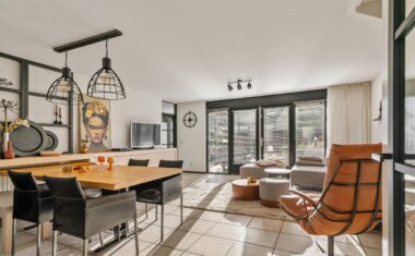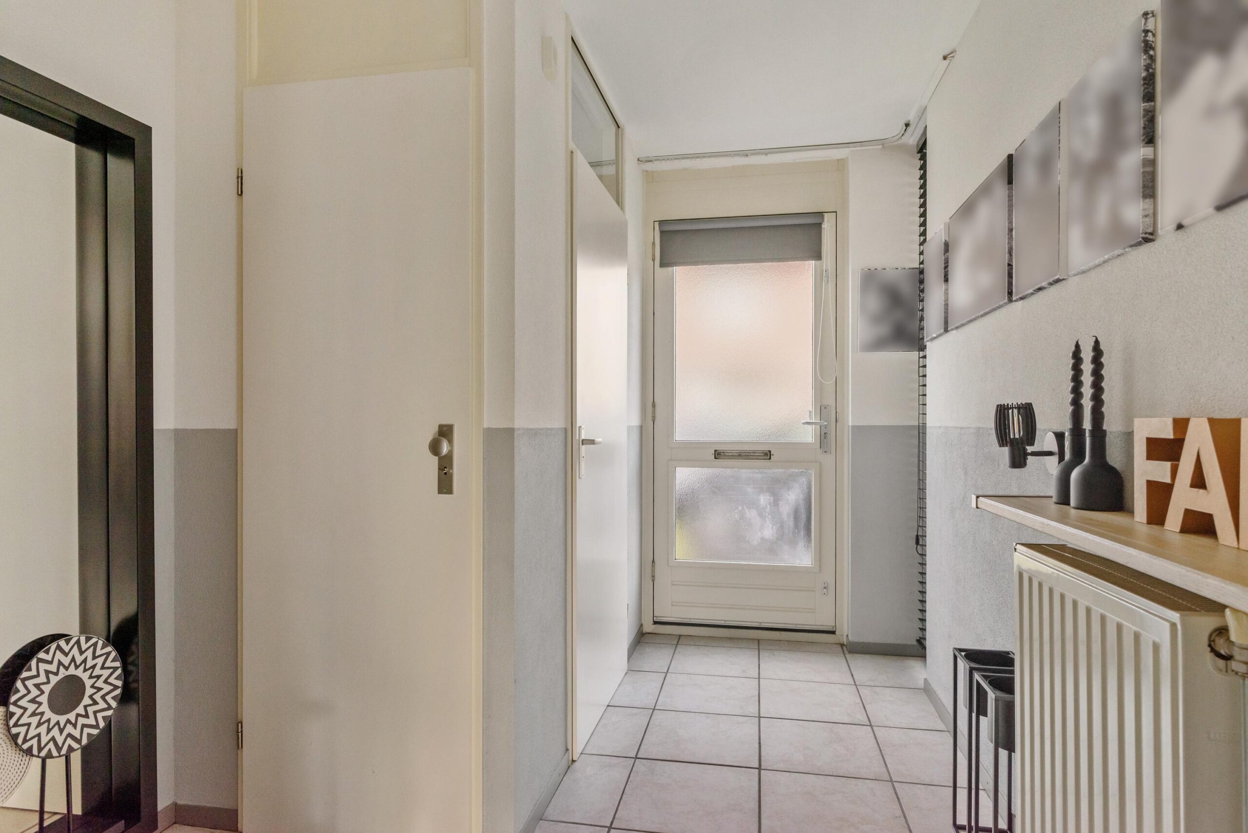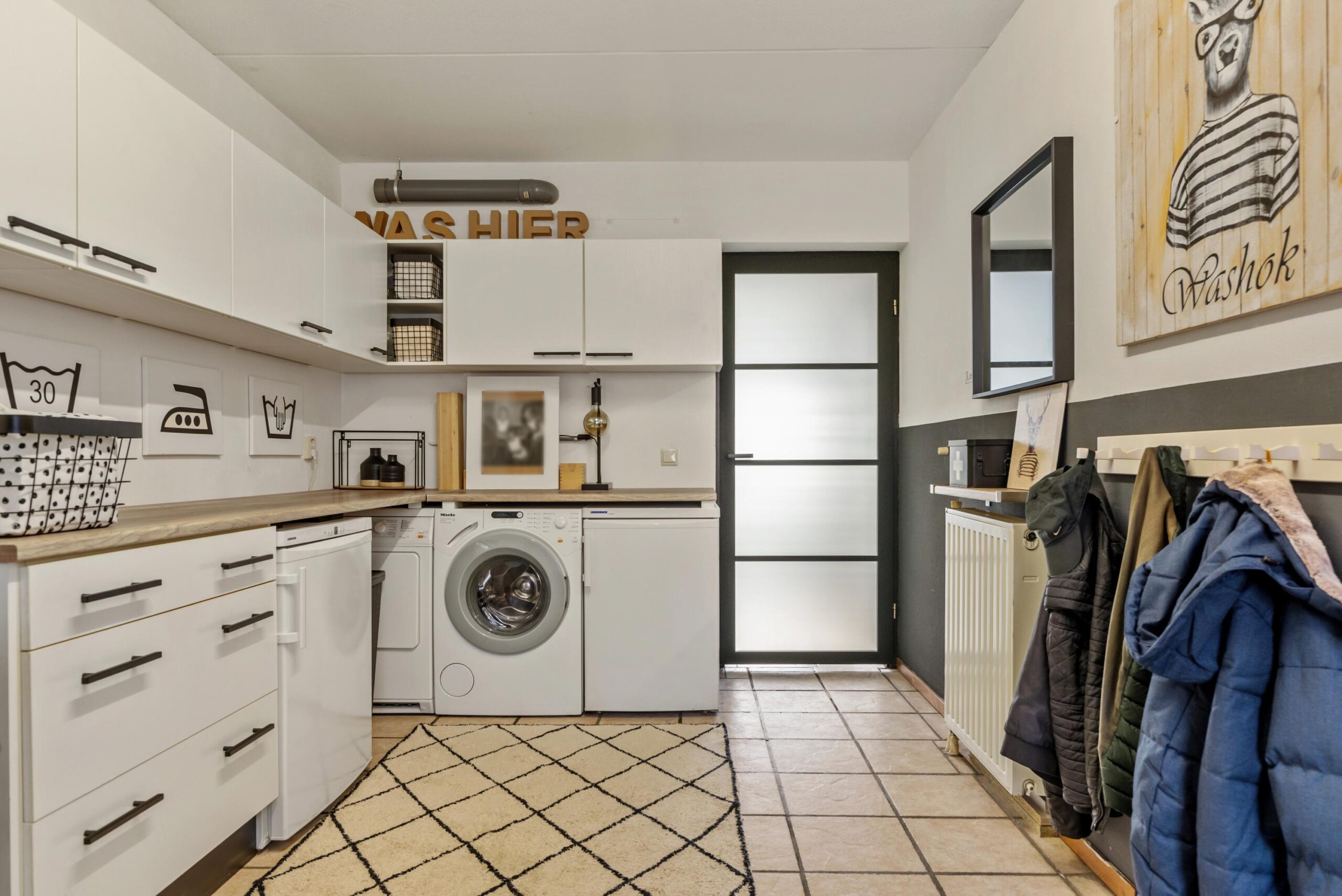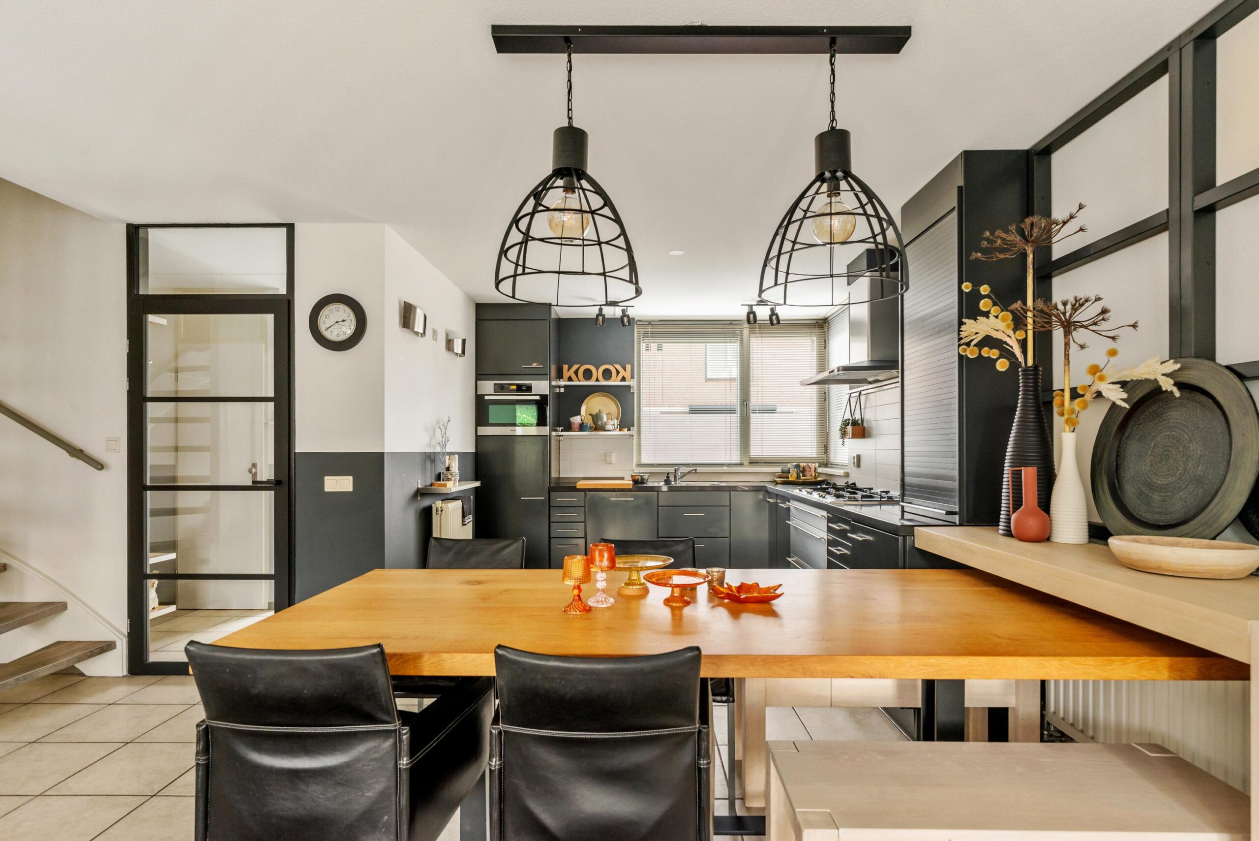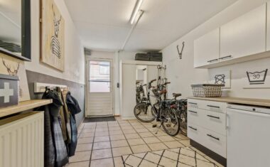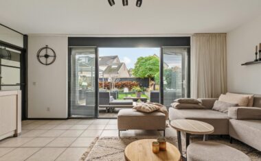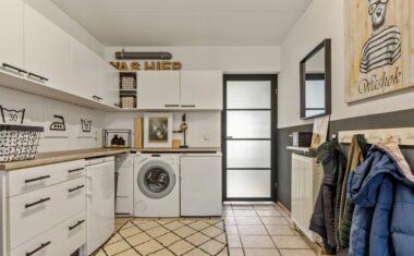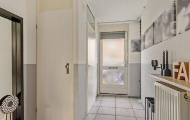 Entree/hal met toilet en meterkast. Vanuit de hal bereik je de lichte woonkamer met open keuken. De grote raampartijen én dubbele tuindeuren zorgen voor veel daglicht en een fijn uitzicht op de achtertuin. De open keuken is praktisch ingericht en is voorzien van een 5-pitsgaskookplaat, afzuigkap, vaatwasser, koelkast en combimagnetron.