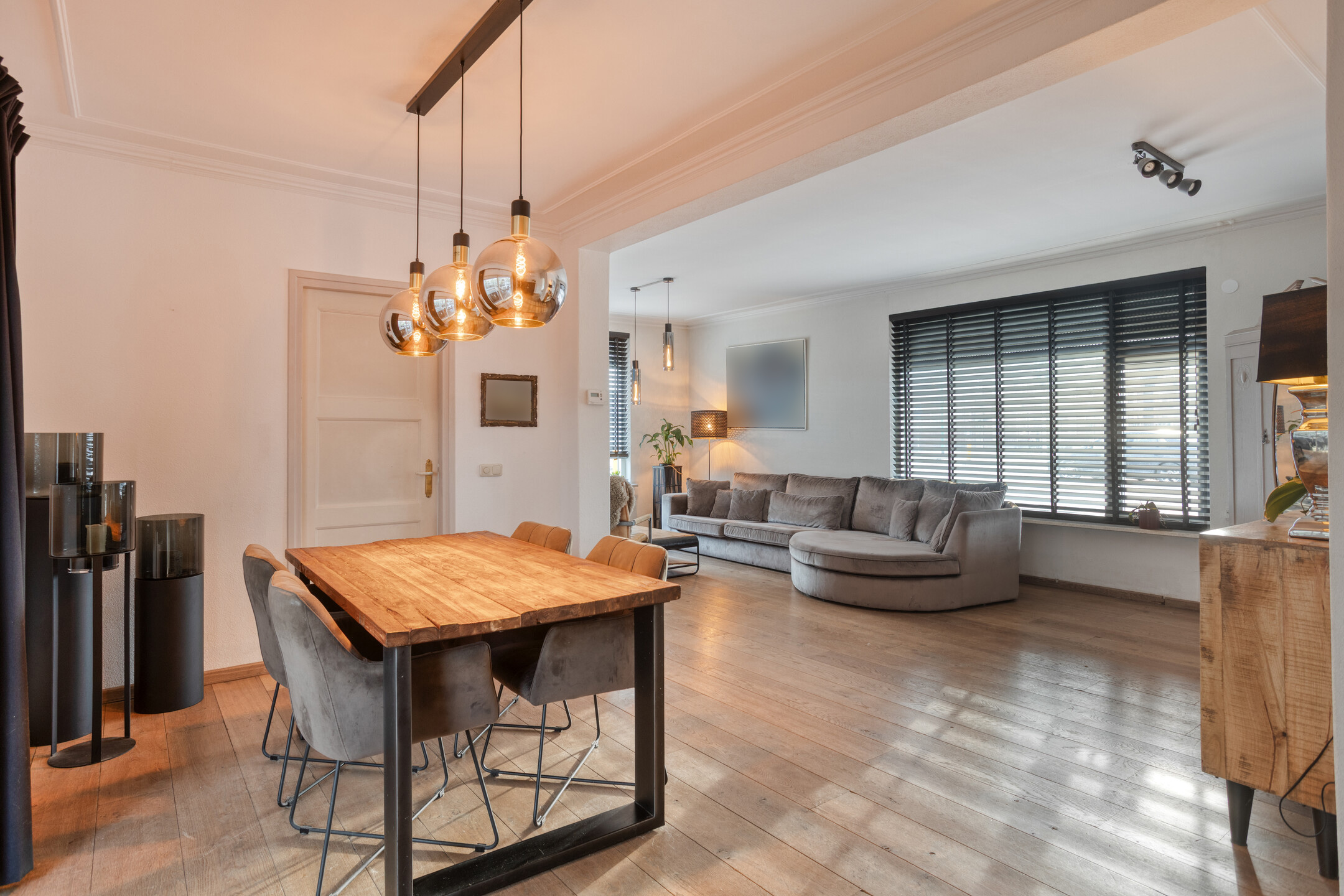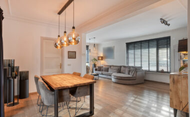 De ruime woonkamer kenmerkt zich door de prettige lichtinval dankzij de grote raampartijen en de schuifpui. Deze schuifpui biedt direct toegang tot de tuin met overdekt terras, waardoor binnen en buiten op een natuurlijke manier in elkaar overlopen.