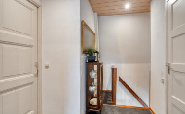 Via de entree kom je in de hal met meterkast en toegang tot keldertje. Vanuit de hal bereik je de trapopgang naar de eerste verdieping en de royale woonkamer.