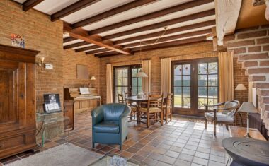 Entree/hal met trapopgang en vide – toilet met fonteintje – garderobe – woonkamer met rookkanaal en openslaande deuren naar het overdekt terras – woonkeuken met originele keuken – bijkeuken met bergkast en deur naar de achtertuin.