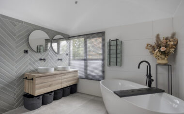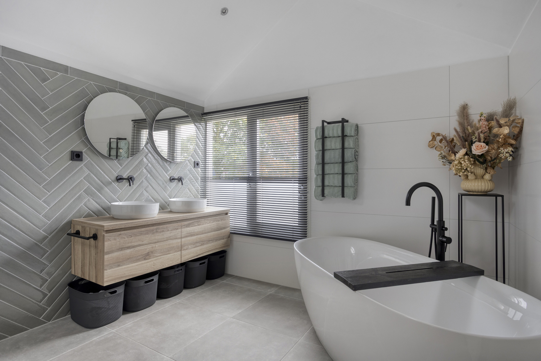 De badkamer (2021) is compleet uitgerust met een ligbad, inloopdouche, toilet en dubbele wastafel – een fijne plek om de dag ontspannen te beginnen of af te sluiten.