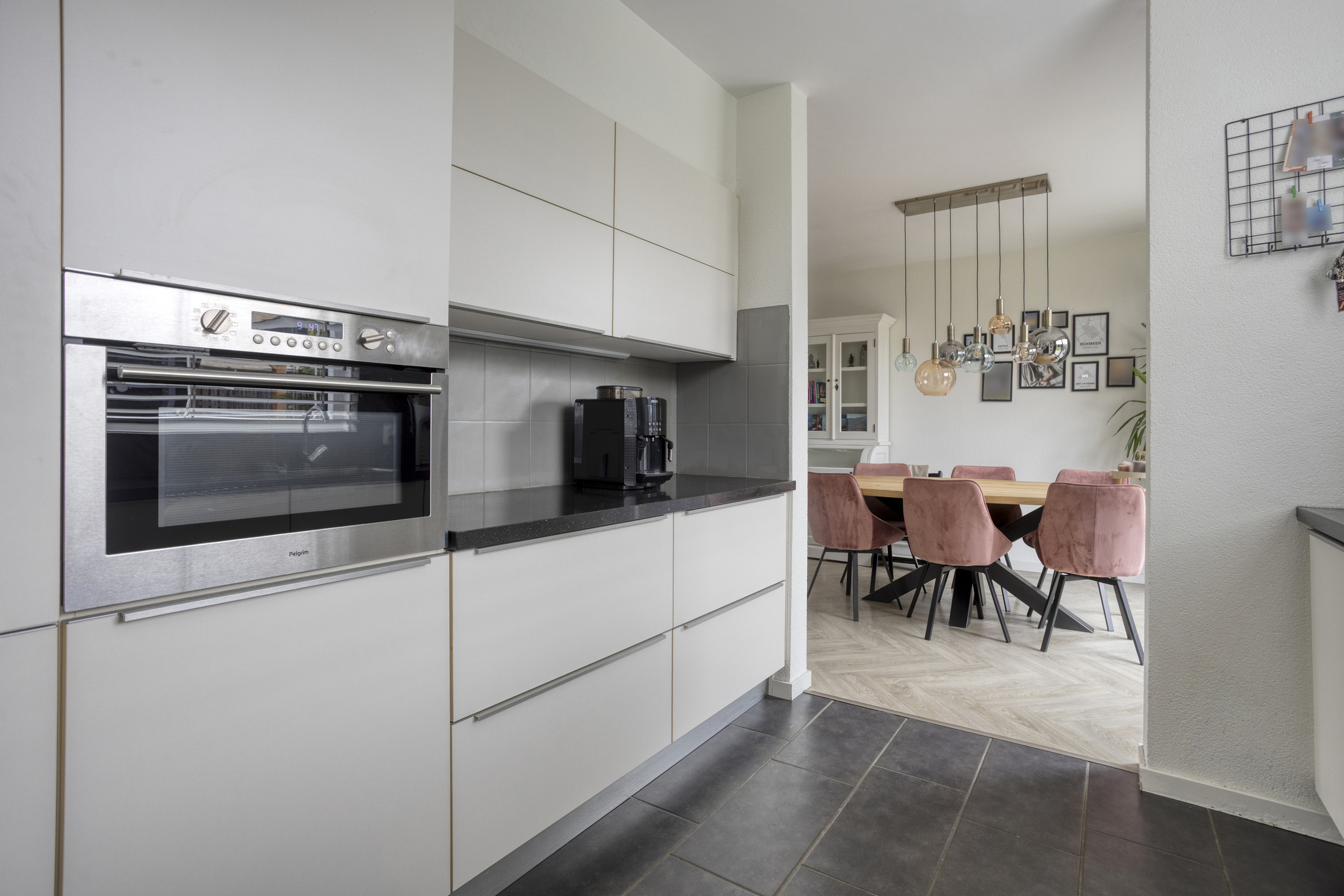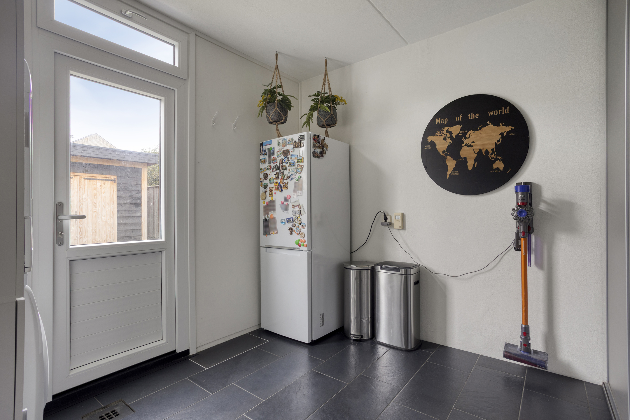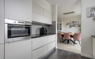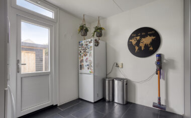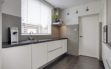De keuken (2017) ligt aan de achterzijde en is voorzien van een diverse inbouwapparatuur. Vanuit de keuken is er directe toegang tot de bijkeuken, waar extra kastruimte en aansluitingen voor witgoed aanwezig zijn. De bijkeuken geeft toegang tot zowel de garage als de achtertuin – ideaal voor gezinnen of hobbyisten die graag extra bergruimte willen.