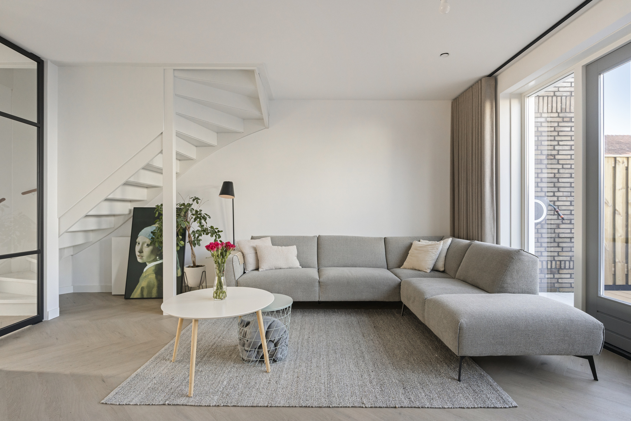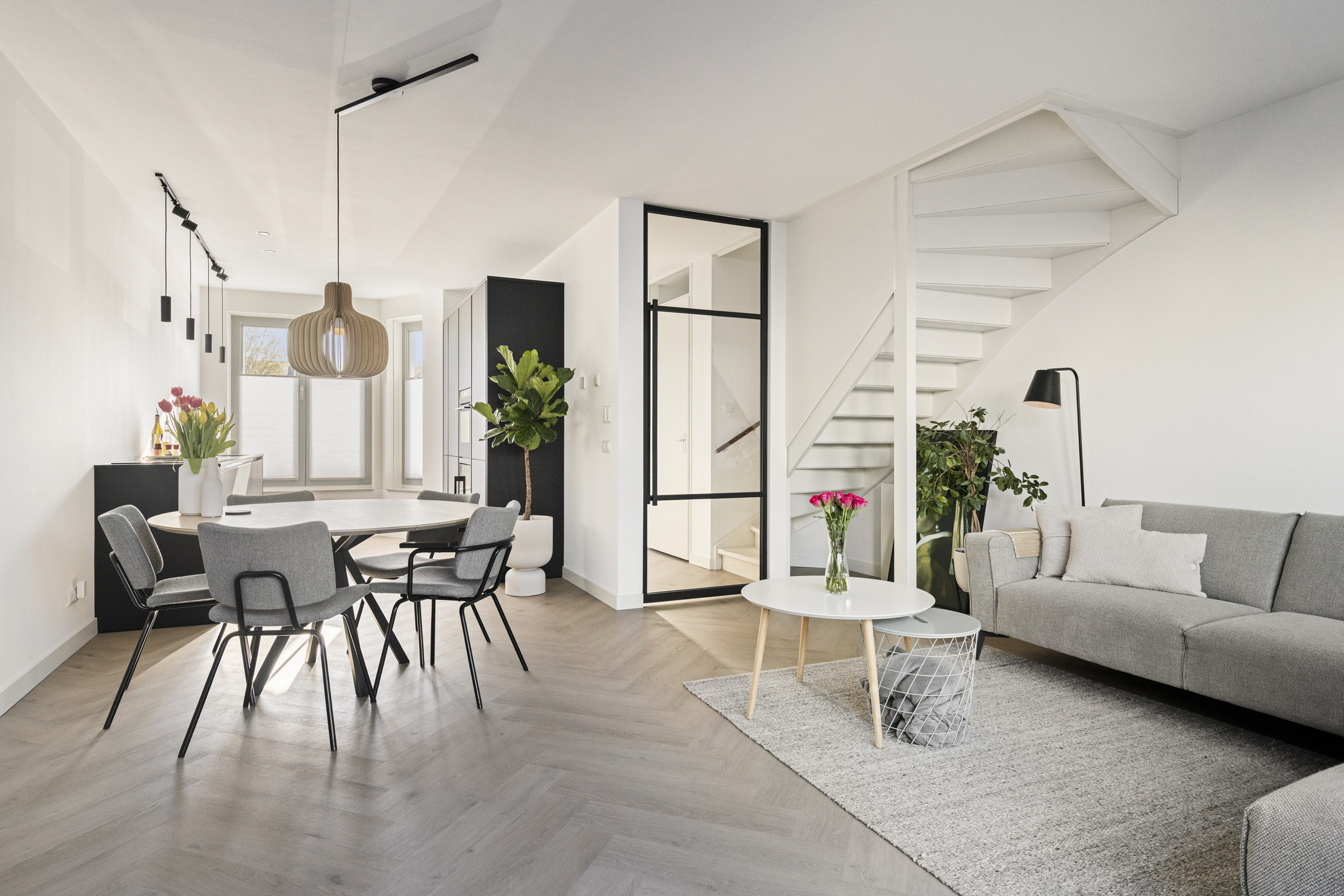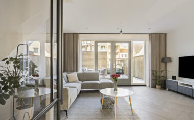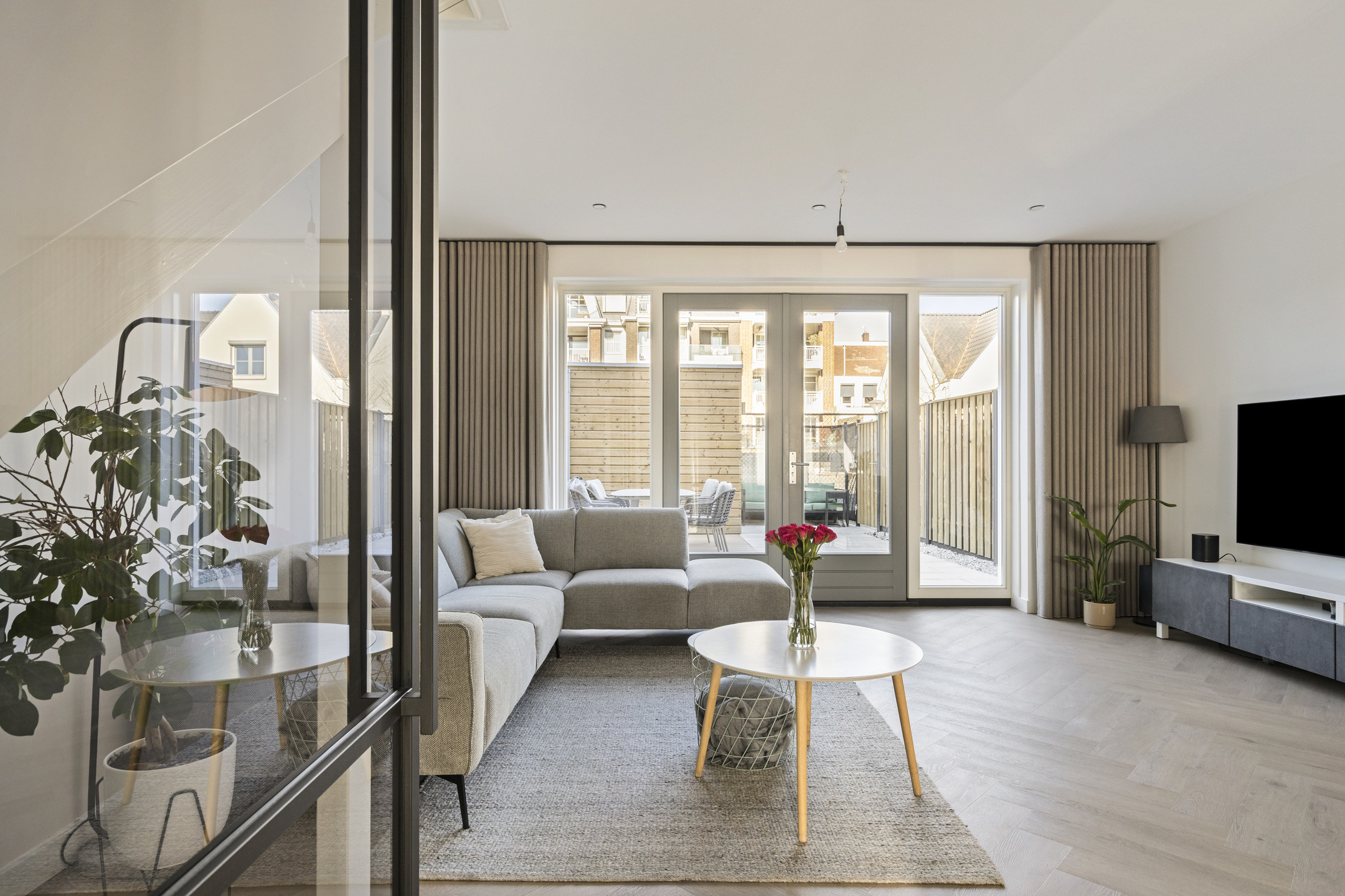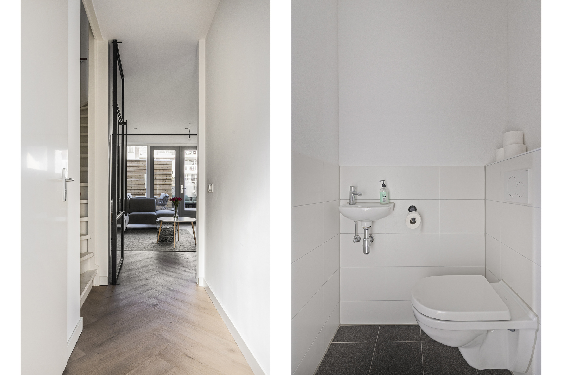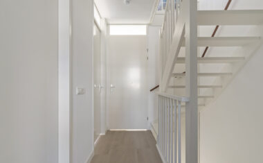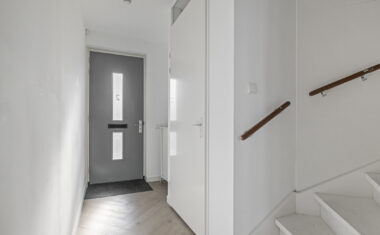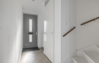 Via de voordeur kom je binnen in de entree met meterkast, toiletruimte en trapopgang naar de eerste verdieping. Vanuit de hal heb je toegang tot de leefruimte. De woonkamer bevindt zich aan de achterzijde van de woning en beschikt over grote raampartijen en openslaande tuindeuren, wat zorgt voor veel daglicht en een prettige verbinding met buiten.