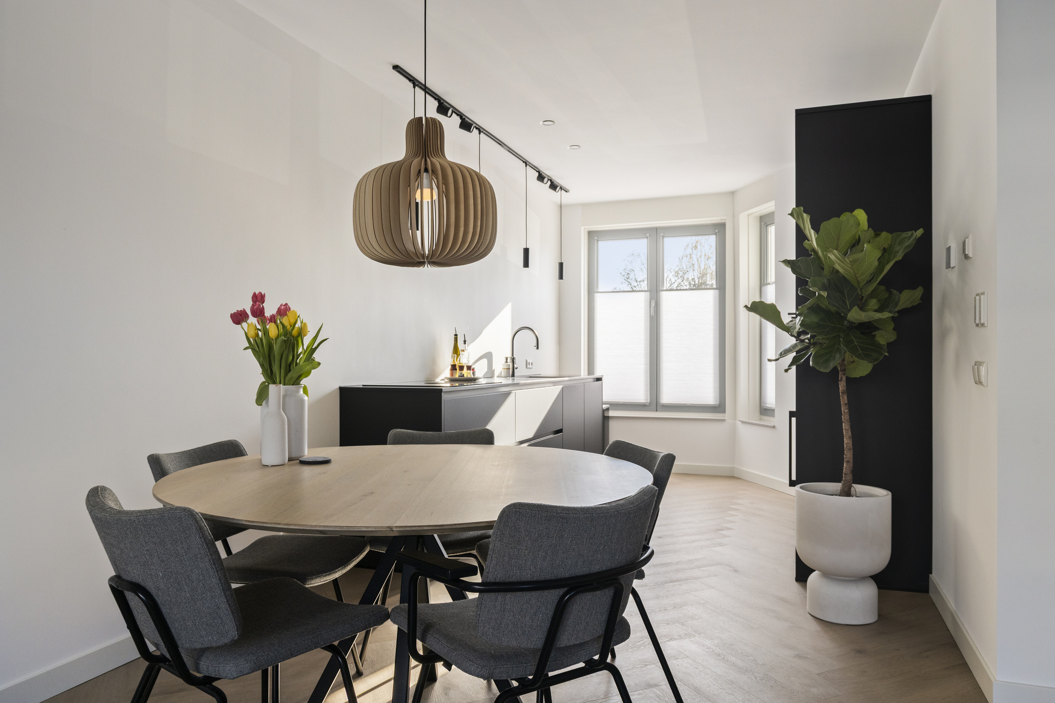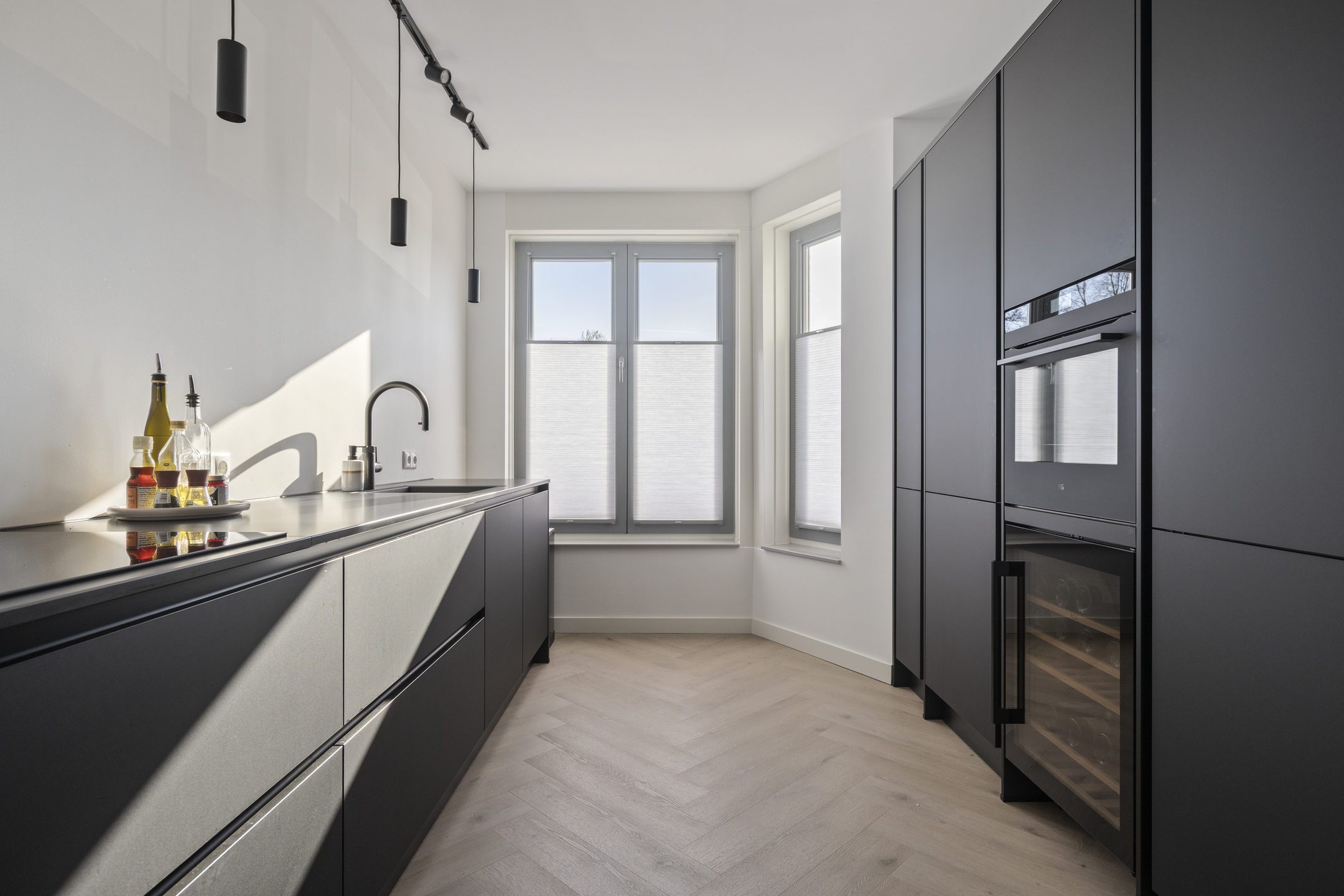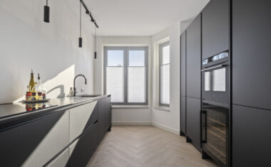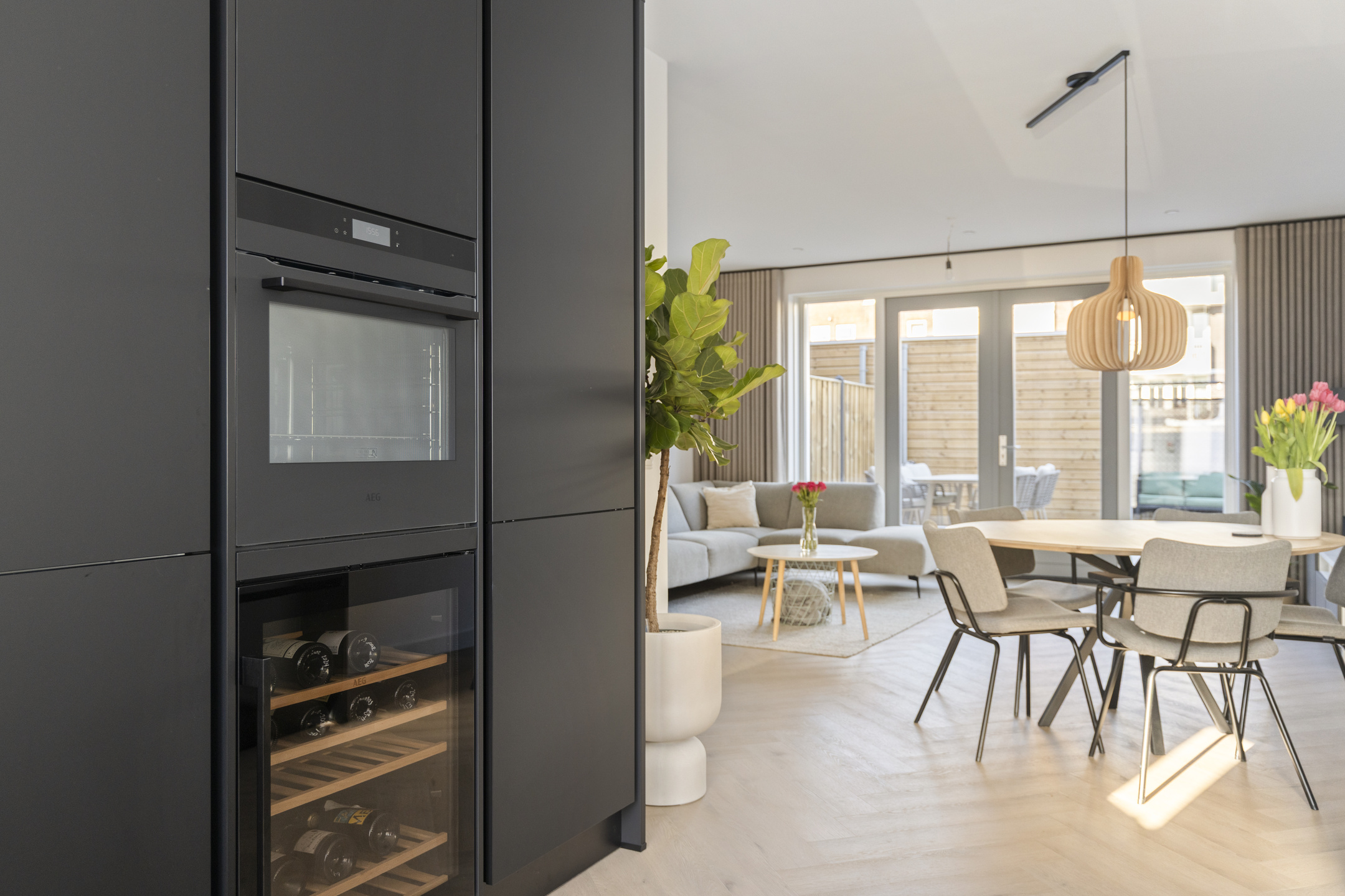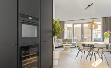 Aan de voorzijde is de open keuken gesitueerd. De keuken is voorzien van diverse inbouwapparatuur zoals inductiekookplaat, vaatwasser, Quooker, koelkast en oven. Daarnaast beschikt de keuken over een wijnkoeler. Door de open verbinding met de woonkamer ontstaat een ruime en praktische leefruimte.