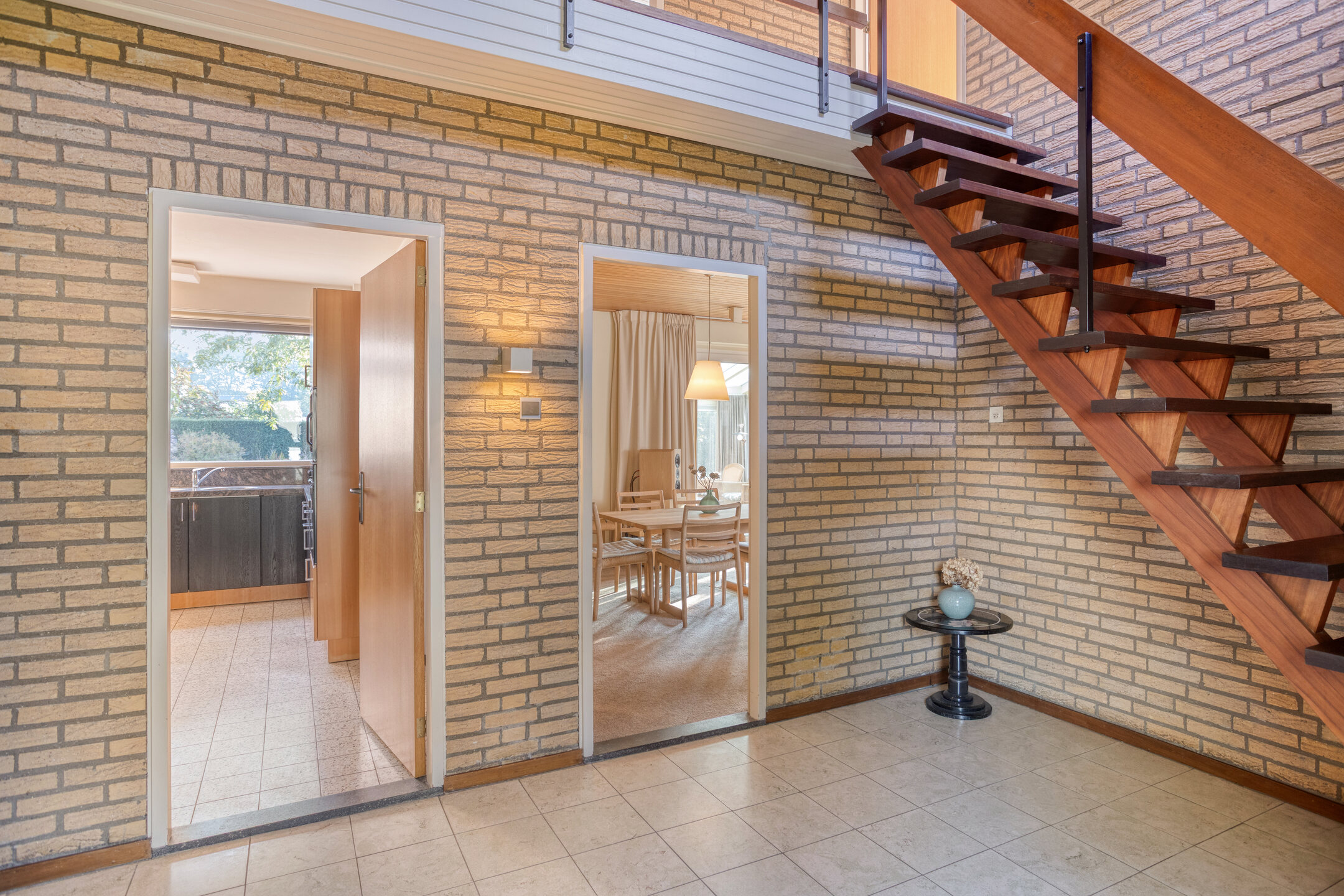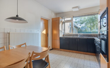 Aansluitend aan de keuken bevindt zich een praktische bijkeuken met extra kastruimte en directe toegang tot zowel de inpandige garage als de achtertuin. Ideaal voor bijvoorbeeld het stallen van fietsen, voorraad of wasapparatuur.