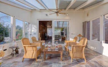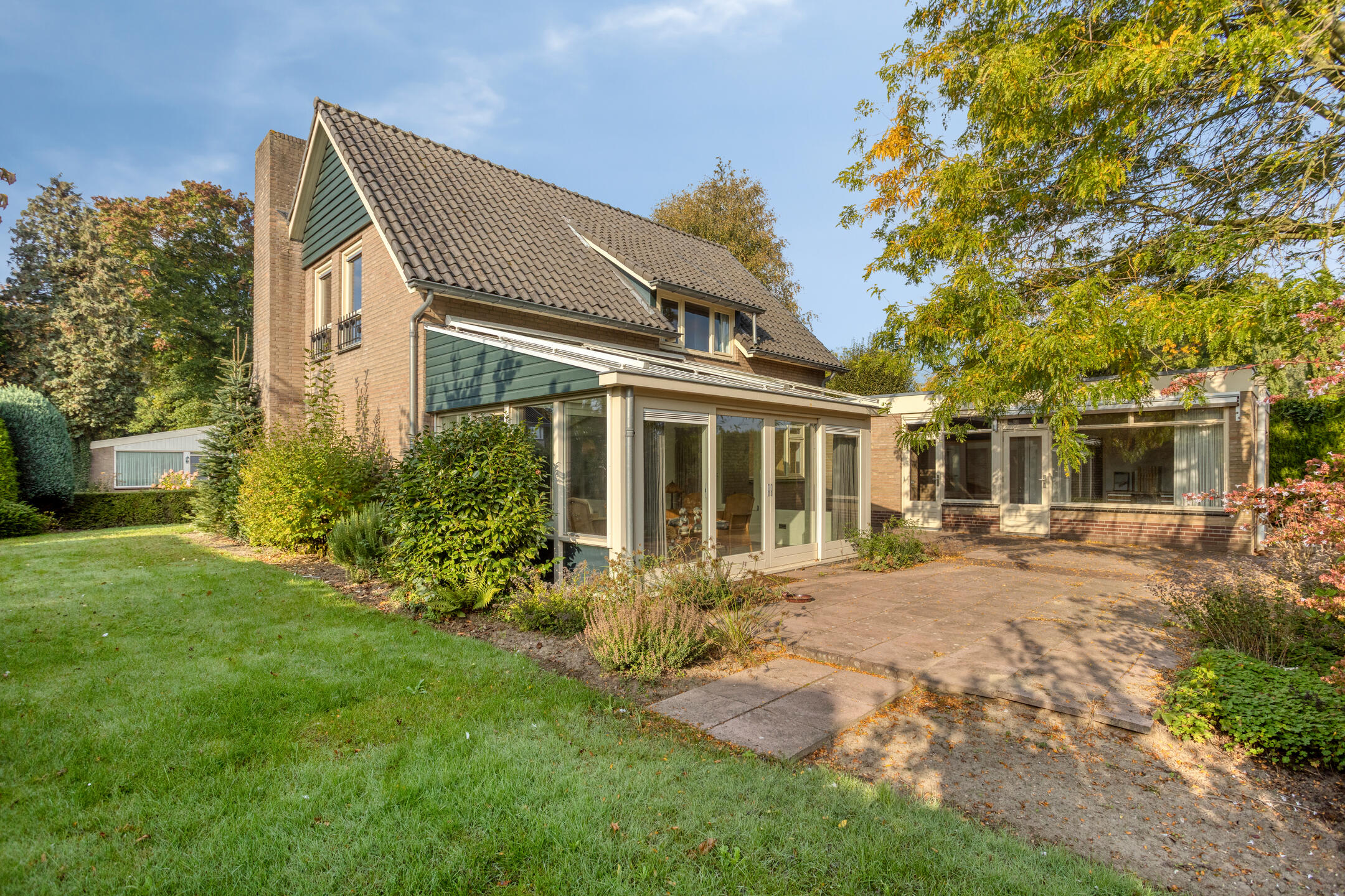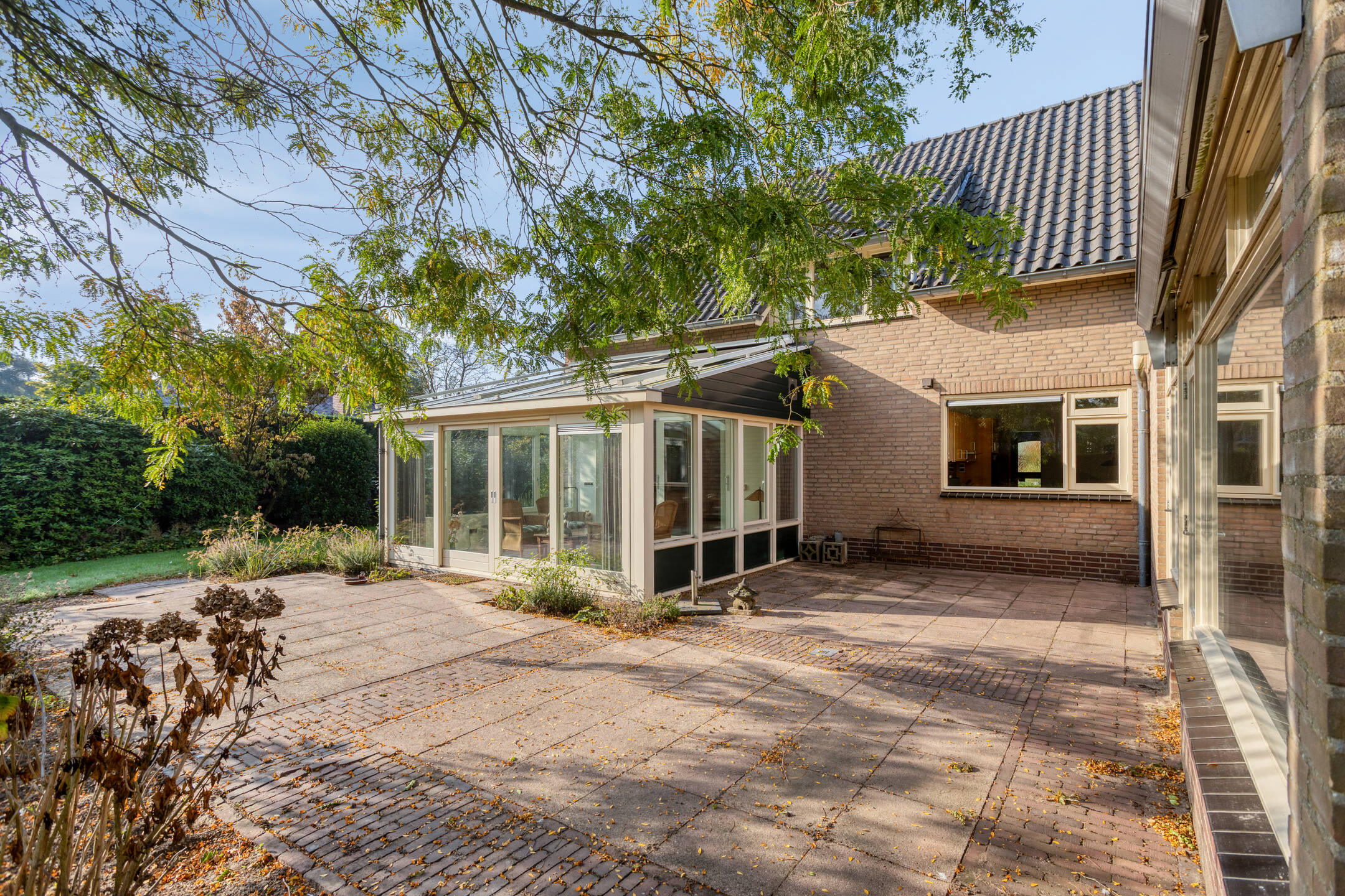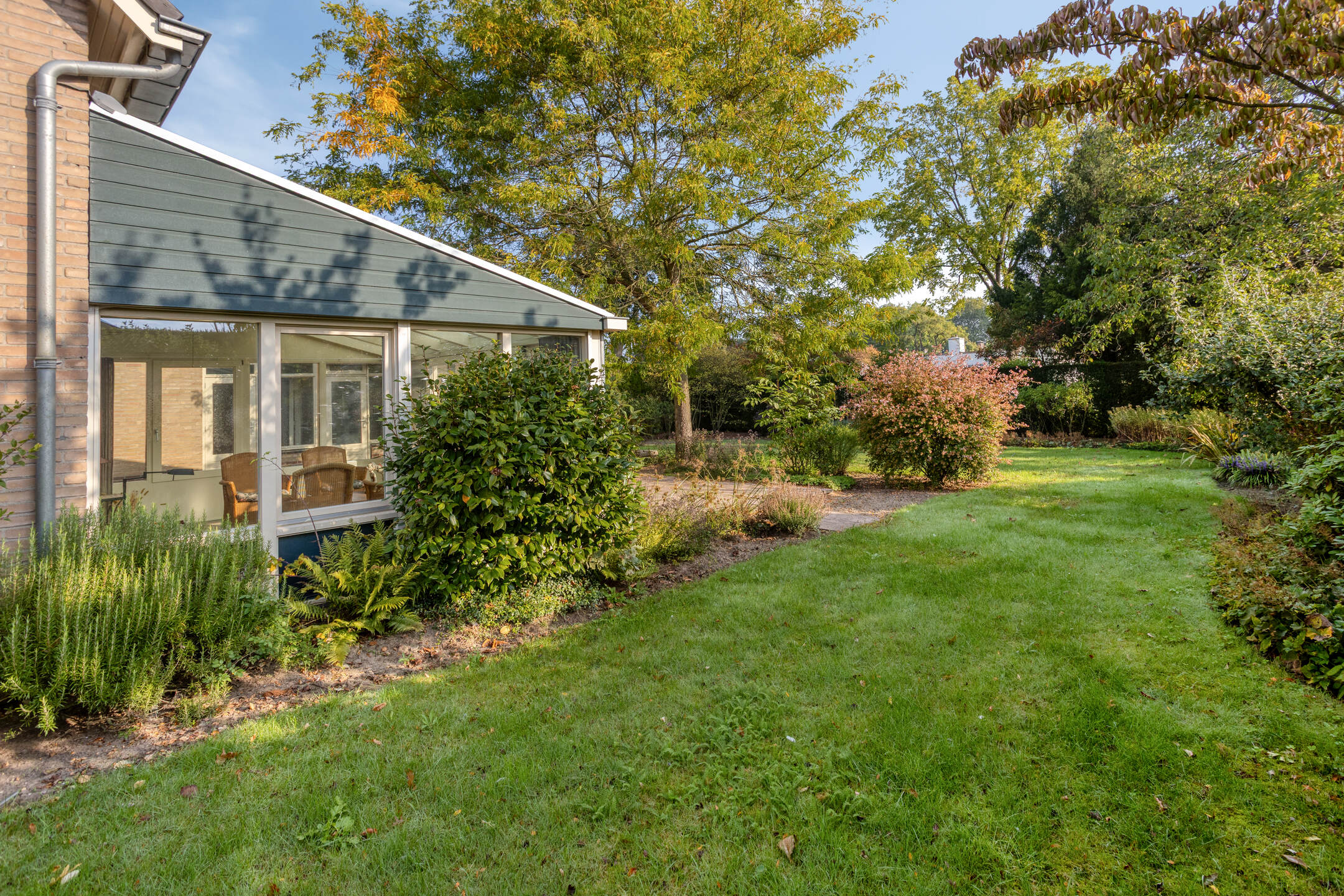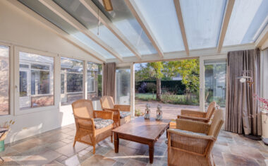 De serre, uitgevoerd in hardhout en voorzien van vloerverwarming, is een heerlijke plek om het hele jaar door te genieten van de tuin. Door de vele raampartijen en de directe verbinding vanuit de woonkamer met de tuin krijg je hier het echte “binnen-buitengevoel”.